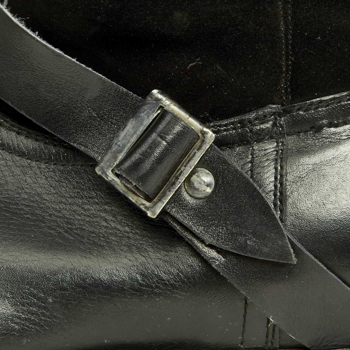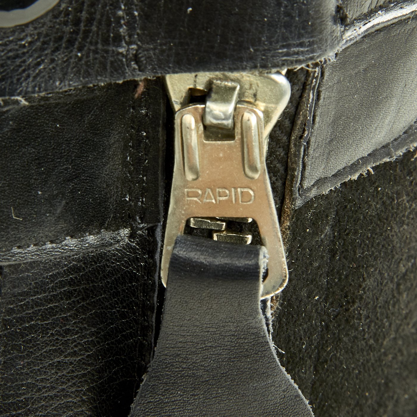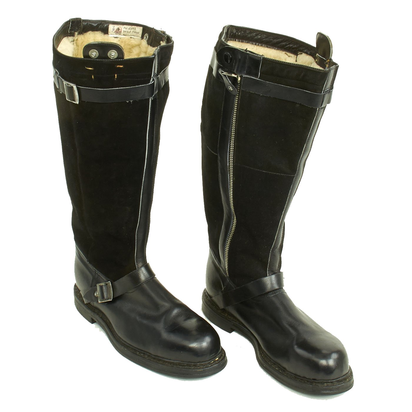 These 24 volt electrically heated boots are the same pattern as the standard single zip flying boot but feature a heating element in the foot section. The boots were connected via the small press studded tab at the top to corresponding tabs on the flying suit or trousers. These are of late-war construction, the suede upper panels being of generally even color and the buckles and zips zinc plated steel. Later boots such as these feature an increased number of panels and plastic zips.