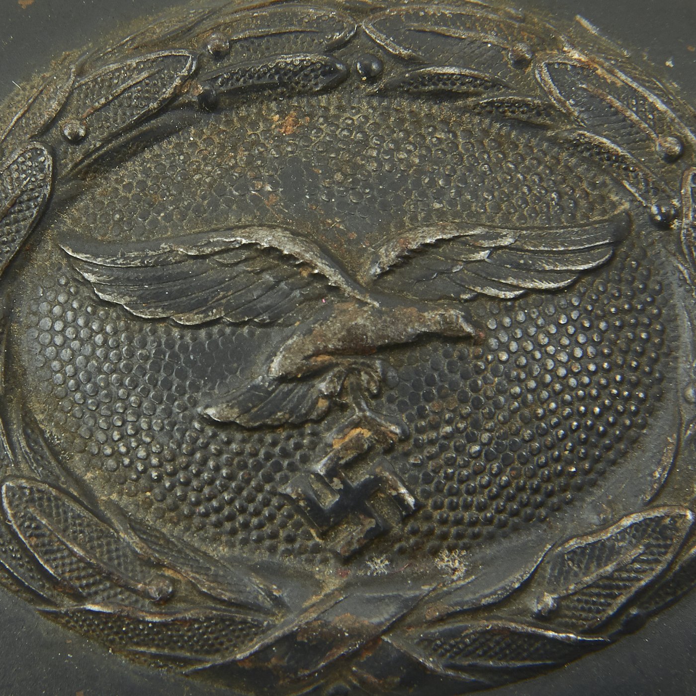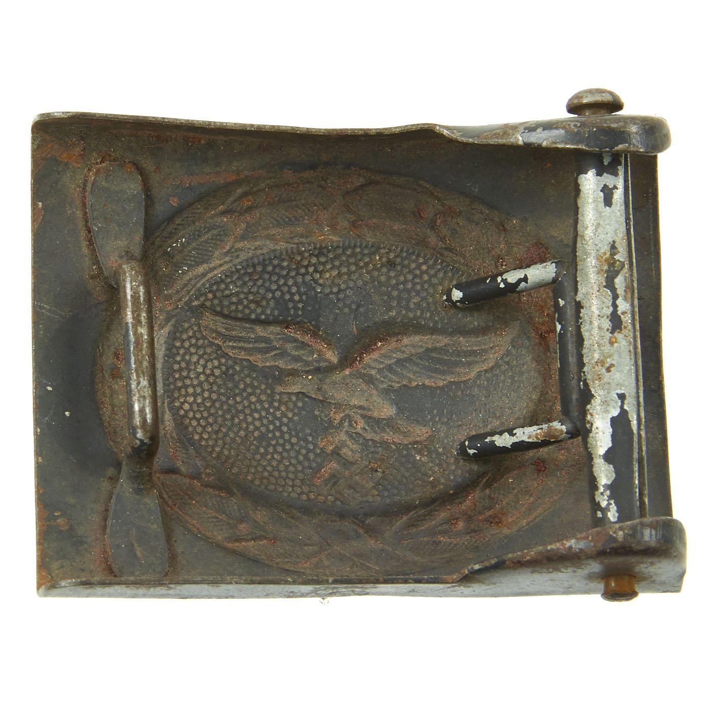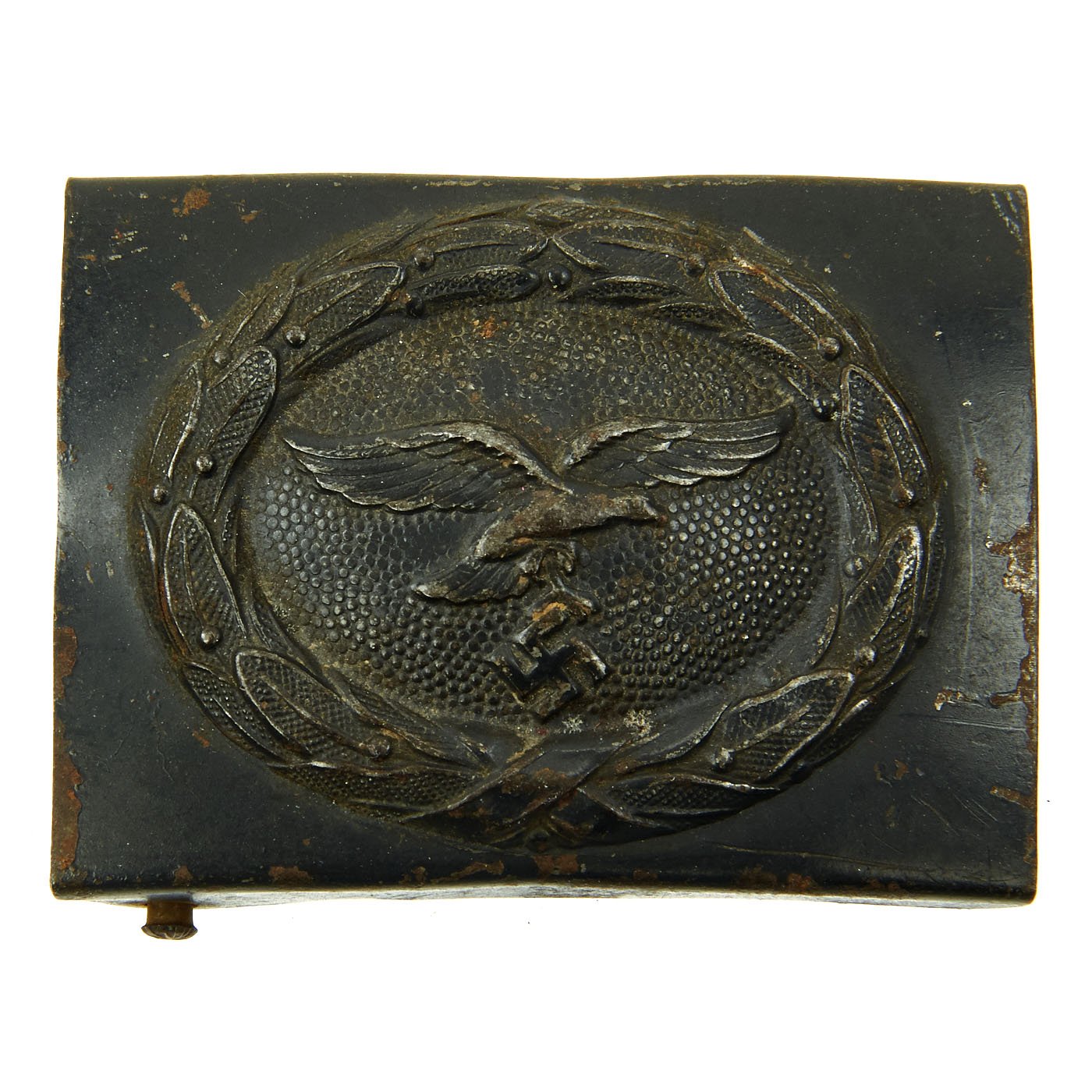 Original Item: Only One Available. This is a very nice service worn WWII German Wehrmacht Luftwaffe (Air Force) EM (enlisted man) or NCO (Non-Commissioned Officer) Belt Buckle (Koppelschloß). It is embossed with the wartime Luftwaffe straight tail eagle on a pebbled central field, surrounded by a wreath. The rear of the buckle is unmarked, which was not uncommon. The buckle is of 1940 pattern, die stamped, steel construction, with a dark Luftwaffe blue grey painted finish, which is still present on more than 80% of the buckle.