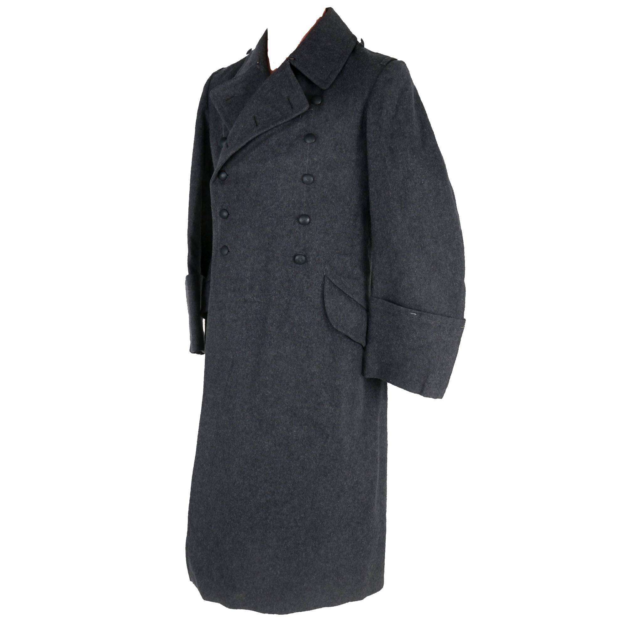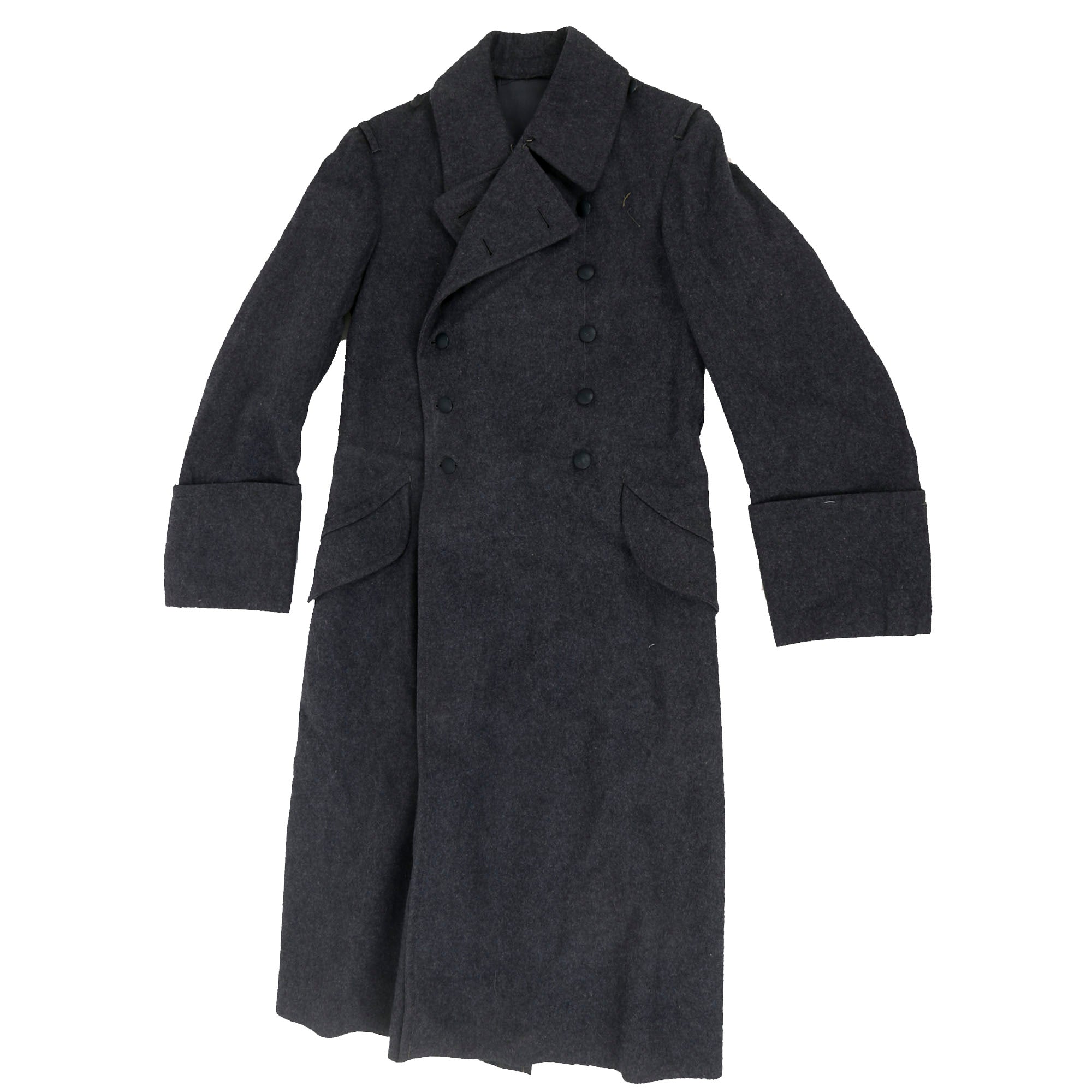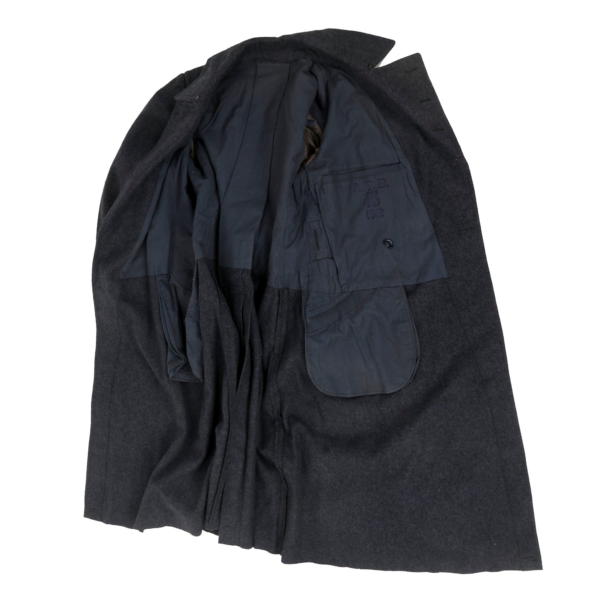 Original Item: Only One Available. This is a lovely WWII manufactured Luftwaffe greatcoat for a Luftwaffe Enlisted Man or Non-Commissioned Officer (NCO). It is offered in very good condition and constructed of Luftwaffe fliegerblau (flyer's blue) blue grey wool with a lightweight canvas lining in the same color. It features two flap covered waist pockets and the classic double-breasted front closure, with 5 buttons on each side. All of the buttons are non-magnetic, and look to be made possibly from zinc alloy. They are painted Luftwaffe blue, and all look to be maker marked on the back.