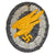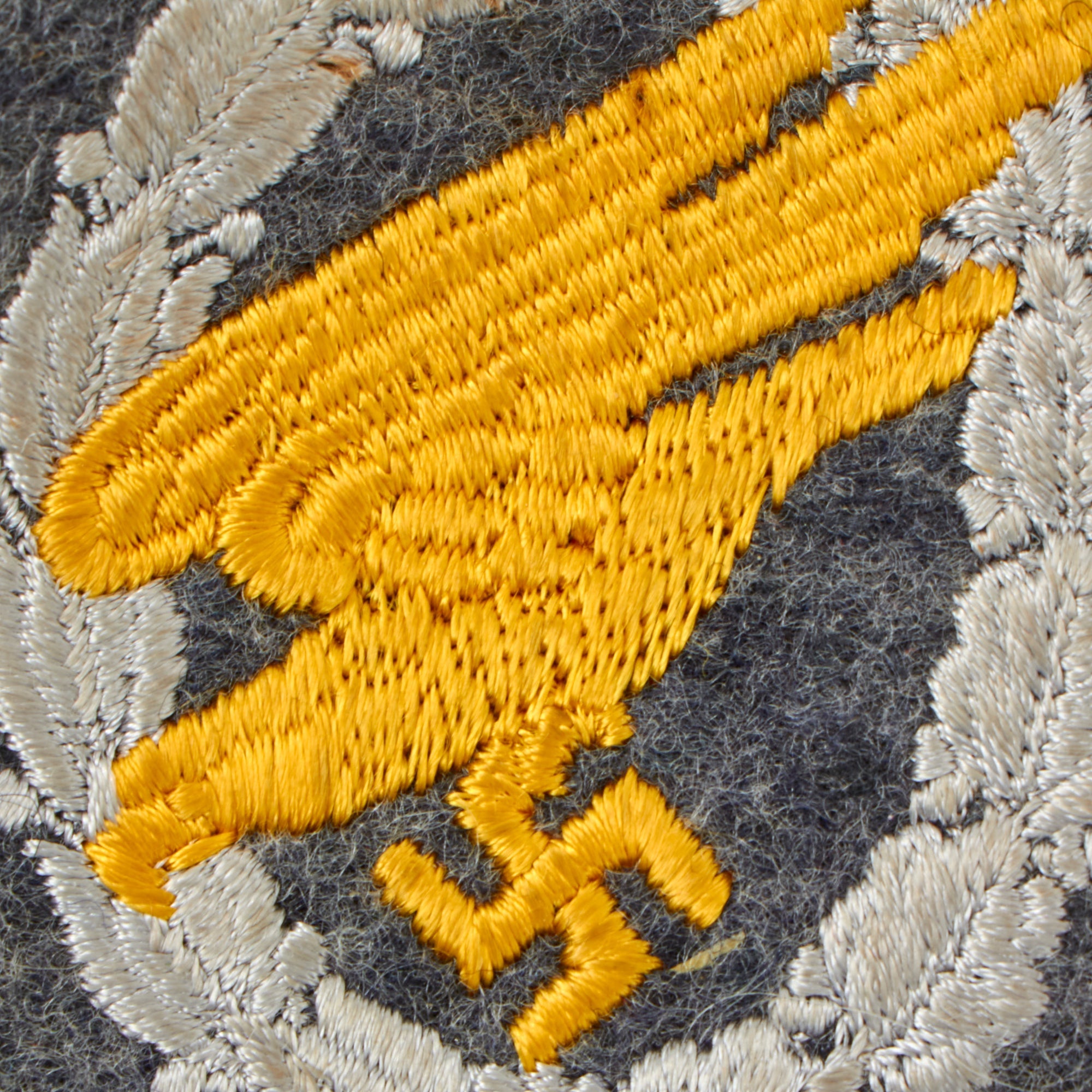 This is a great example of the Luftwaffe jacket version, made of blue-gray wool with gold and silver embroidery. The badge measures 2 3/8"H x 2"W, and is in very good condition. It has no moth damage that we can see, and looks to be unissued, never having been attached to a uniform. The colors are still mostly bright, though there is a bit of staining on the more raised areas of the embroidery at the top, most likely from storage. This badge will make a colorful addition to any collection.