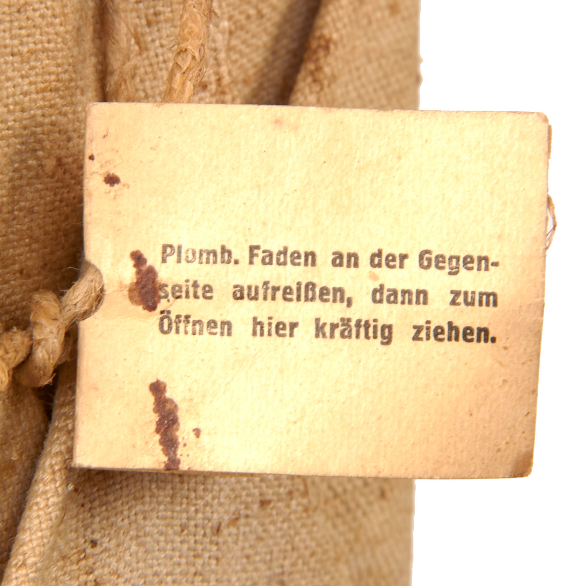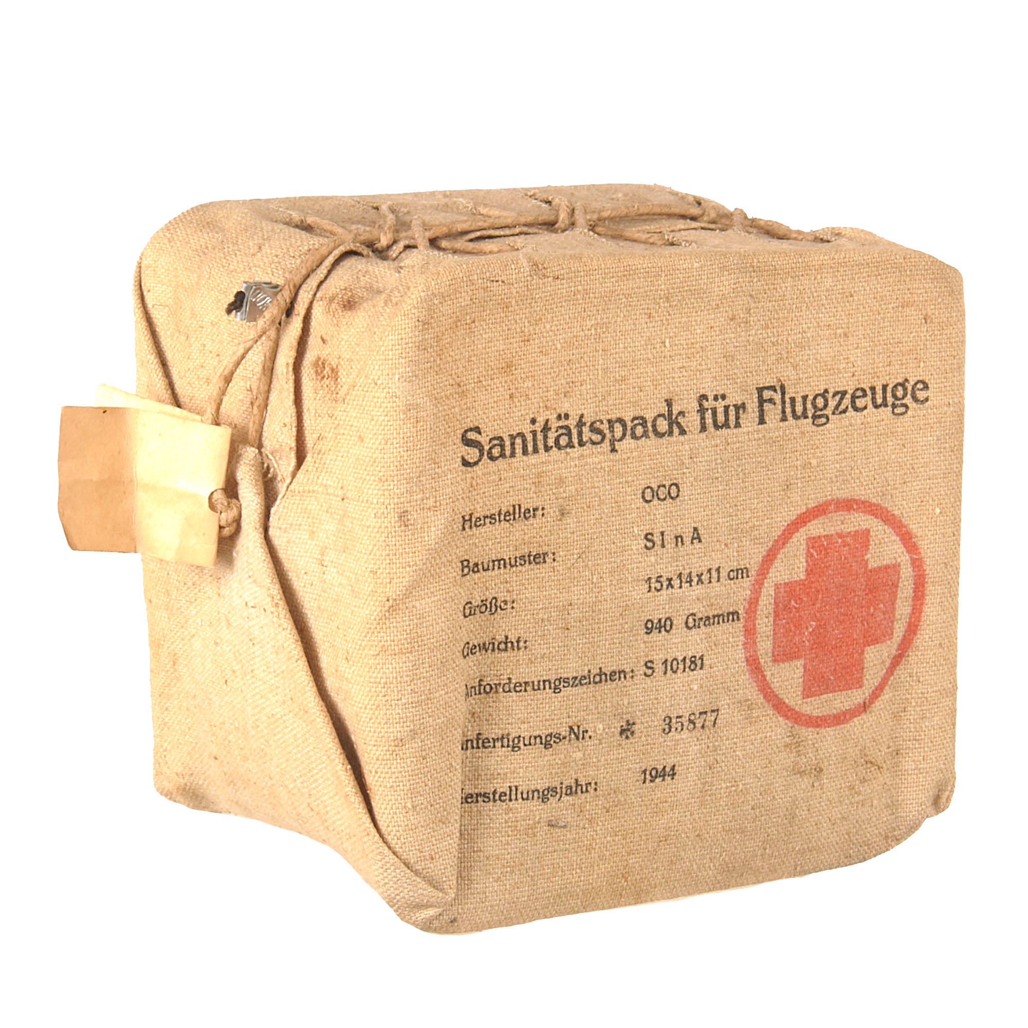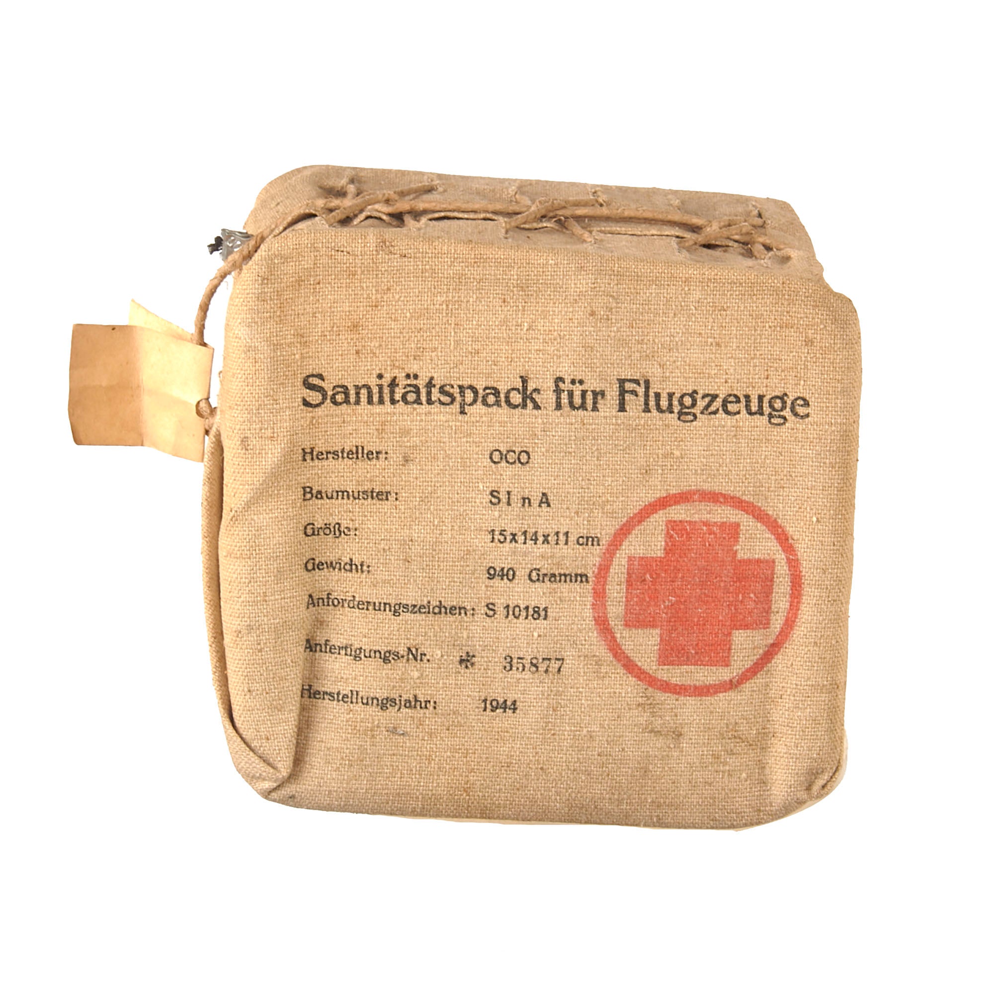 Original Item. Only One Available. This is an unbelievably scarce piece that we couldn’t find many other examples of. This is a sealed and untouched Sanitätstasche für Flugzeuge, or First Aid Bag for Aircraft, meant to be used by the flight crew in the event of a medical emergency. The top of the pack still retains the Red Cross marking and its manufacture information, reading: