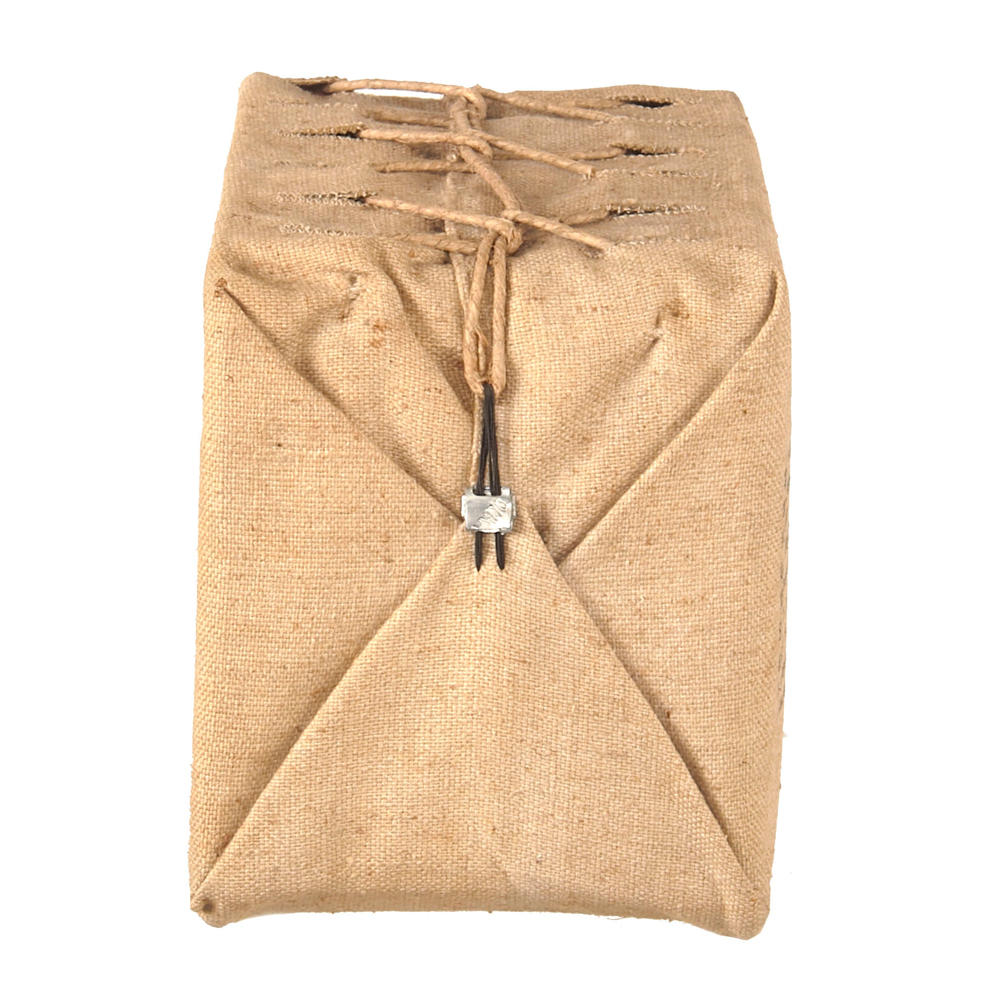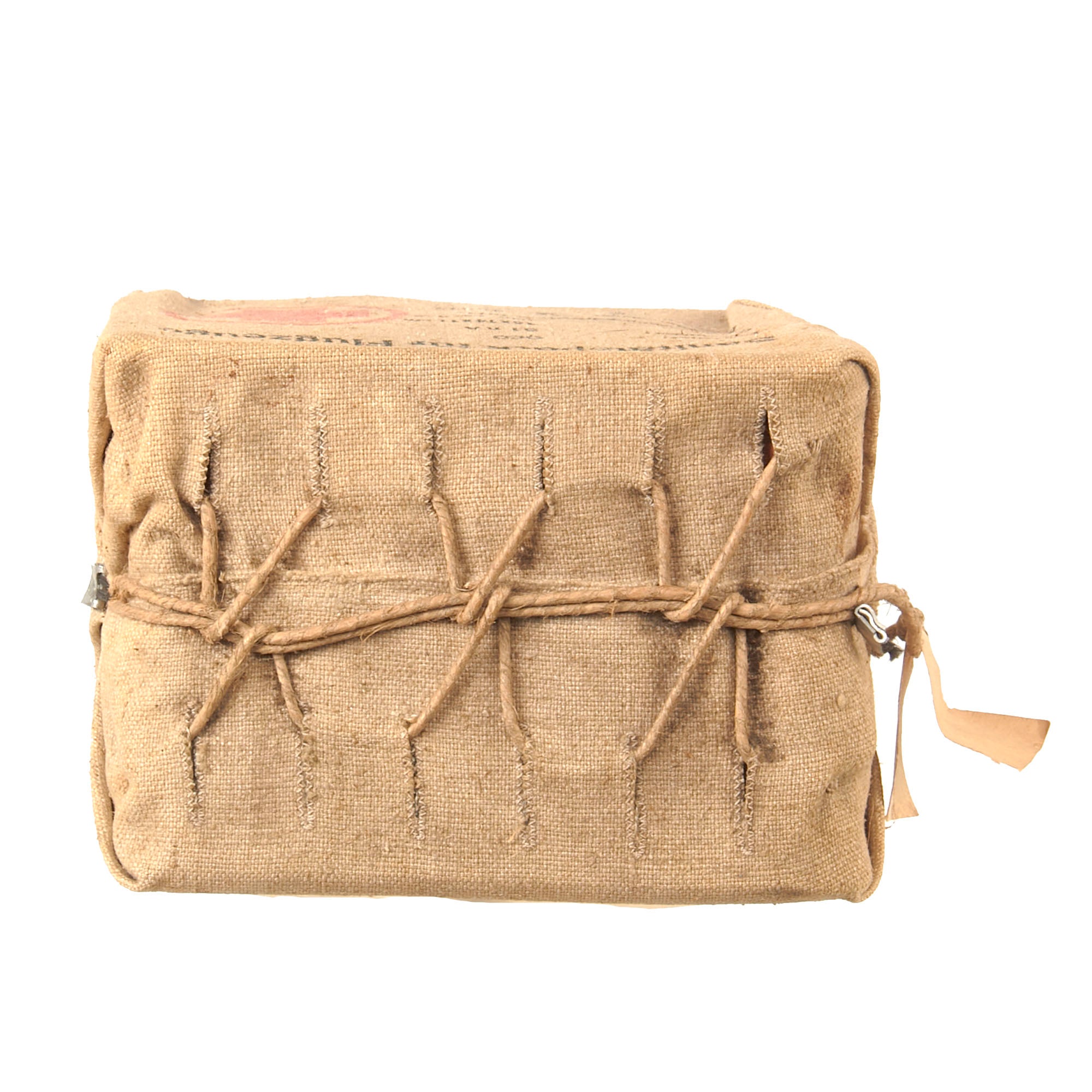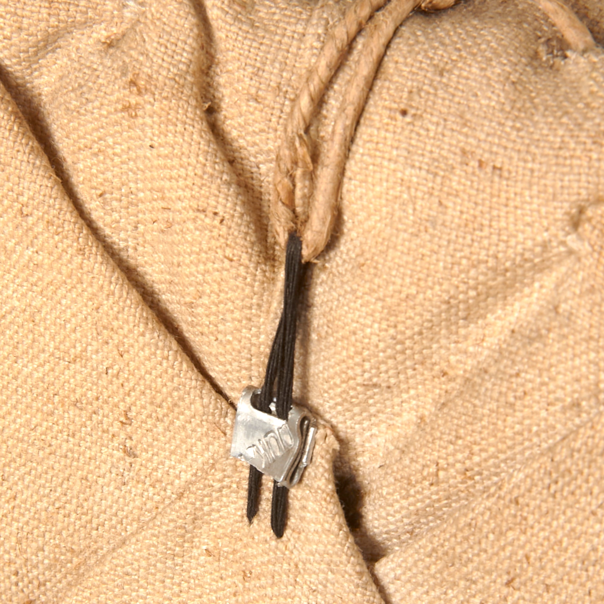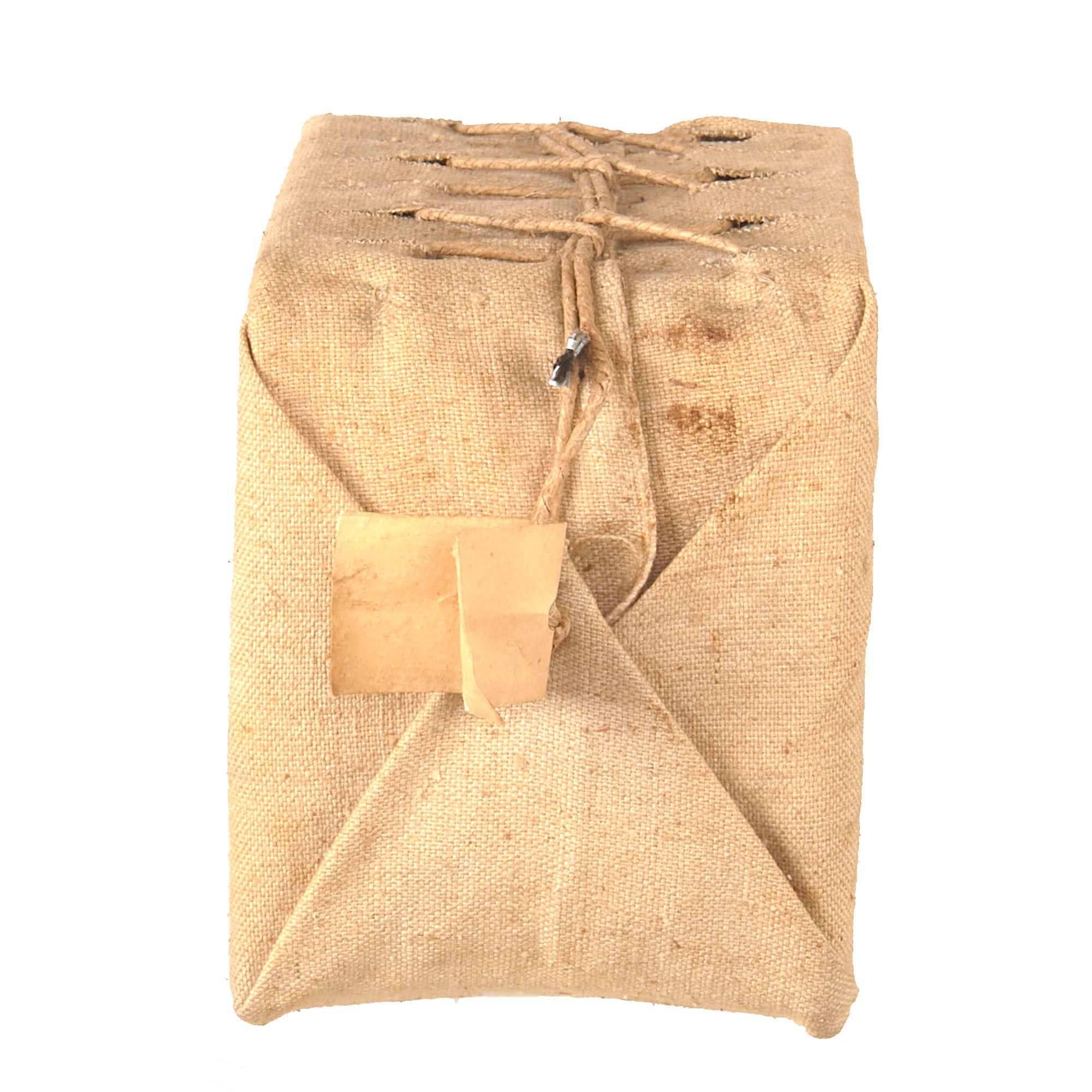 The pack is still entirely sealed with the rope looped through the small slits in the cover, tied off at the end with a small metal “seal”. Attached to the rope is the original tag translating to TEAR OPEN THE THREAD ON THE OPPOSITE SIDE, THEN PULL FIRMLY TO OPEN. We’ve never seen another example of this pack, but we are confident in saying that this is one of the most well-preserved examples out there.