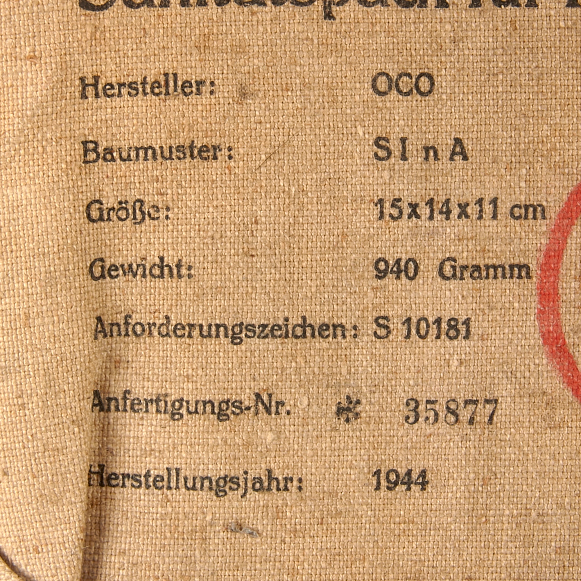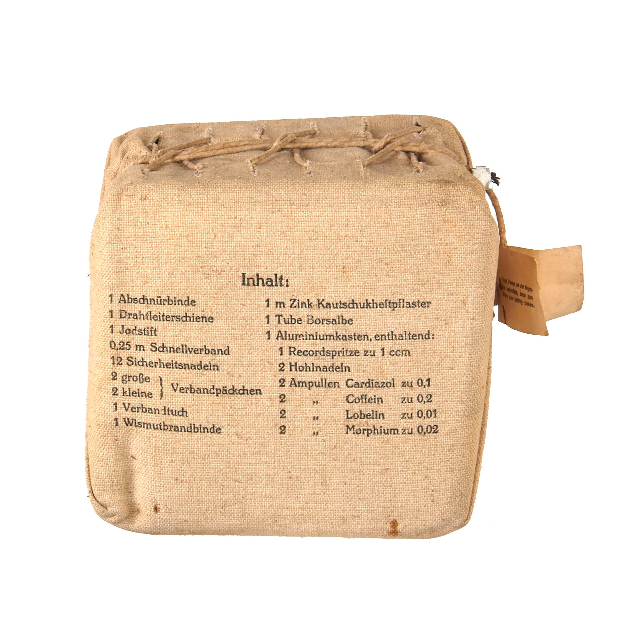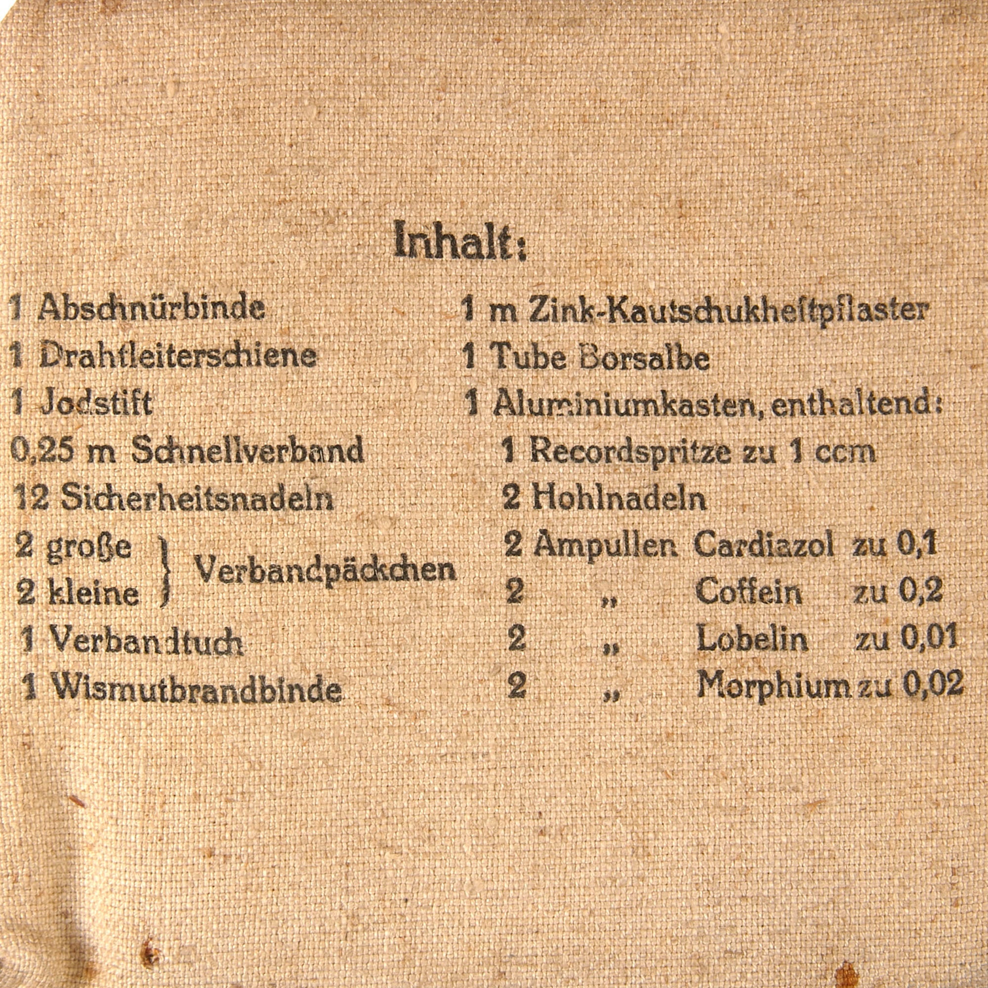 The bottom of the pack retains the “Inhalt” or Content information, which includes one Stringer, wire conductor rail, iodine pencil, quick connection bandage, 12 safety pins, 4 bandage packs, one Wismoth Brandy, 1 meter of zinc rubber plasters, one tube of bor salve, one aluminum case containing 1 record syringe, 2 hollow needles, 2 ampoules of Cardiazide, 2 ampules of caffein, 2 ampules of Lobelin, and 2 ampules..