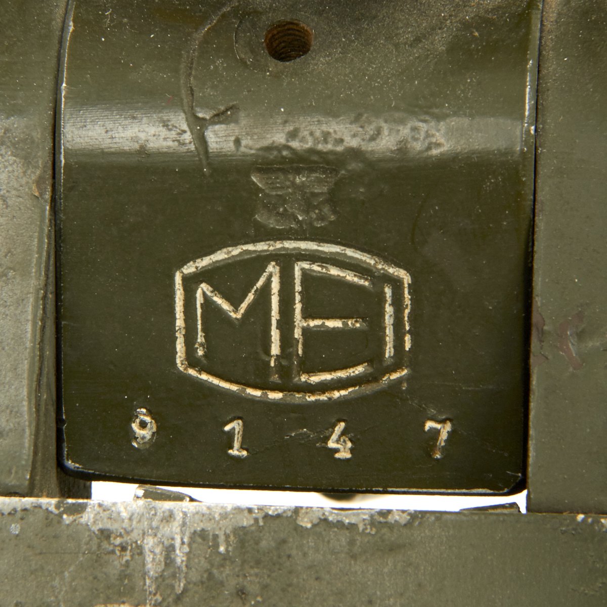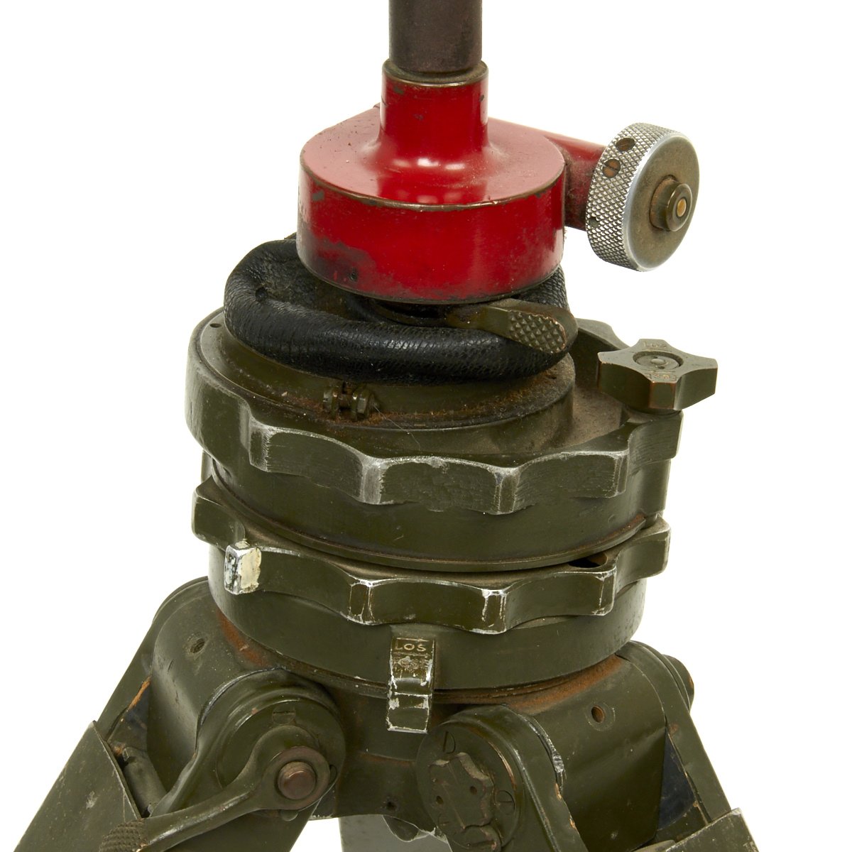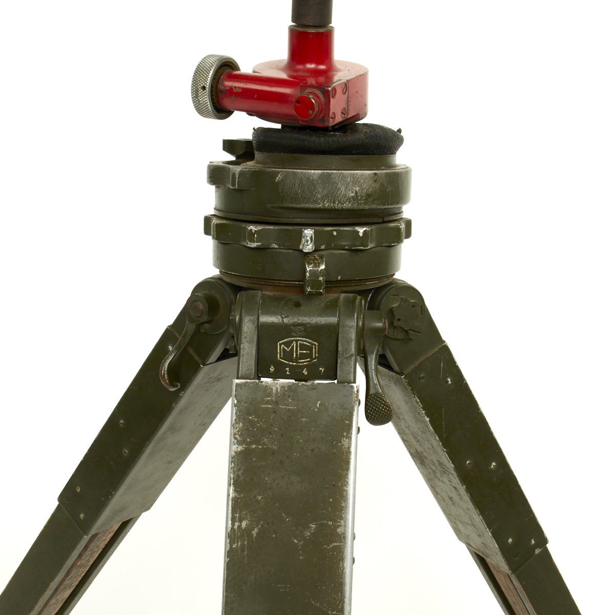 Also included is a hard to find Luftwaffe Gestell 31 Optics Tripod. Constructed of wood and steel, this aiming periscope tripod was manufactured between 1939 and 1945 by MEI. It is nicely maker marked and bears a German Waffen Amt. It retains 90% of it’s original German wartime paint and finish and is totally solid. All adjustments work perfectly. The leather cover is flexible with no dry rot or damage. The manufacture logo MEI is stamped into the side, along with a nice Waffenamt. The attachment bar and dovetail piece for the optics mount is post war.