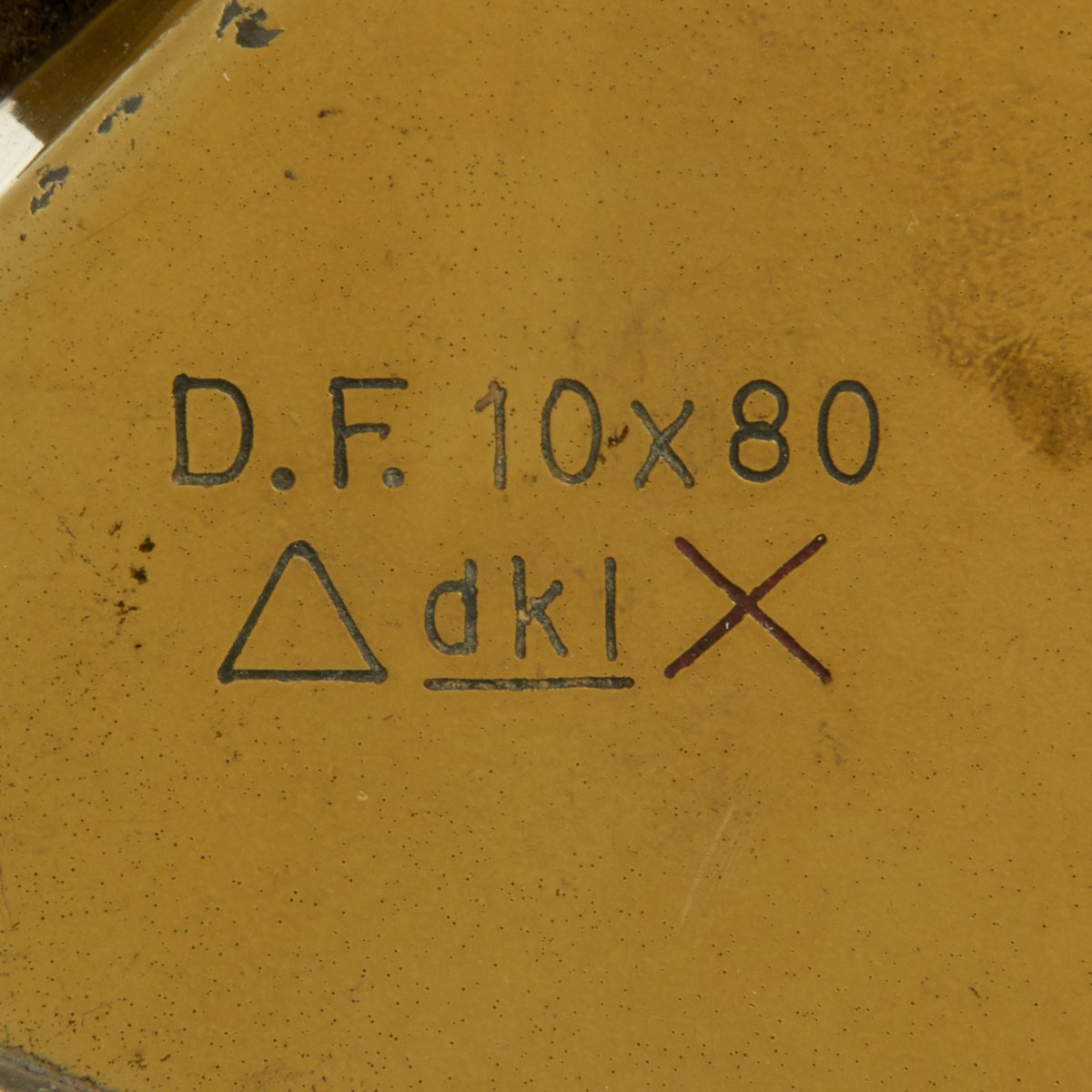 D.F. Is the abbreviation for Doppelfernrohr (double telescope), with 10 x 80 indicating the magnification power of the optics. The German wartime three letter code dkl stands for Josef Schneider & Co., of Kreuznach, a specialist lens maker, and under that the set's serial number is given.