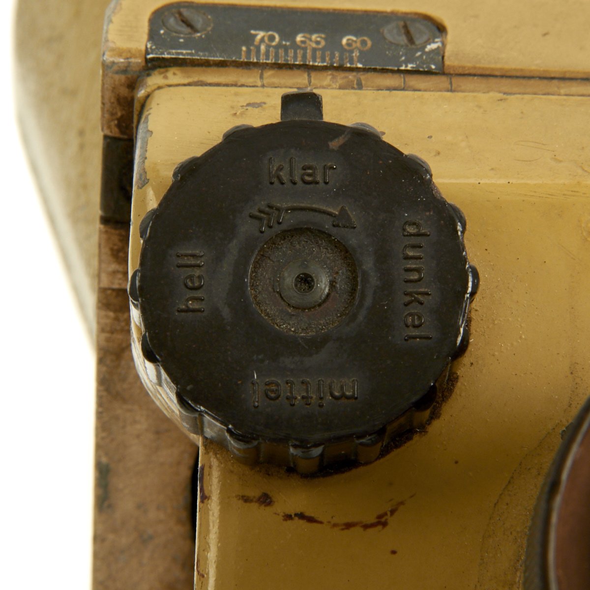 Luftwaffe Flak regiments used these giant 10 x 80 Binoculars during\ WW2. There are adjustments for eye relief, width and a selection of various tinted filters, which rotate into place using the control on the left side. The dial is labeled klar (clear), hell (light), mittel (medium), and dunkel (dark). In a typical example of German WW2 era (over) engineering, the control actually controls a mechanism that swings each individual filter in place on both sides simultaneously. A more modest implementation with filters that were fitted over the eye pieces would have probably been more economical.