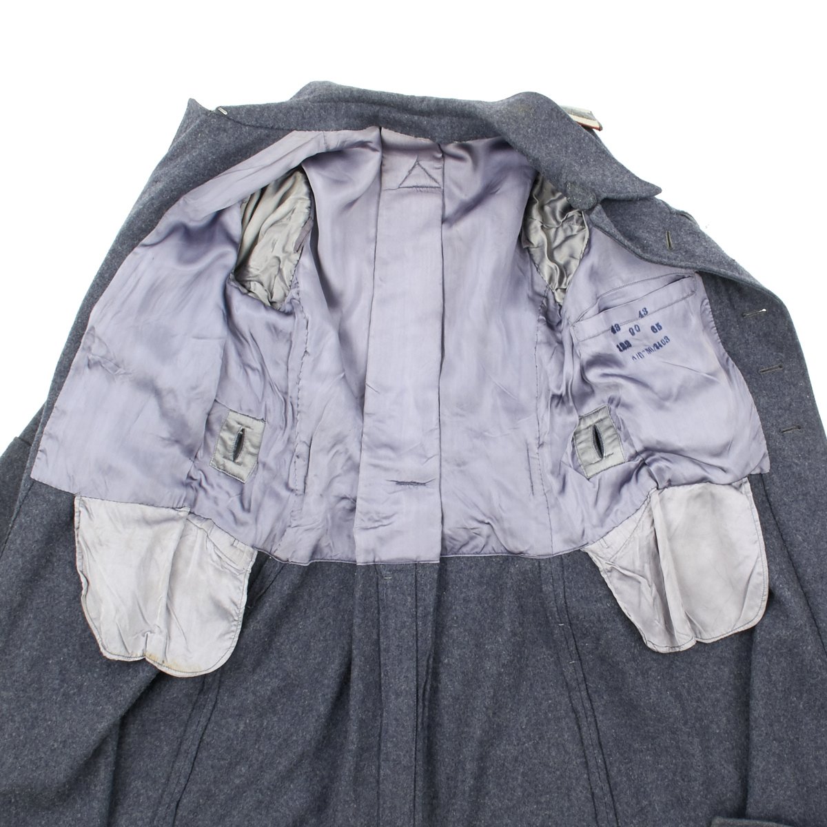 Original Item: Only One Available. WWII manufactured Luftwaffe greatcoat for a flak Non-Commissioned Officer (NCO). It is offered in excellent condition and constructed of blue grey wool with a satin lining. The interior pocket is nicely ink stamped with RBNr 0/0250/2403 and dated 1943. Complete with NCO Flak shoulder boards, all the aluminum pebble grain buttons are present and in very good condition. Approximate size of overcoat is US 36.