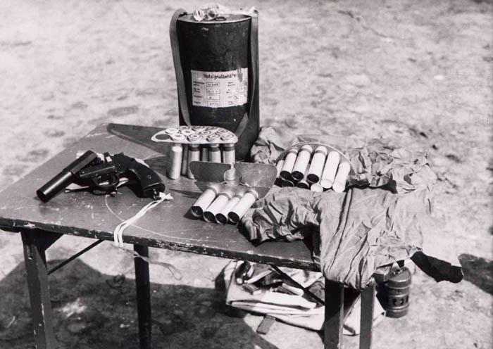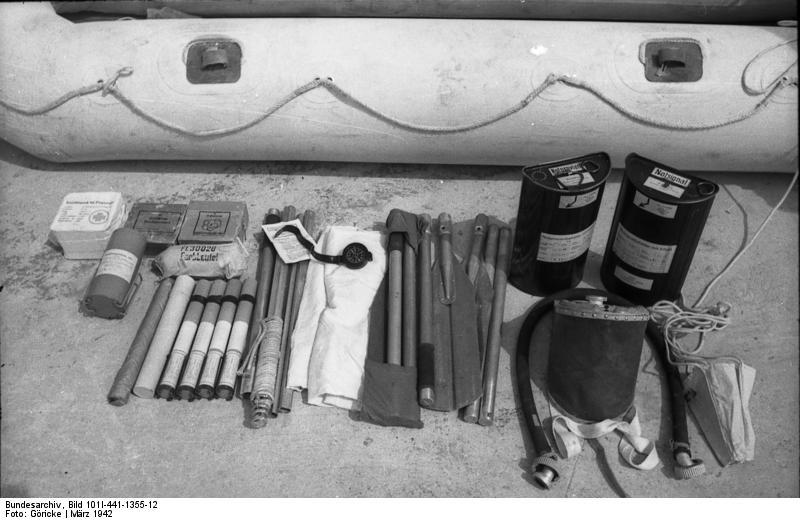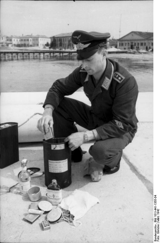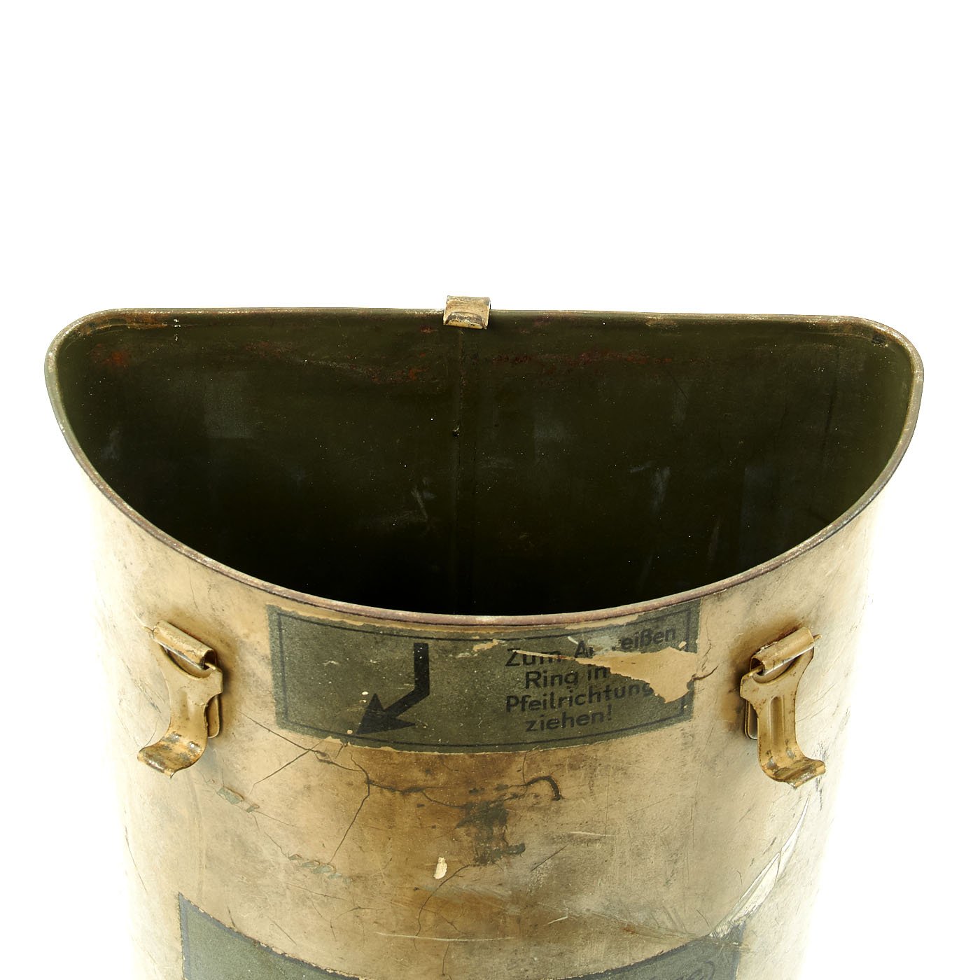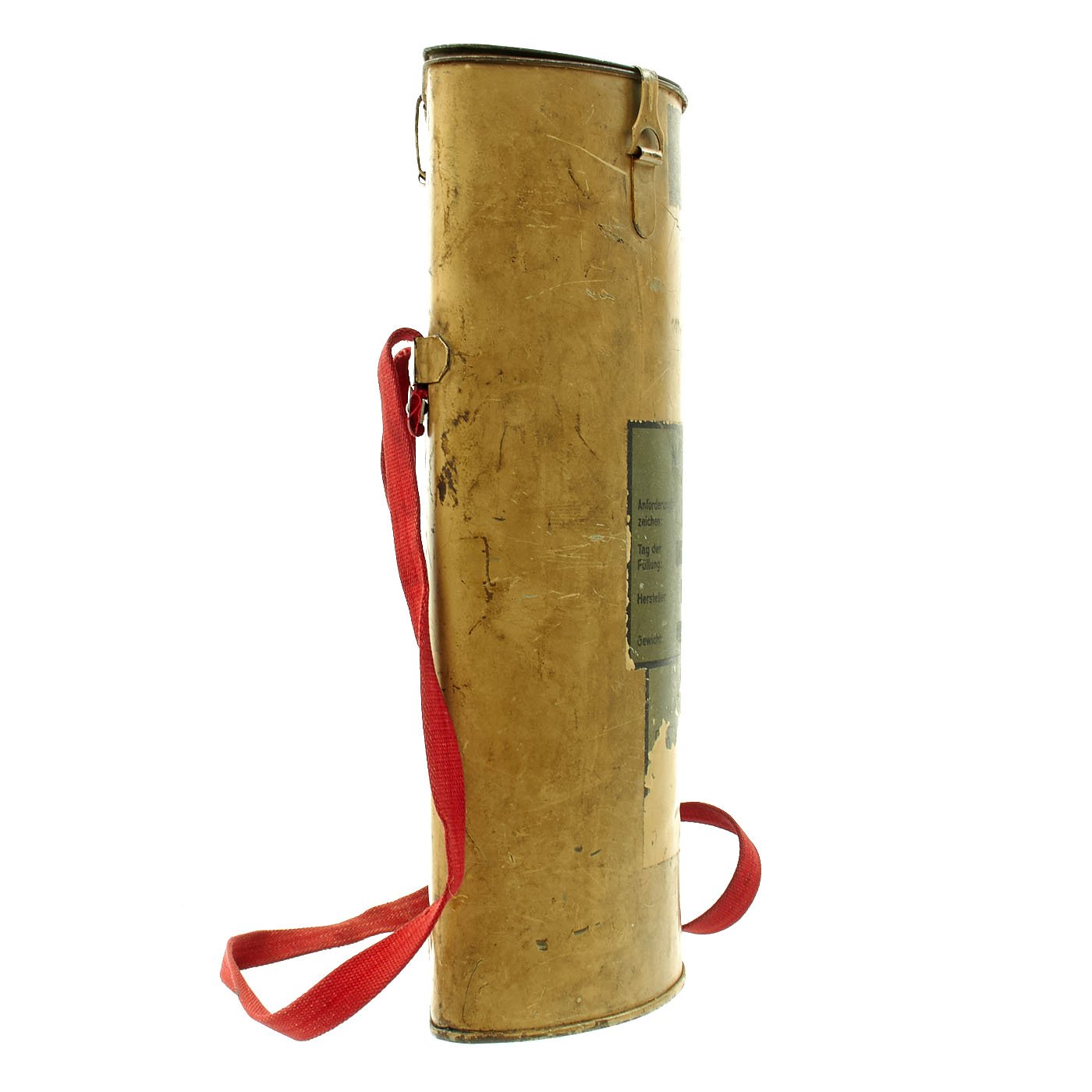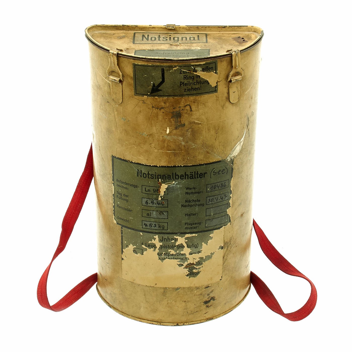Original Item: Only One Available. Extremely rare! This is a semi cylinder transport box that was designed to contain a flare pistol and multiple flares. it was issued to members of the Luftwaffe for their survival packs. It is nicely labeled Notsignalbehälter which means "container for survival or emergency" and is a semi-cylinder box in which a failure gun and flares ware stored. It was part of a Luftwaffe survival. The cylinder measures 13" H x 4" W x 8" L. Offered in very good condition, but empty. There is an informative website that details the use of these at this link.
