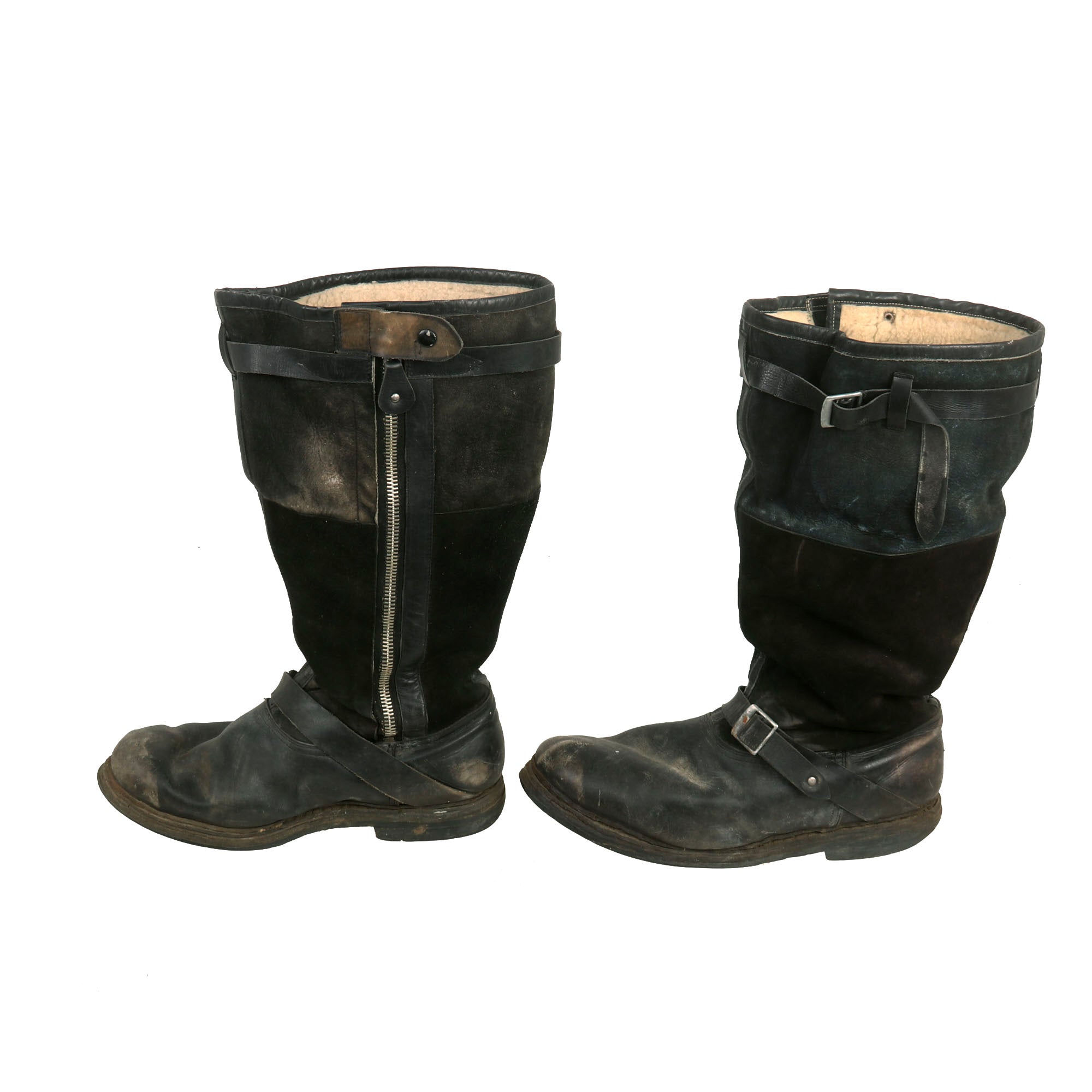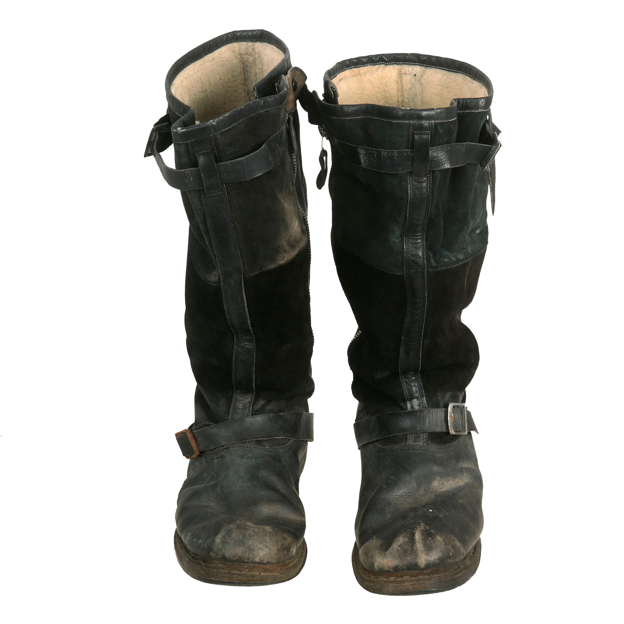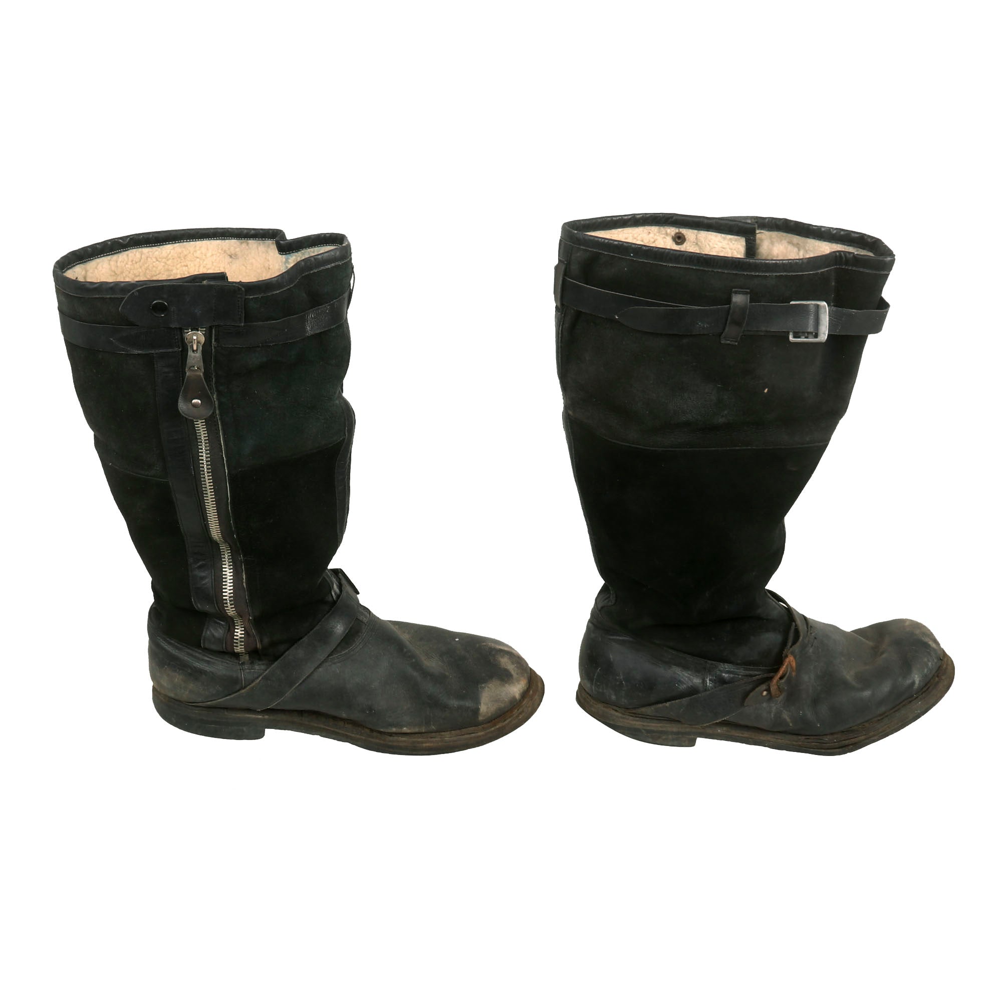 Original Items: Only One Pair Available. This is a very nice lightly used condition pair of German World War Two fur-lined Luftwaffe Airman's Flying Boots. The construction is of black leather for the shoe area and black suede for the shafts. Both inner labels are unfortunately completely faded, so we cannot see the size markings. The zippers are completely original and both are “ZIPP” and “D.R.P.” patent marked. The fleece linings are in very good condition, as are the “Original Wilop” marked pebble soles. The zippers, buckles, and snaps are all fully functional, though may require lubrication.
