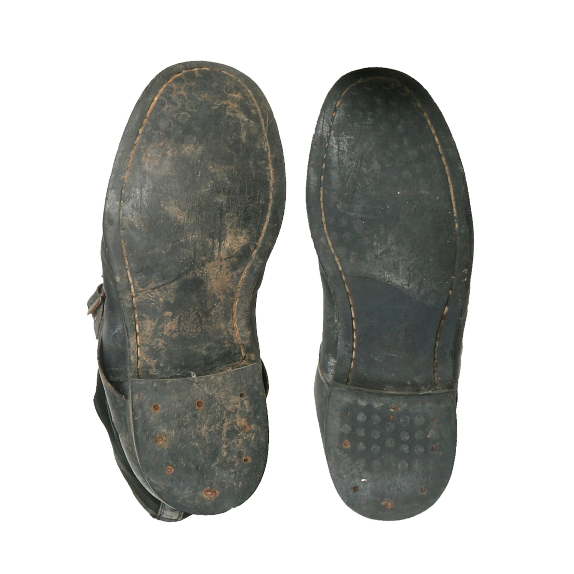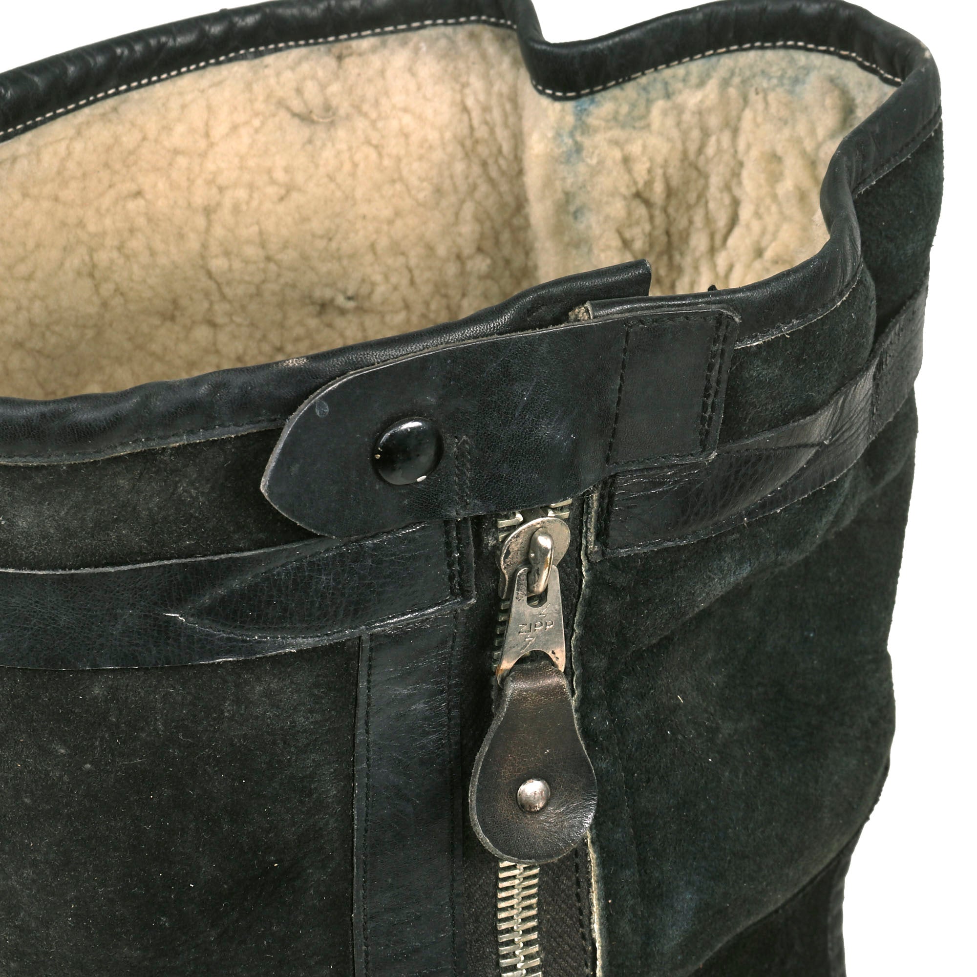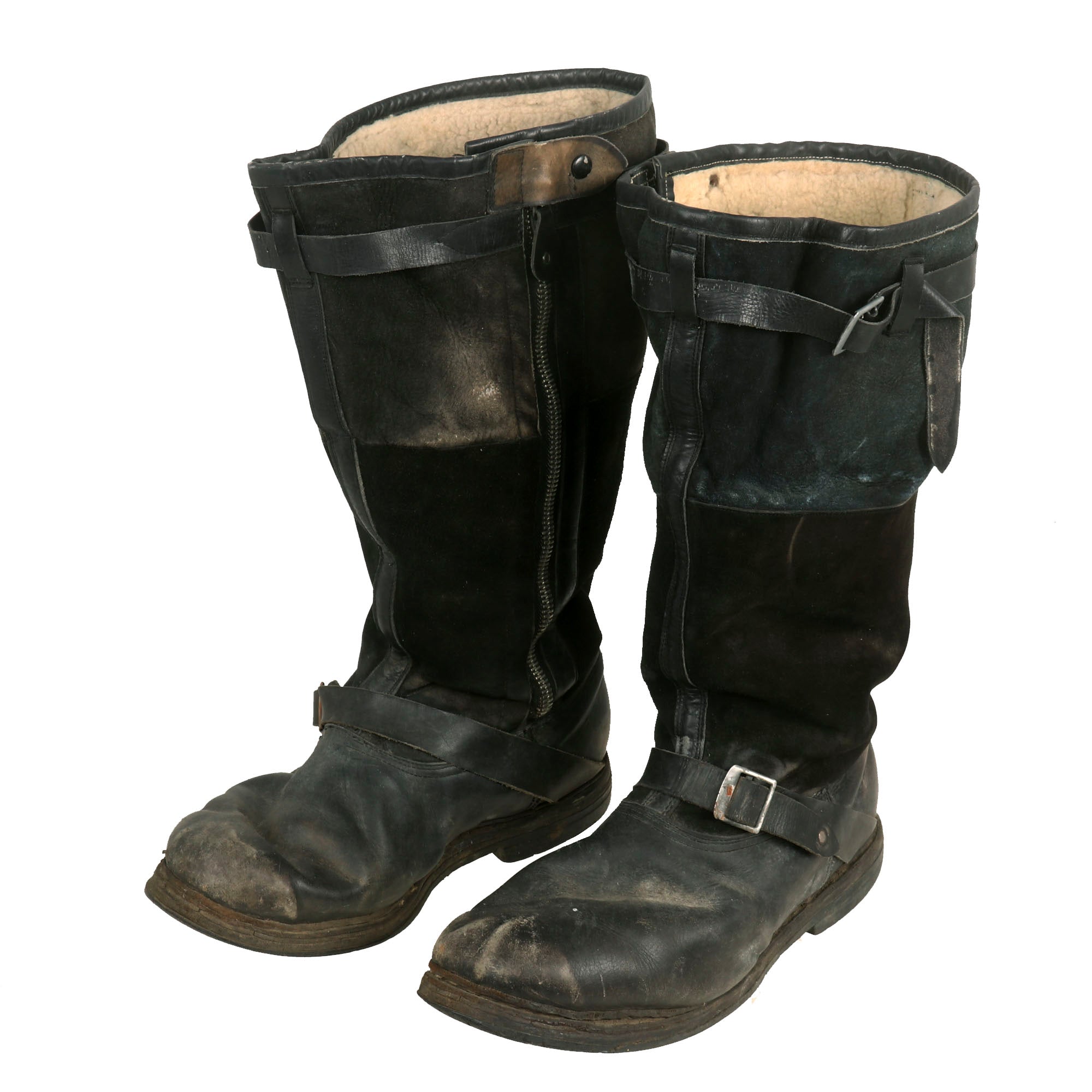 Original Items: Only One Pair Available. This is a very nice lightly used condition pair of German World War Two fur-lined Luftwaffe Airman's Flying Boots. The construction is of black leather for the shoe area and black suede for the shafts. Both inner labels are unfortunately completely faded, so we cannot see the size markings. The zippers are completely original and both are “ZIPP” and “D.R.P.” patent marked. The fleece linings are in very good condition, as are the “Original Wilop” marked pebble soles. The zippers, buckles, and snaps are all fully functional, though may require lubrication.