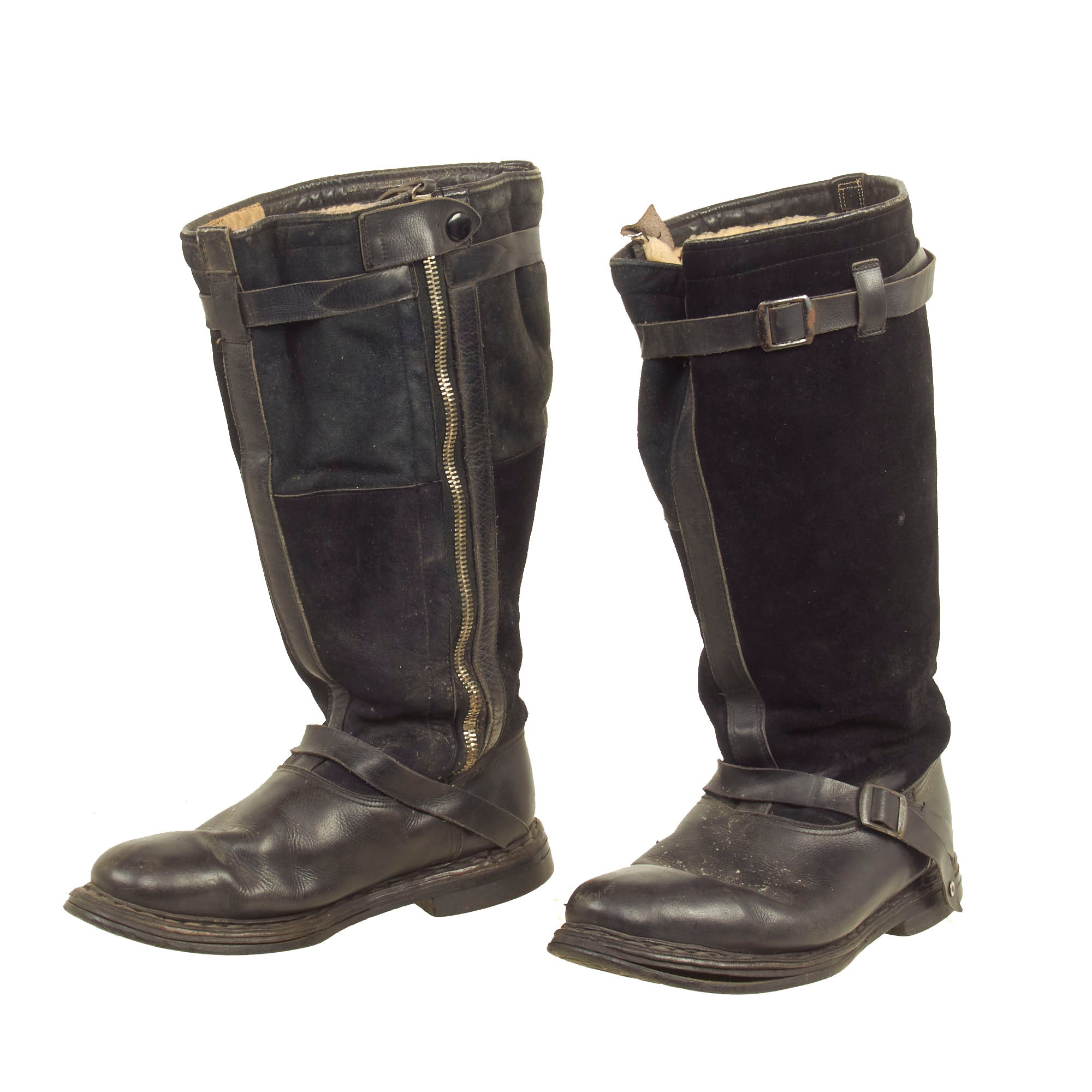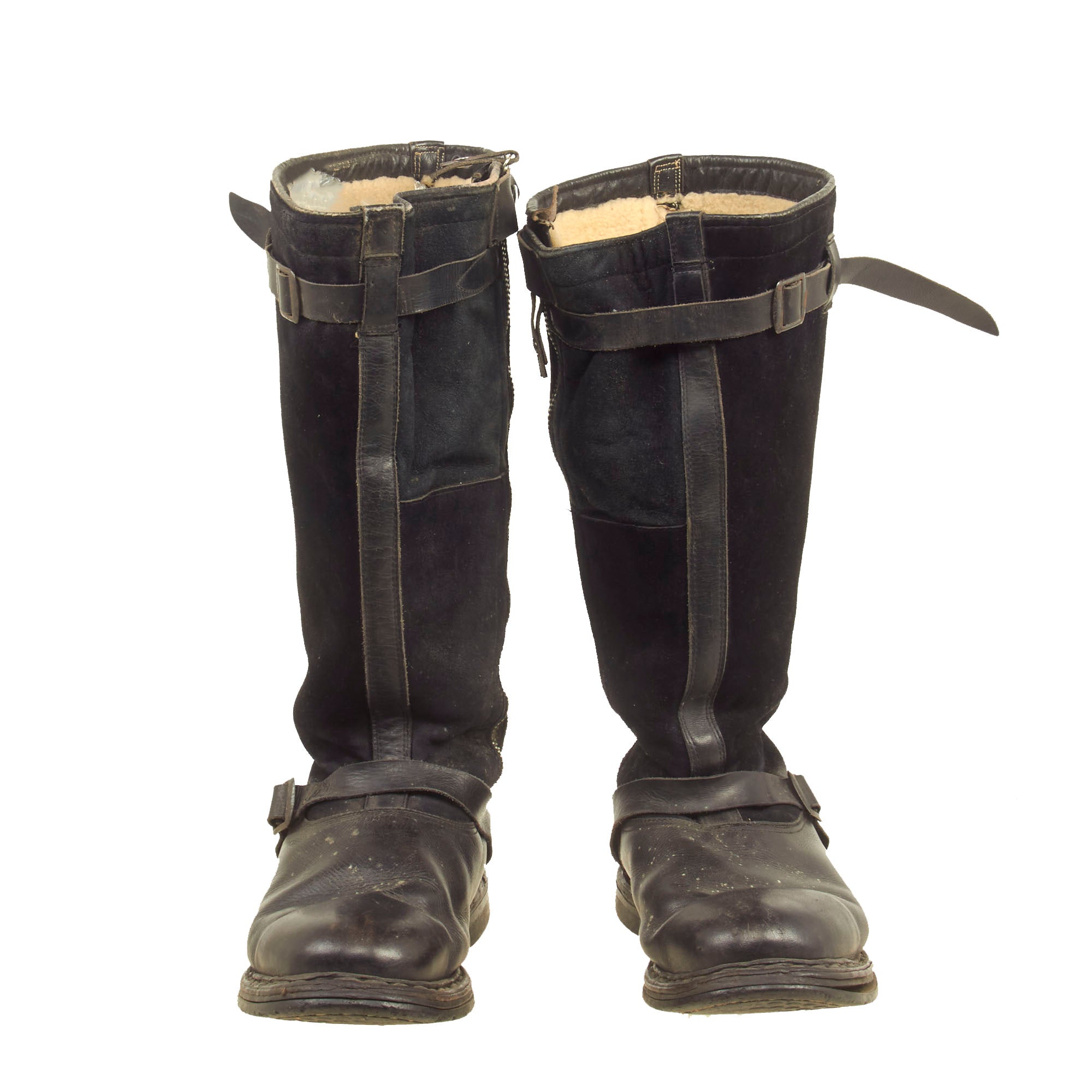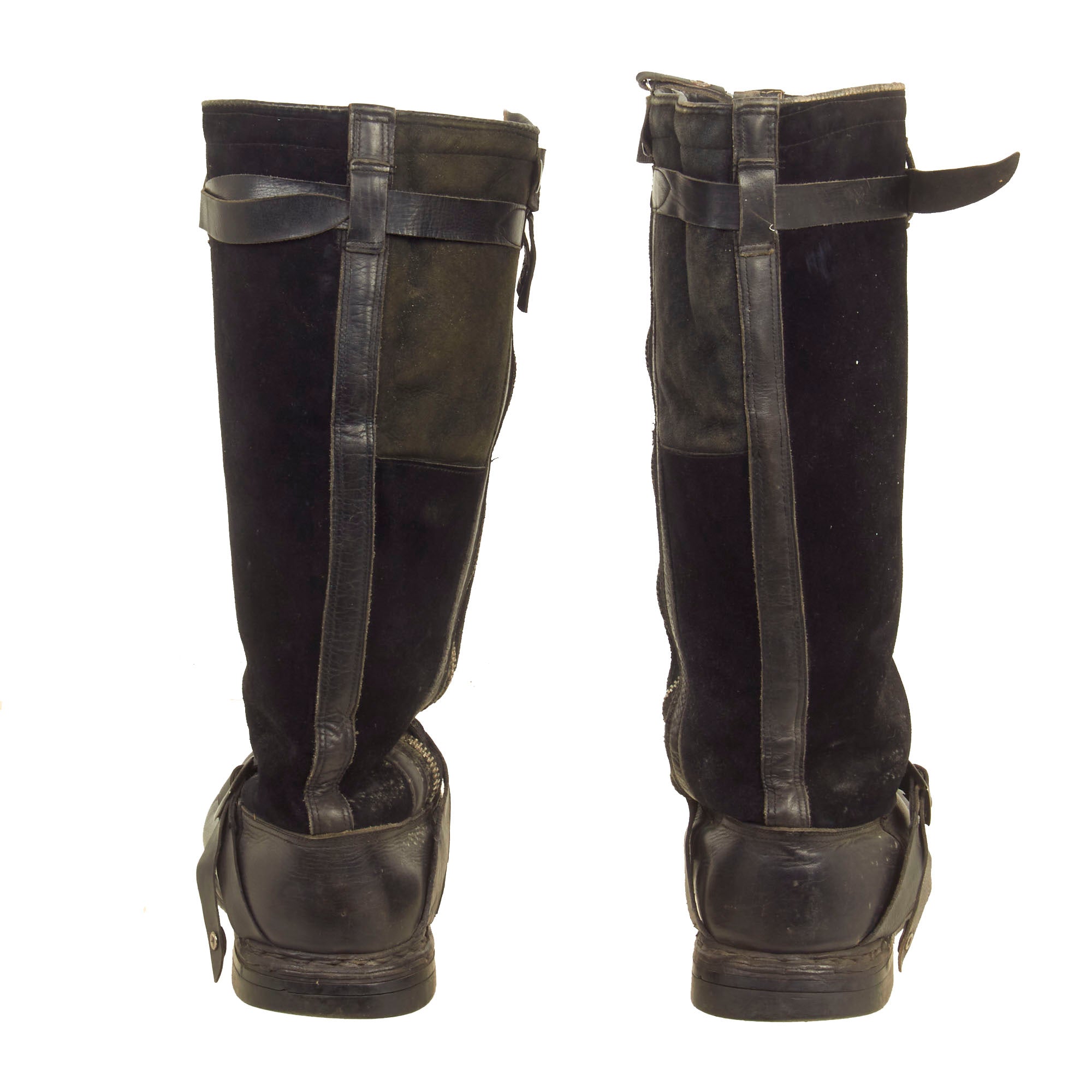 Original Items: Only One Pair Available. This is a very nice lightly used condition pair of German World War Two fur-lined Luftwaffe Airman's Flying Boots. The construction is of black leather for the shoe area and black suede for the shafts. Both inner labels are unfortunately completely faded, so we cannot see the size markings. The zippers are completely original and both are “RIRI” and “D.R.P.” patent marked. The fleece linings are in very good condition, as are the “Original Wilop” marked pebble soles. The zippers, buckles, and snaps are all fully functional, though may require lubrication.
