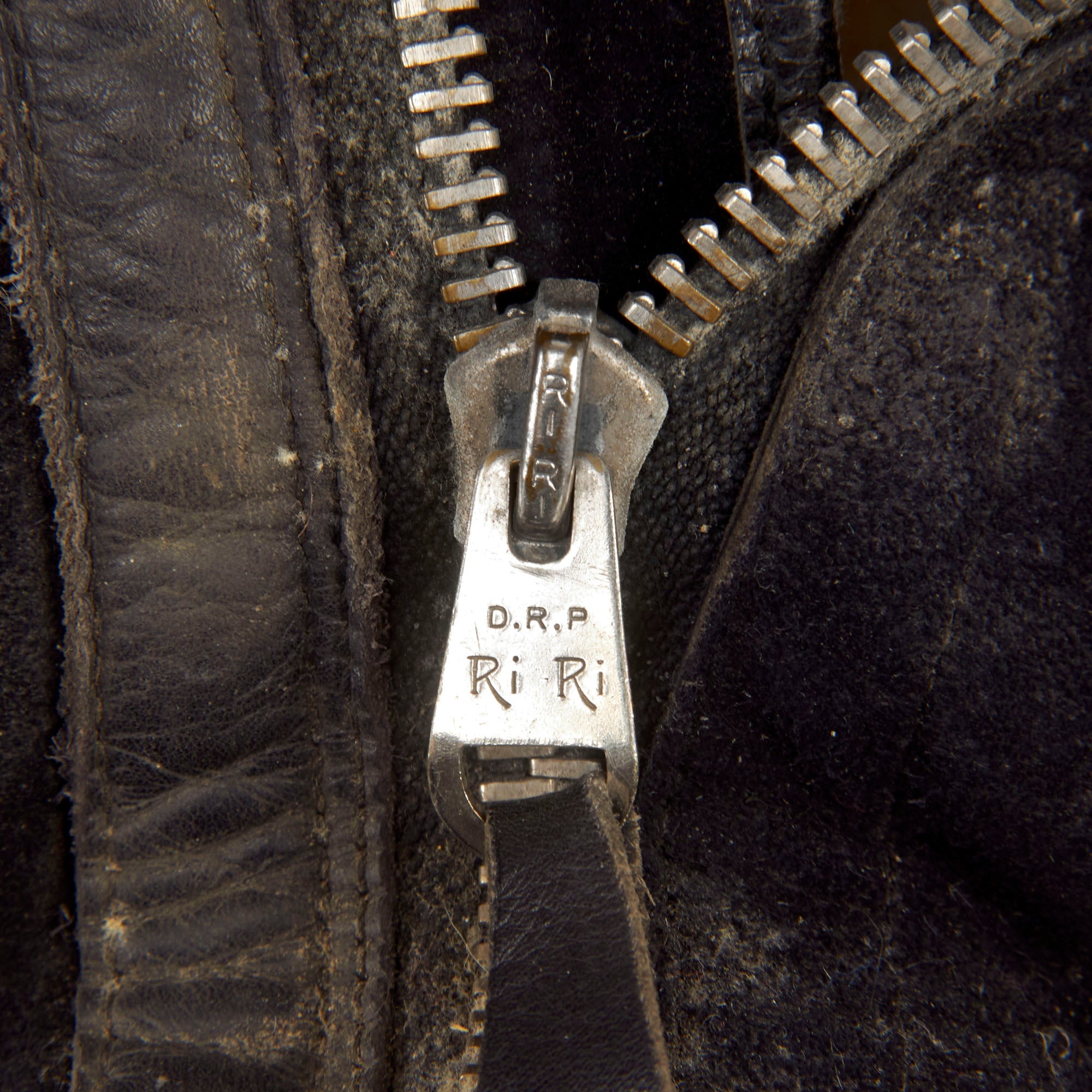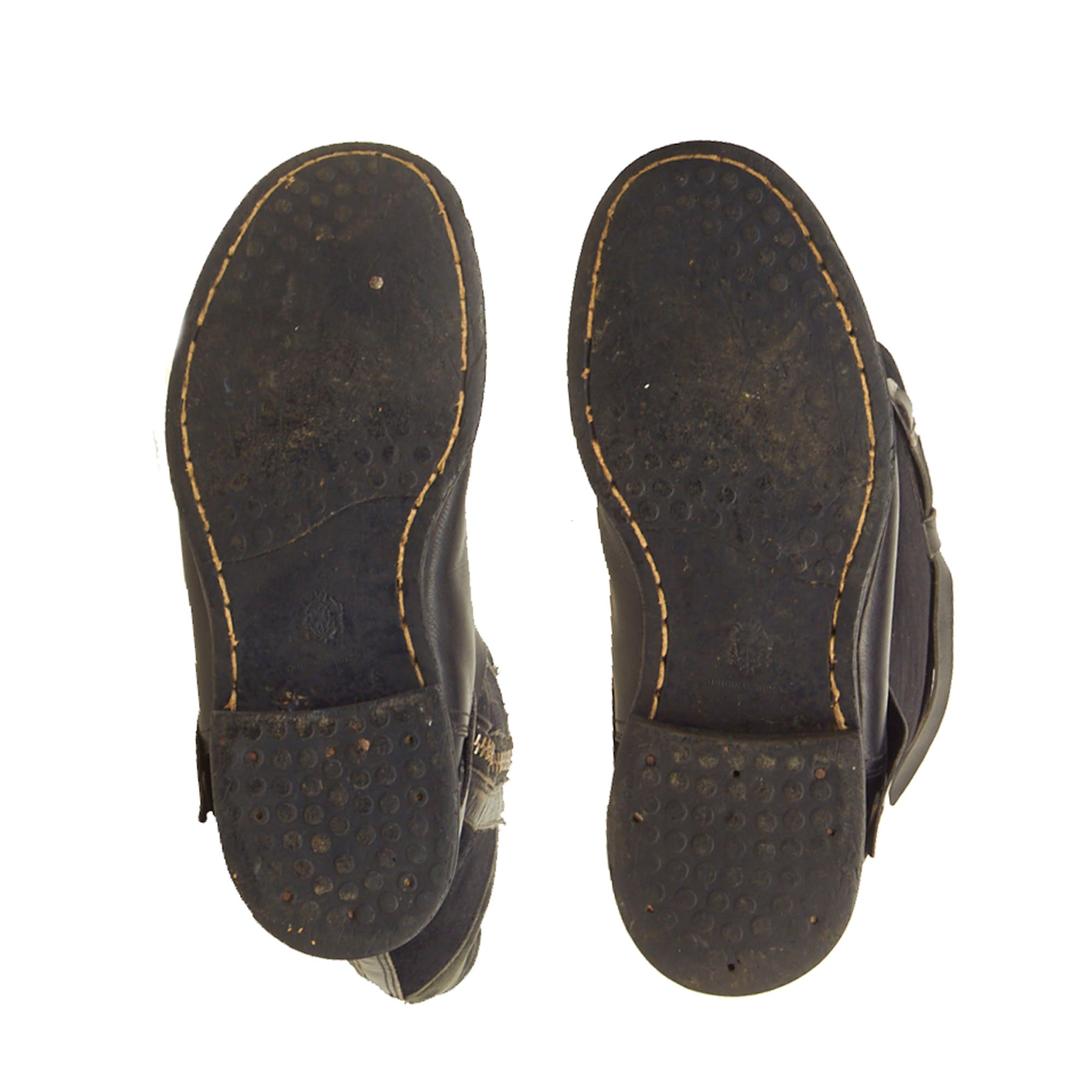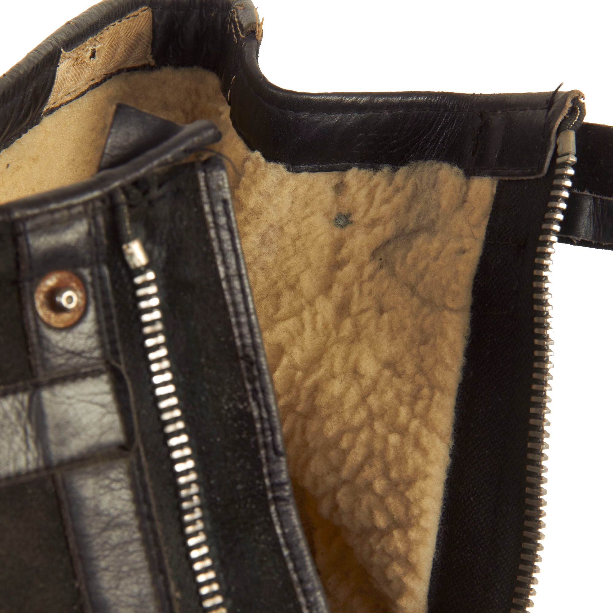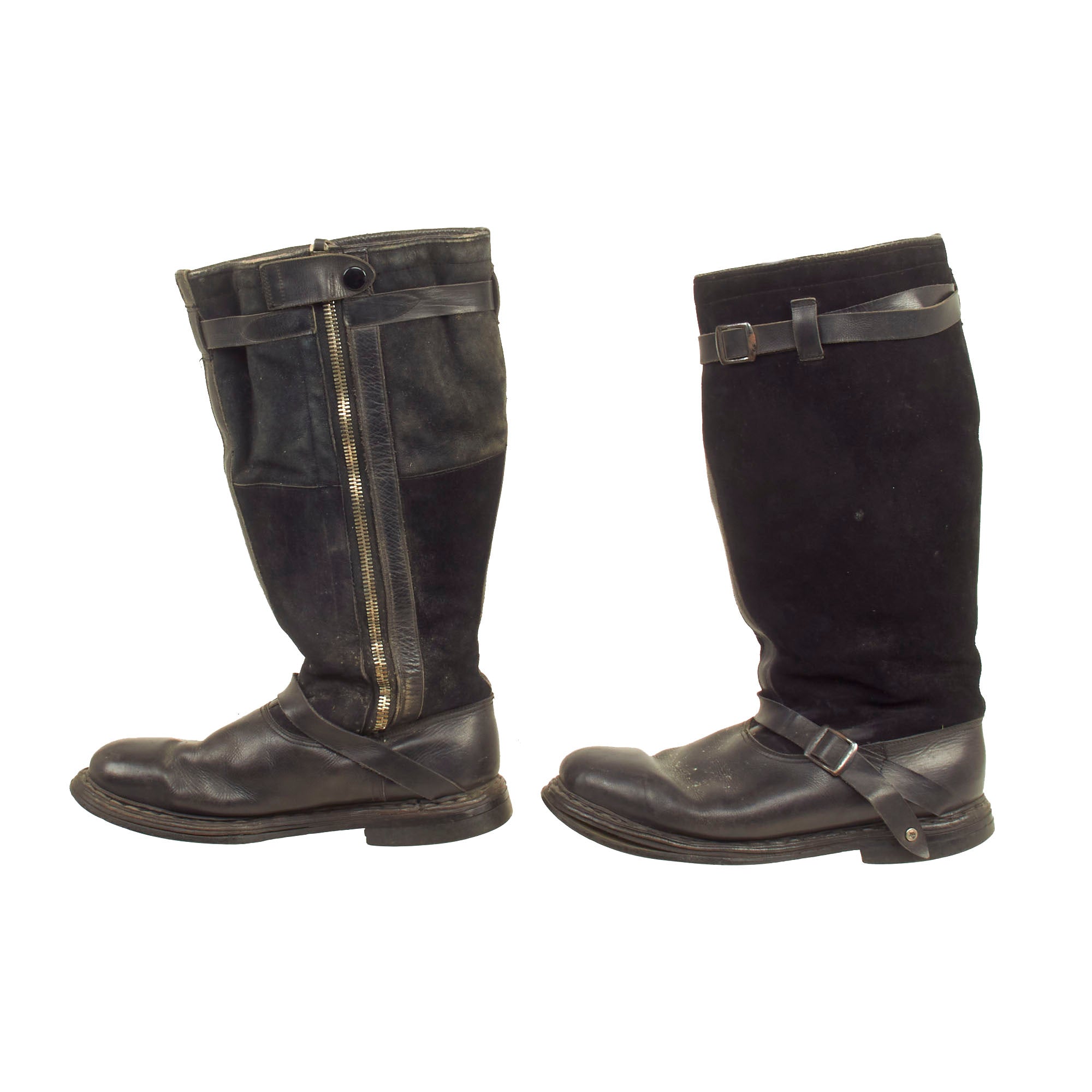 Original Items: Only One Pair Available. This is a very nice lightly used condition pair of German World War Two fur-lined Luftwaffe Airman's Flying Boots. The construction is of black leather for the shoe area and black suede for the shafts. Both inner labels are unfortunately completely faded, so we cannot see the size markings. The zippers are completely original and both are “RIRI” and “D.R.P.” patent marked. The fleece linings are in very good condition, as are the “Original Wilop” marked pebble soles. The zippers, buckles, and snaps are all fully functional, though may require lubrication.
