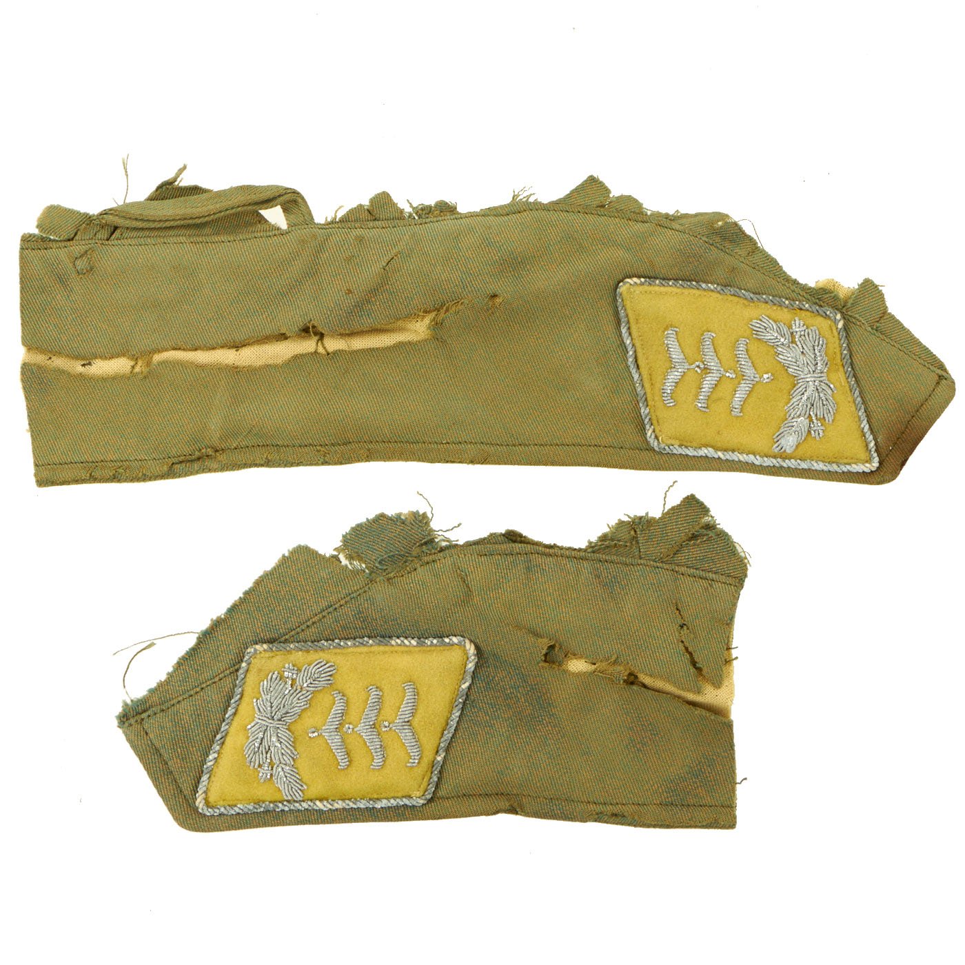 Known as Kragenpatten (Collar Flaps) in German, these were attached to the collars to indicate the rank and branch of the wearer. These are in Goldgelb (Gold-Yellow), the correct Waffenfarbe (Corps Color) for Aviator troops such as pilots and ground personnel, as well as Fallschirmjäger (parachute troops). The three bullion "wings" above oak leaves indicate the rank of Hauptmann (Captain).