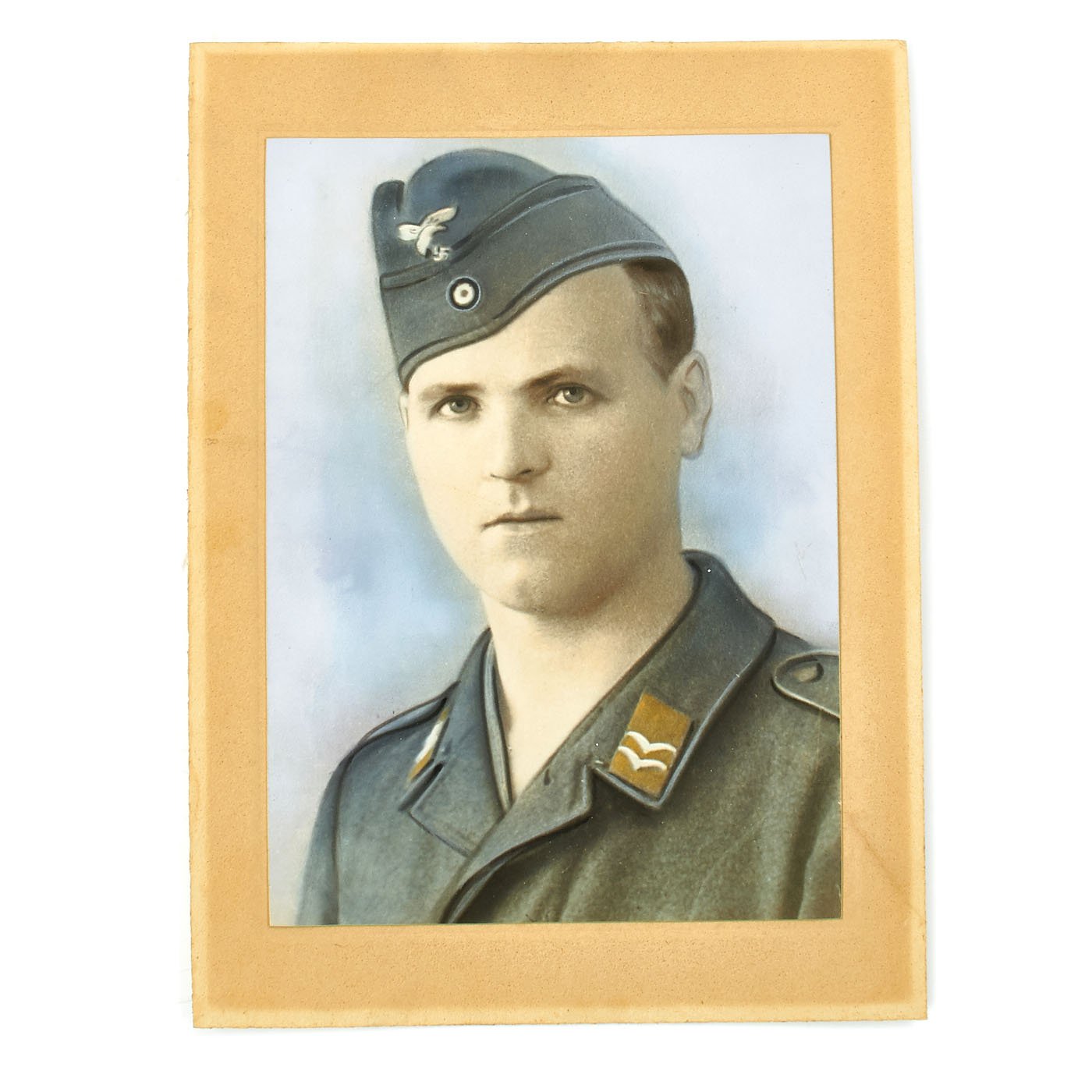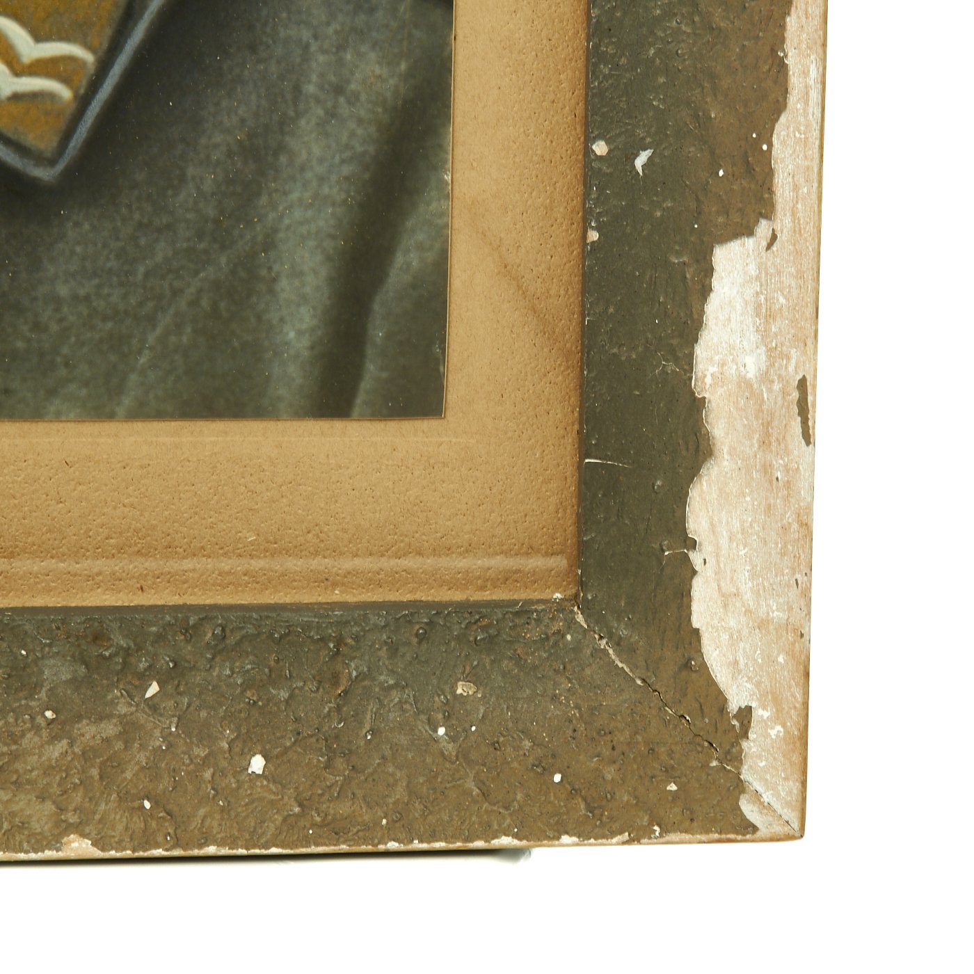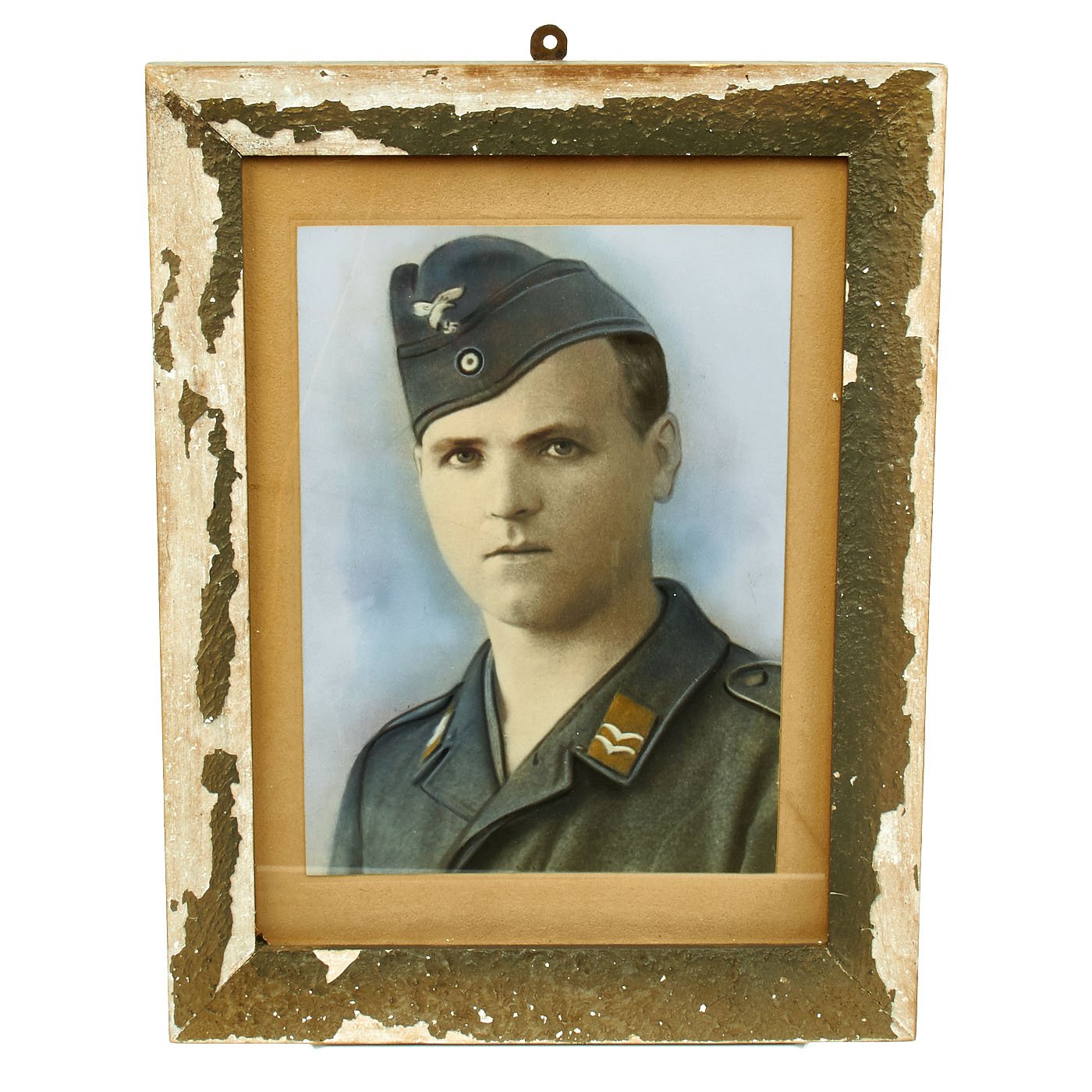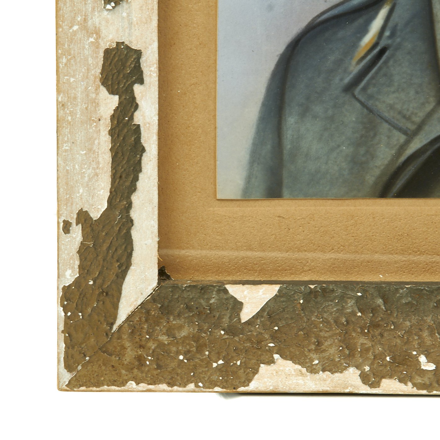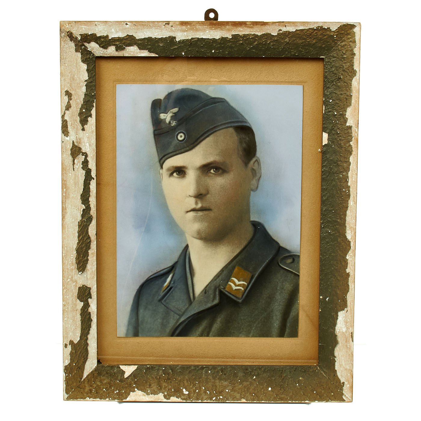 - Original Item: One-of-a-kind. This is a beautifully done pastel of an unknown German Luftwaffe Gefreiter (private first class). The pastel itself measures 10.5" x 14.5" and when mounted in the frame it measures 16.5" x 21"5. The colors are vibrant and the eyes feel alive, the quality is close to that of a colorized photograph, the arias was clearly very talented. The frame has seen better days. it has a glass glaze and the backing easily removed it desired. Interestingly the cardboard back sheet is actually a portion of a box for a German WWII era tank model. Overall a really attractive rendering, in the original 1937-1945 frame.