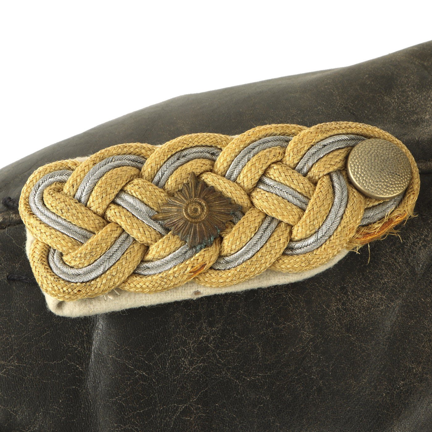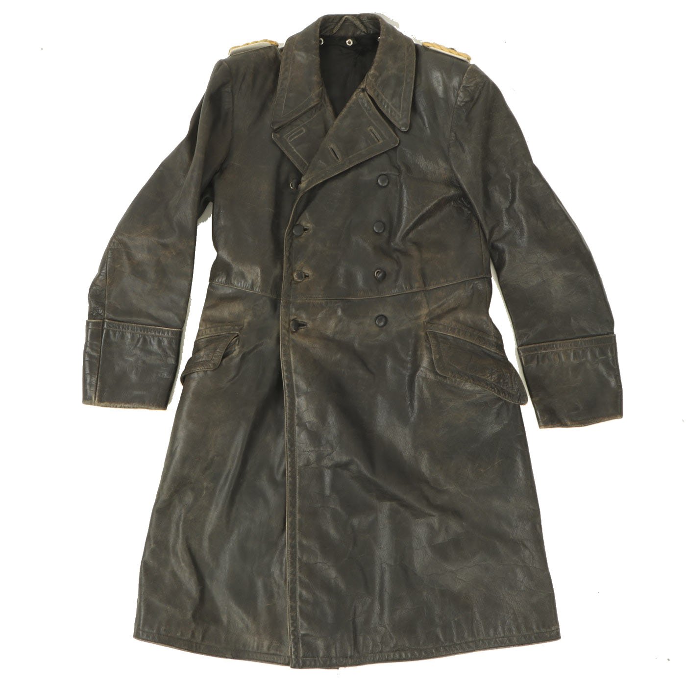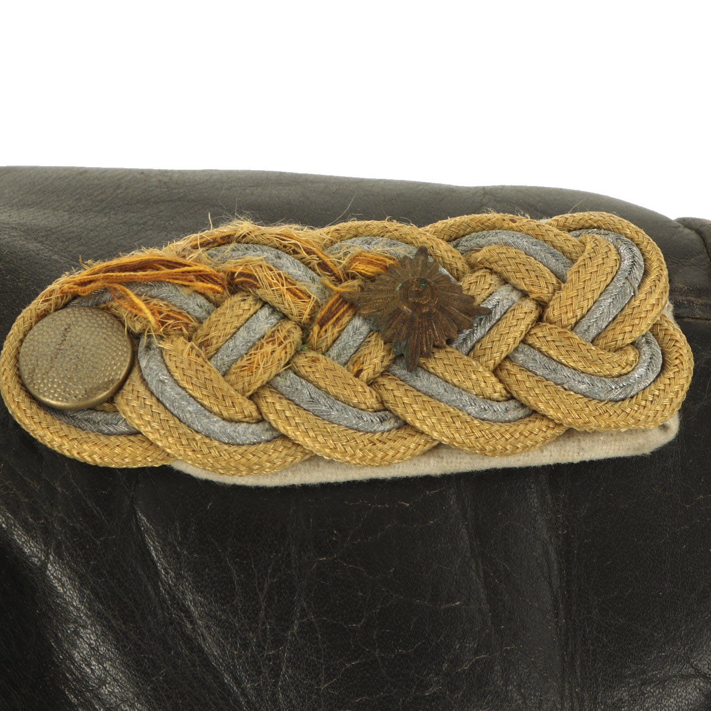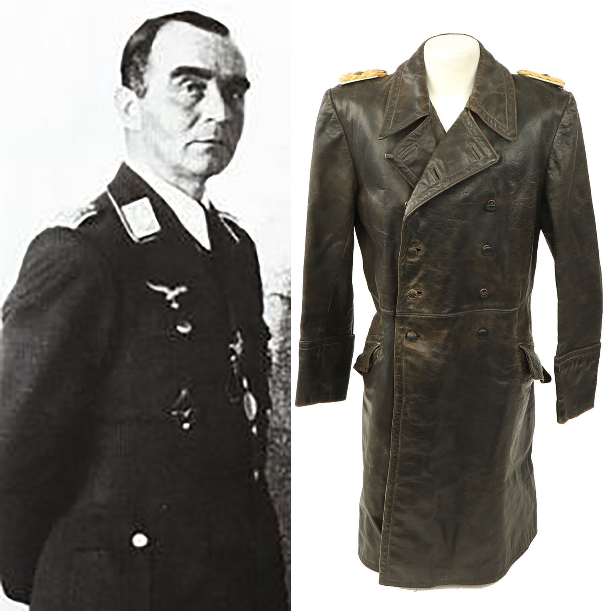 This extremely rare leather overcoat or greatcoat was a typical pattern used by officers in the German Wehrmacht. It is heavy grade leather with a quilted internal lining, manufactured with excellent quality and offered in very good condition. Interior HANNOVER tailor label and PRYM buttons, making this consistent with a genuine German mid-war production of a private purchase uniform piece. Also of particular note are very nice Russia braid Epaulets with one pip indicating a rank or Lieutenant General (Generalleutnant). Generals' shoulder boards were constructed similarly to those of field-grade officers, but comprised a length of silver Russia braid between two braided cords of gold bullion or Celleon. Since the resulting combination was wider, generals' boards were plaited in four 'loops' rather than five. Their buttons were gilt, and rank was indicated by zero to three silver pips, or crossed batons in the case of field marshals. The underlay was scarlet, except (from 1944) for generals of staff corps, who were instructed to wear Waffenfarbe instead. As was the case with Generalleutnant Hückel as he worked as an administrator for the majority of the WWII career.