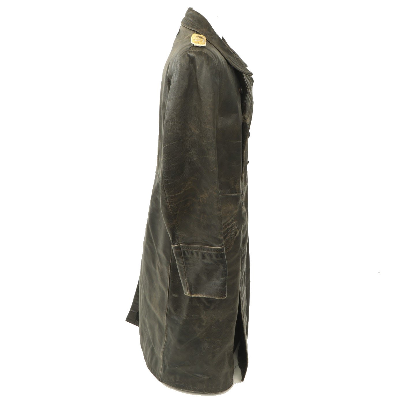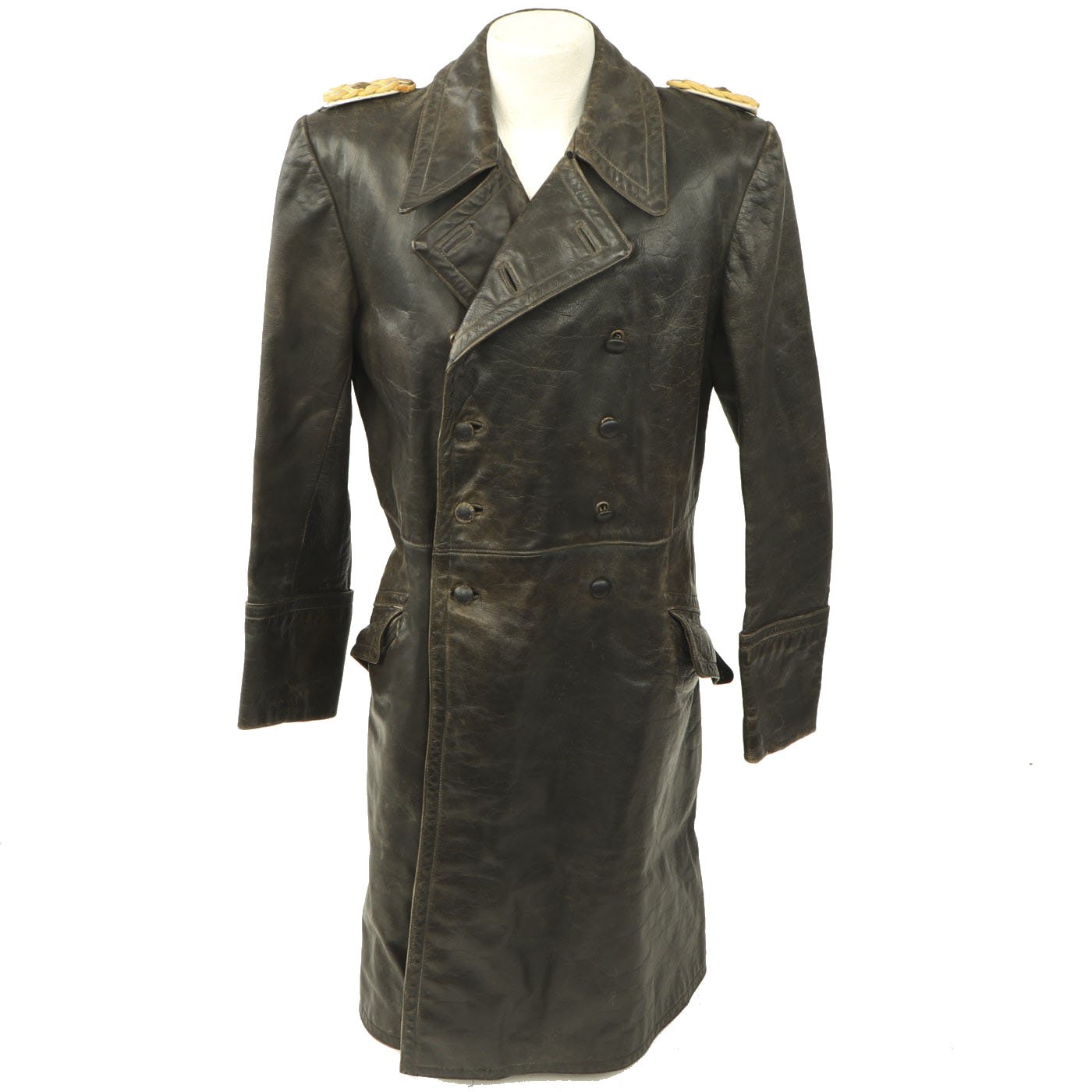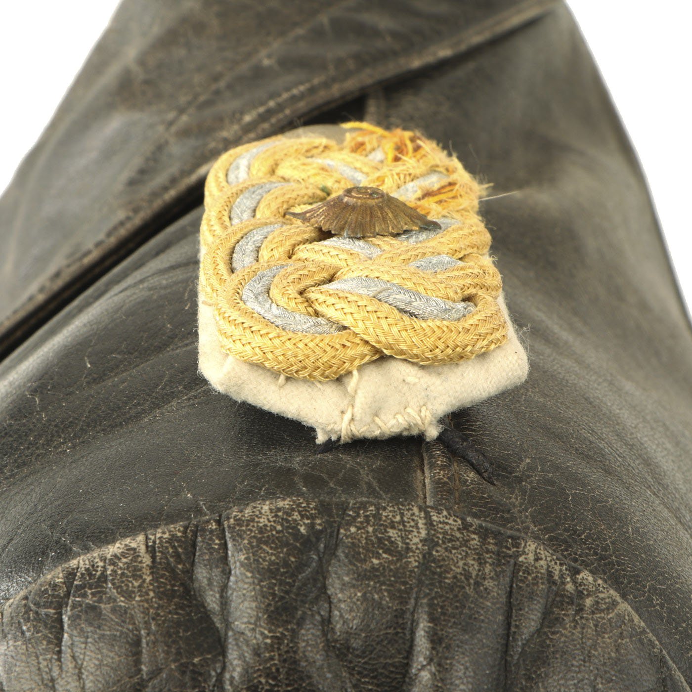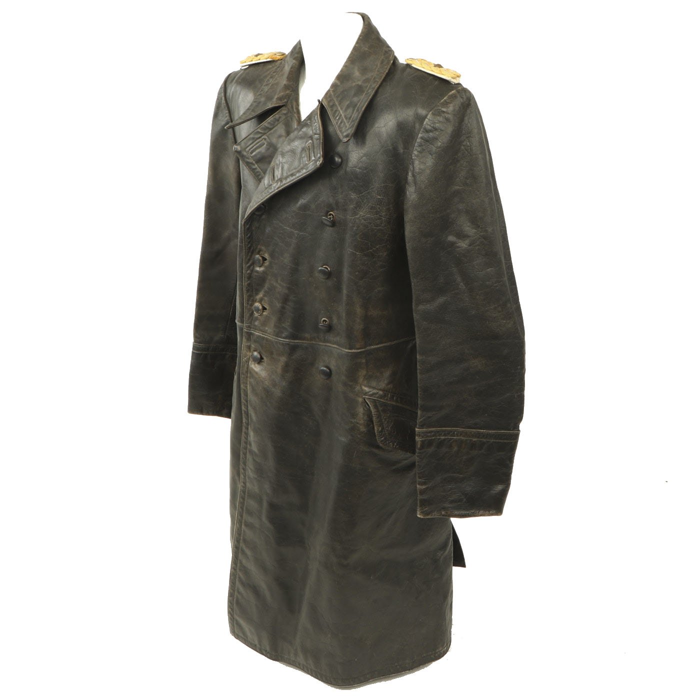 This extremely rare leather overcoat or greatcoat was a typical pattern used by officers in the German Wehrmacht. It is heavy grade leather with a quilted internal lining, manufactured with excellent quality and offered in very good condition. Interior HANNOVER tailor label and PRYM buttons, making this consistent with a genuine German mid-war production of a private purchase uniform piece. Also of particular note are very nice Russia braid Epaulets with one pip indicating a rank or Lieutenant General (Generalleutnant). Generals' shoulder boards were constructed similarly to those of field-grade officers, but comprised a length of silver Russia braid between two braided cords of gold bullion or Celleon. Since the resulting combination was wider, generals' boards were plaited in four 'loops' rather than five. Their buttons were gilt, and rank was indicated by zero to three silver pips, or crossed batons in the case of field marshals. The underlay was scarlet, except (from 1944) for generals of staff corps, who were instructed to wear Waffenfarbe instead. As was the case with Generalleutnant Hückel as he worked as an administrator for the majority of the WWII career.