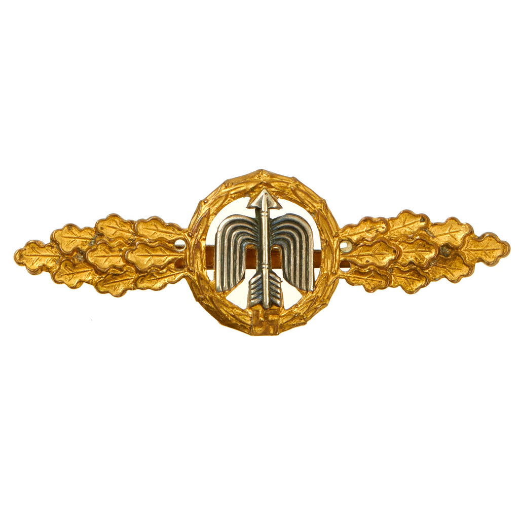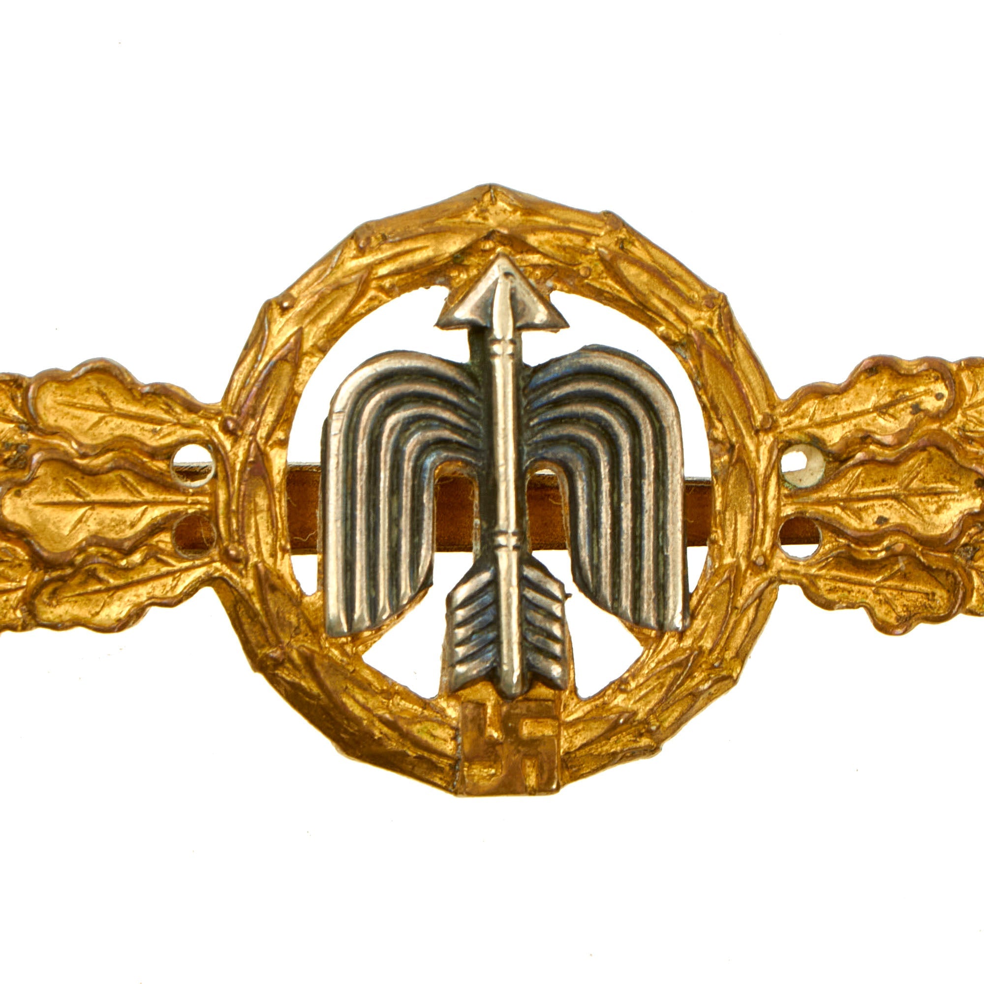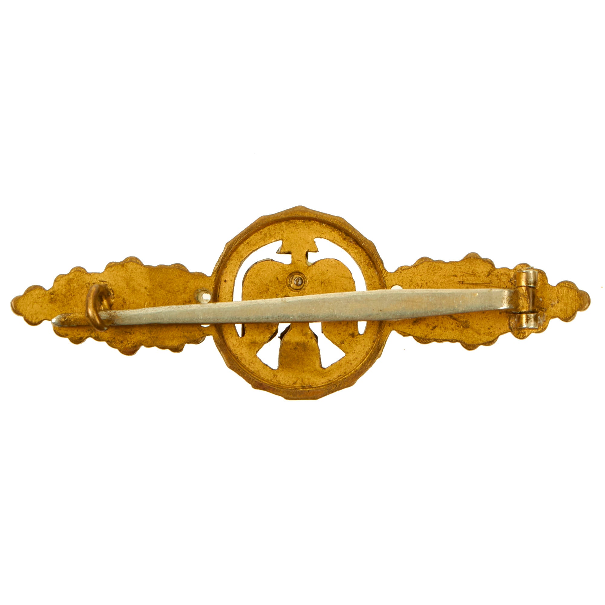 Original Item: Only One Available. This is a very nice condition German WWII Luftwaffe Front Flying Clasp in Gold Grade, as issued to Daytime Fighter pilots who had flown at least 110 missions. Officially this version of the award is termed the Frontflugspange für Jäger in Gold in German. This example is in very nice condition, with only minor age-related oxidation, which gives it a great look. The central device is gold highlighted and shows only slight wear. The back clip is intact, and works beautifully. The oak leaves on the sides still have most of the gold wash intact, something we rarely see! Only the back of the award around the middle shows any real wear through to the brass base metal.