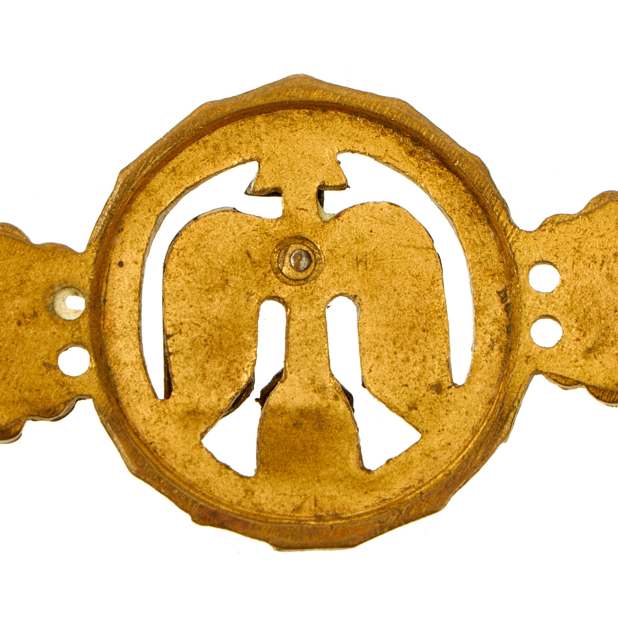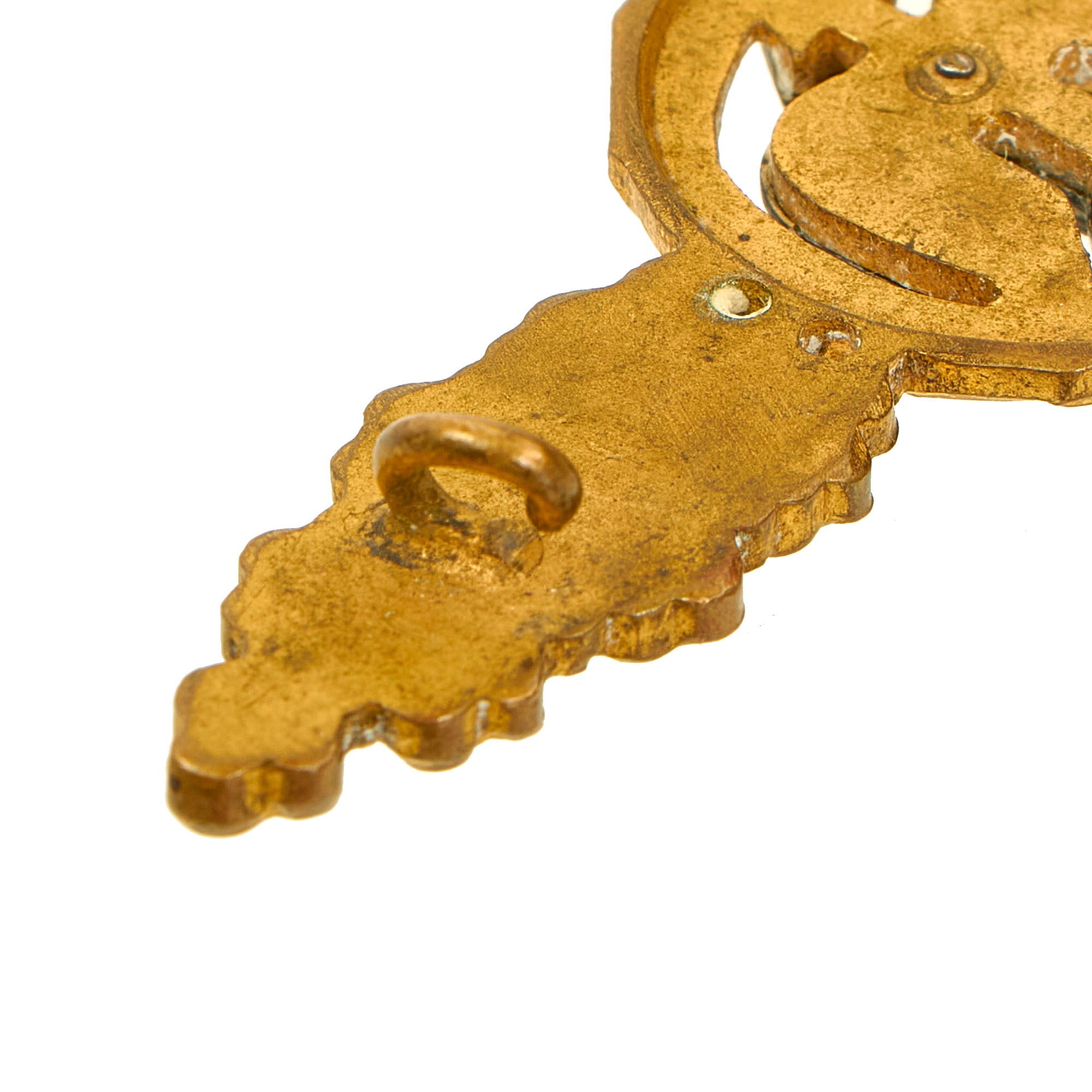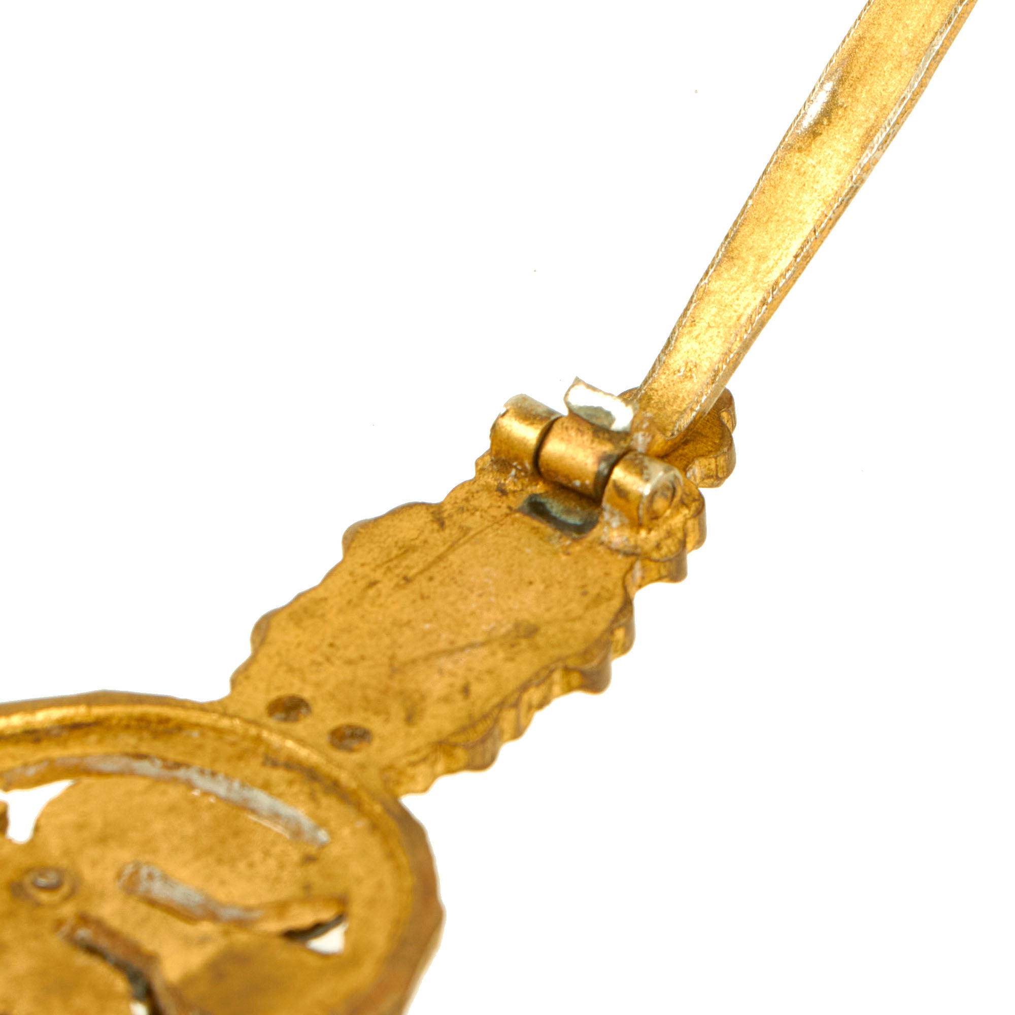Original Item: Only One Available. This is a very nice condition German WWII Luftwaffe Front Flying Clasp in Gold Grade, as issued to Daytime Fighter pilots who had flown at least 110 missions. Officially this version of the award is termed the Frontflugspange für Jäger in Gold in German. This example is in very nice condition, with only minor age-related oxidation, which gives it a great look. The central device is gold highlighted and shows only slight wear. The back clip is intact, and works beautifully. The oak leaves on the sides still have most of the gold wash intact, something we rarely see! Only the back of the award around the middle shows any real wear through to the brass base metal.