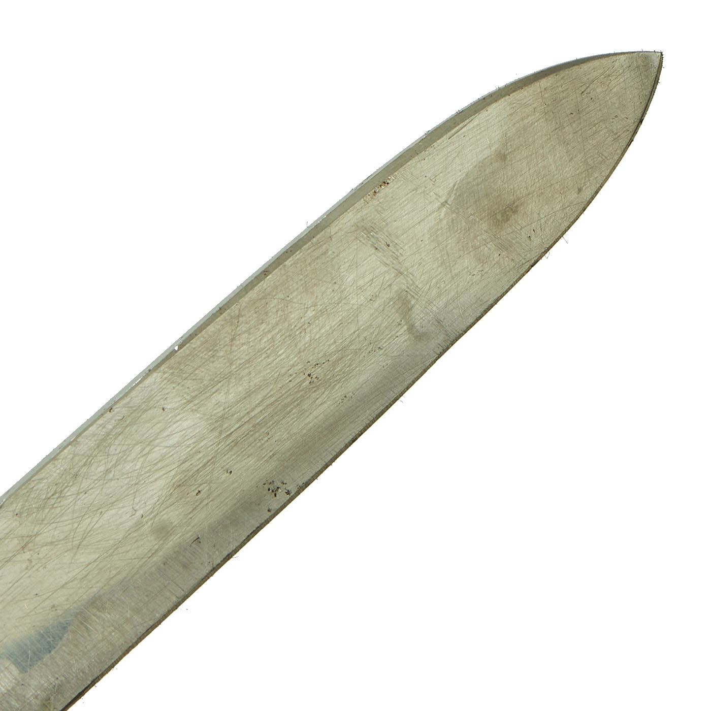 The blade of this knife is in good condition, with a visible trademark logo, and much of the original factory final grind crossgrain visible. It has however been sharpened several times, which has removed probably 1/16" or more from the cutting edge, changing the shape of the blade slightly. It looks like it was sharpened recently and is VERY SHARP, so handle with care. The blades are relatively thin, so long term use would quickly wear away the blade.