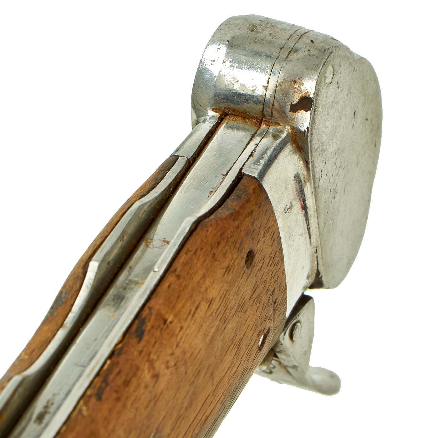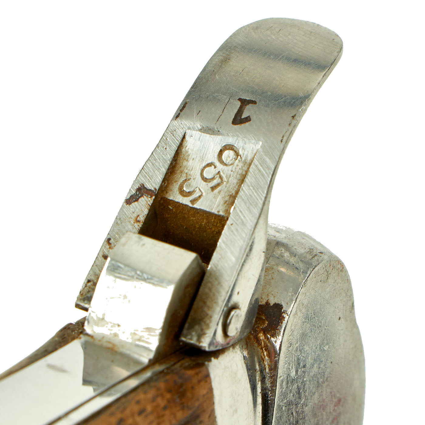 This example of a Type I FJM has fine, stainless steel components. There is a number 5 inside of a Waffen Eagle on the base of the marlin spike. This is the standard Luftwaffe inspection stamp style used throughout the war. It also is marked with assembly number 655 on both parts of the blade release. The leaf spring for the blade release is intact and uncracked, however the spring for the marlinspike has broken off at the lower rivet point, something seen quite commonly on these knives. They were mainly designed for cutting through parachute rigging, so long term durability was not of a major concern. While the marlinspike swings freely, the blade still properly locks into place in the open place, retracting when the latch is used again.