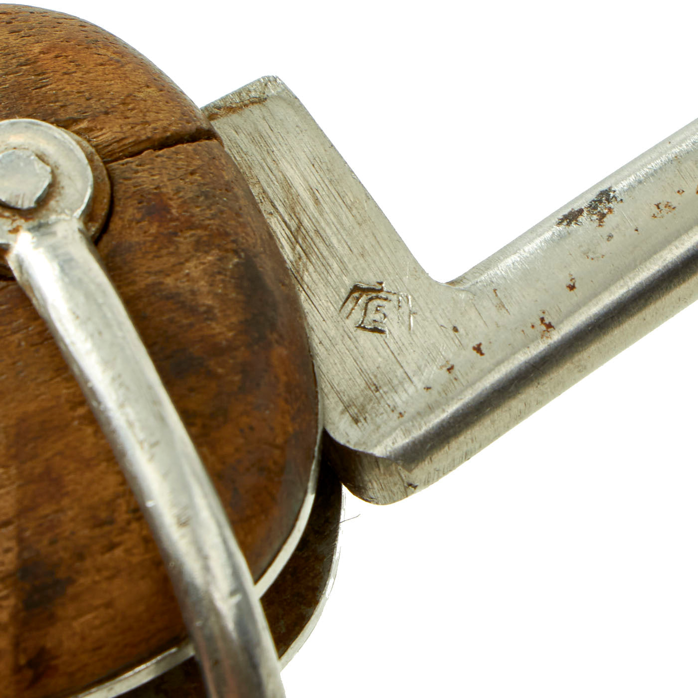 Original Item: Only One Available. This is a nice example of an early-war produced Type I version of the legendary Luftwaffe Fallschirmjäger-Messer, or German air force paratrooper knife (FJM or FKm). It was produced by Solinger Metalwaren-Fabrik Stöcker & Co. GmbH, also known as SMF, who were one of the major producers of this knife during WWII. Their "Seated King" over Solingen trademark is seen on the blade, as well as ROSTFREI (rust free) indicating stainless steel construction of the 4 inch long blade. Solingen is known as the "City of Blades" and has a centuries-old history of edged weapon production.