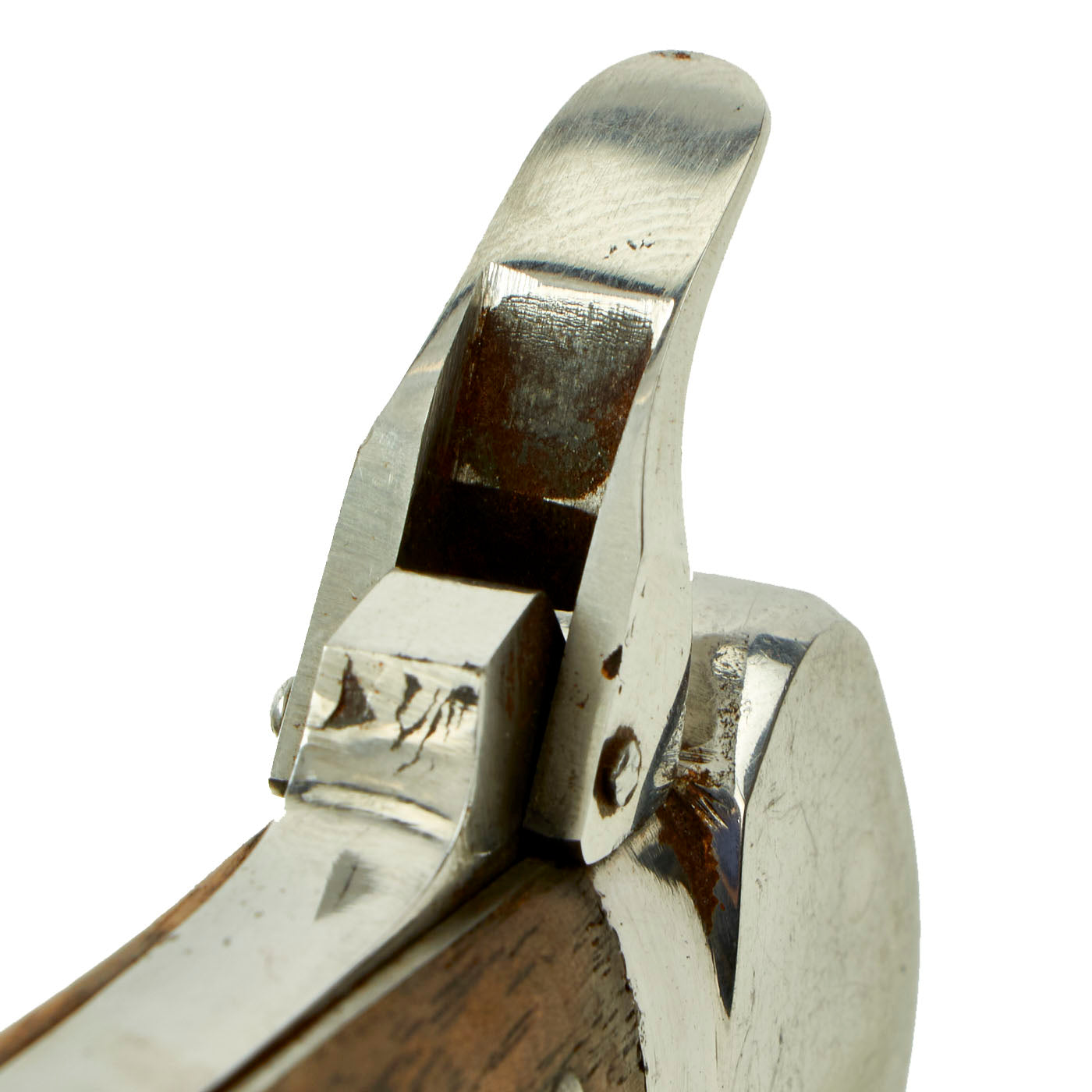 The grip plates are of walnut with the standard four retaining rivets. These plates are in very good condition throughout, with no major cracks or chips, just a few light dents and stains.