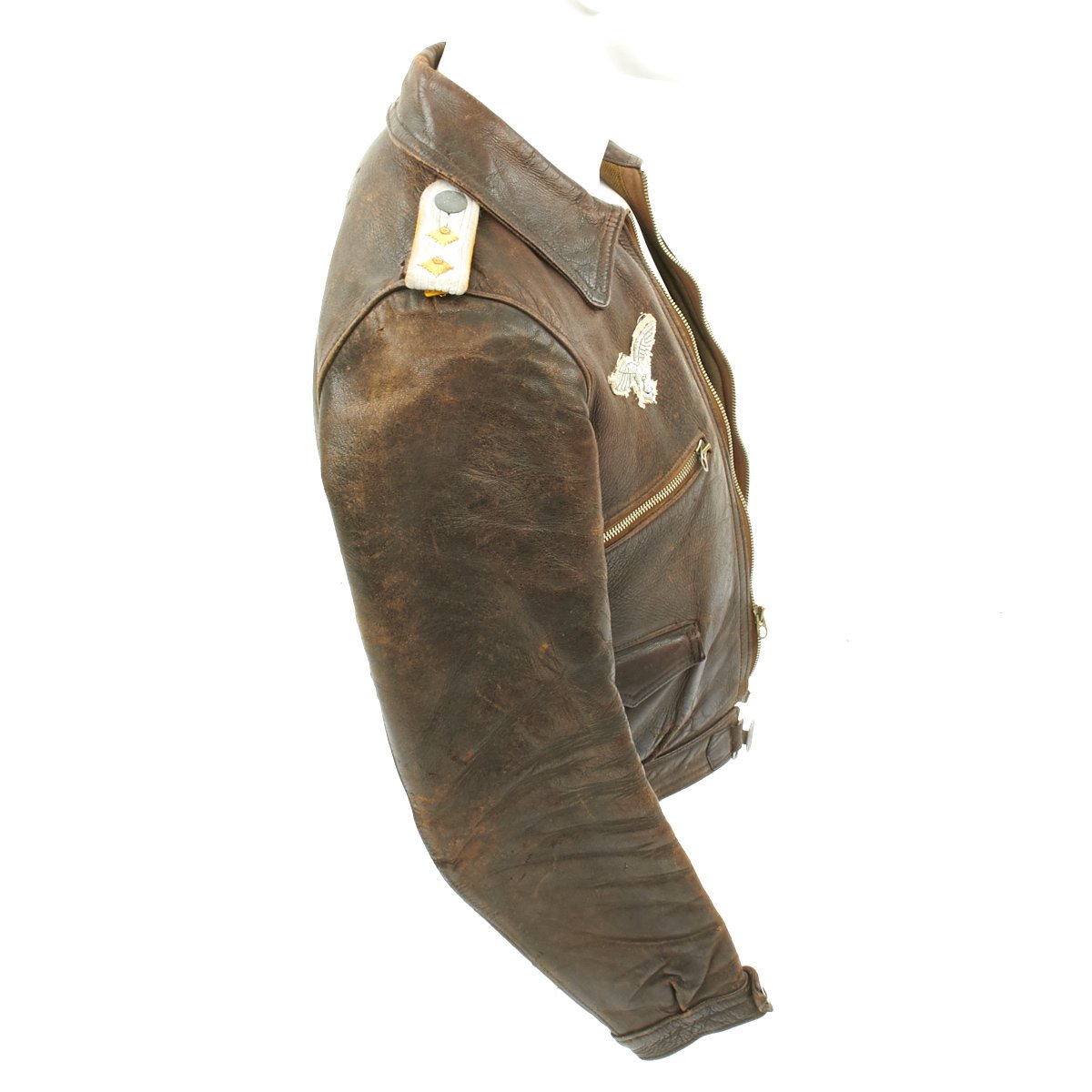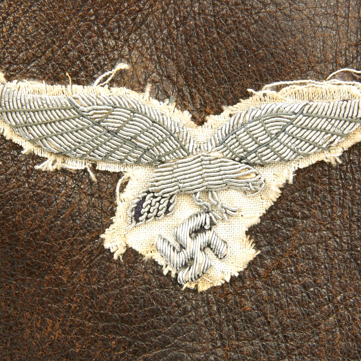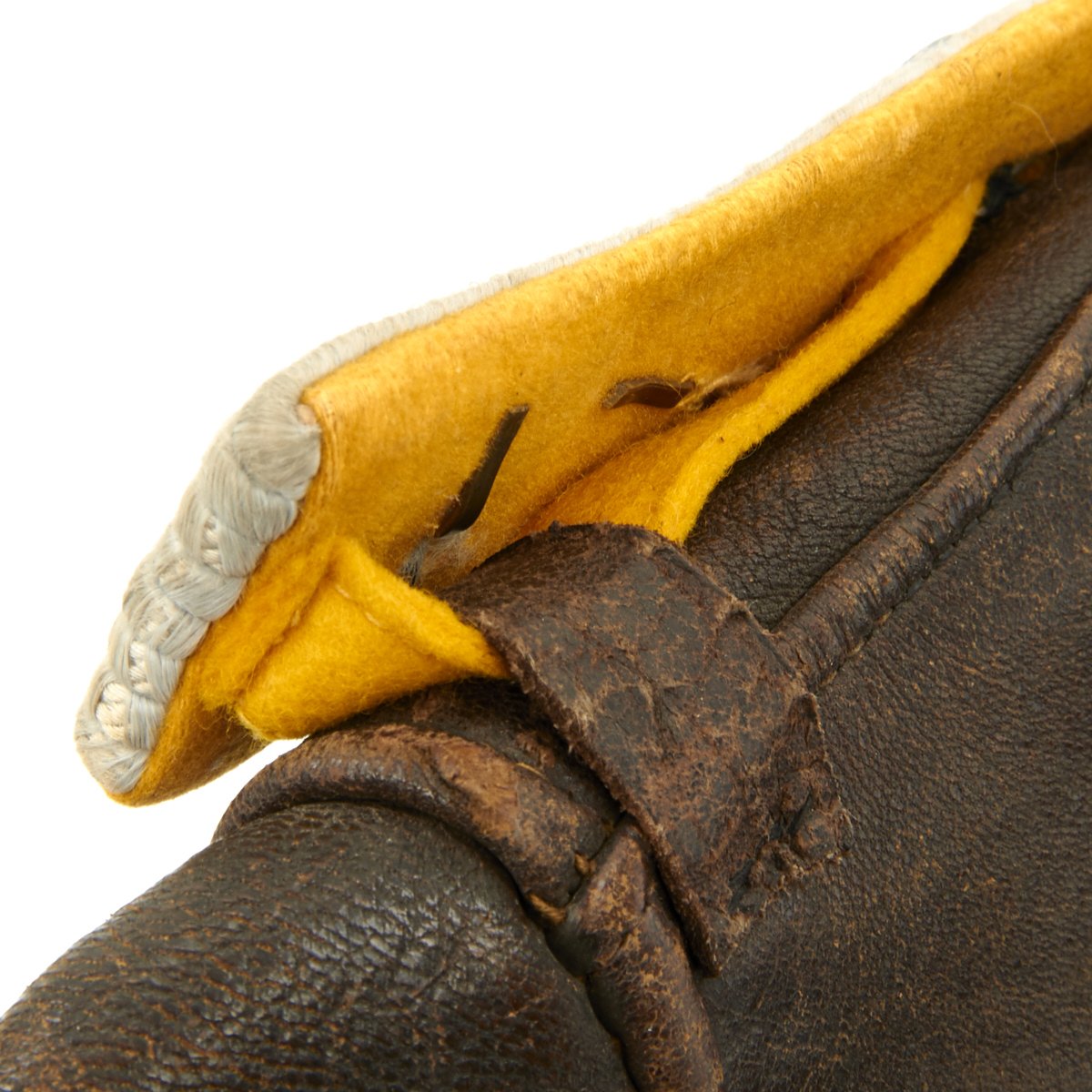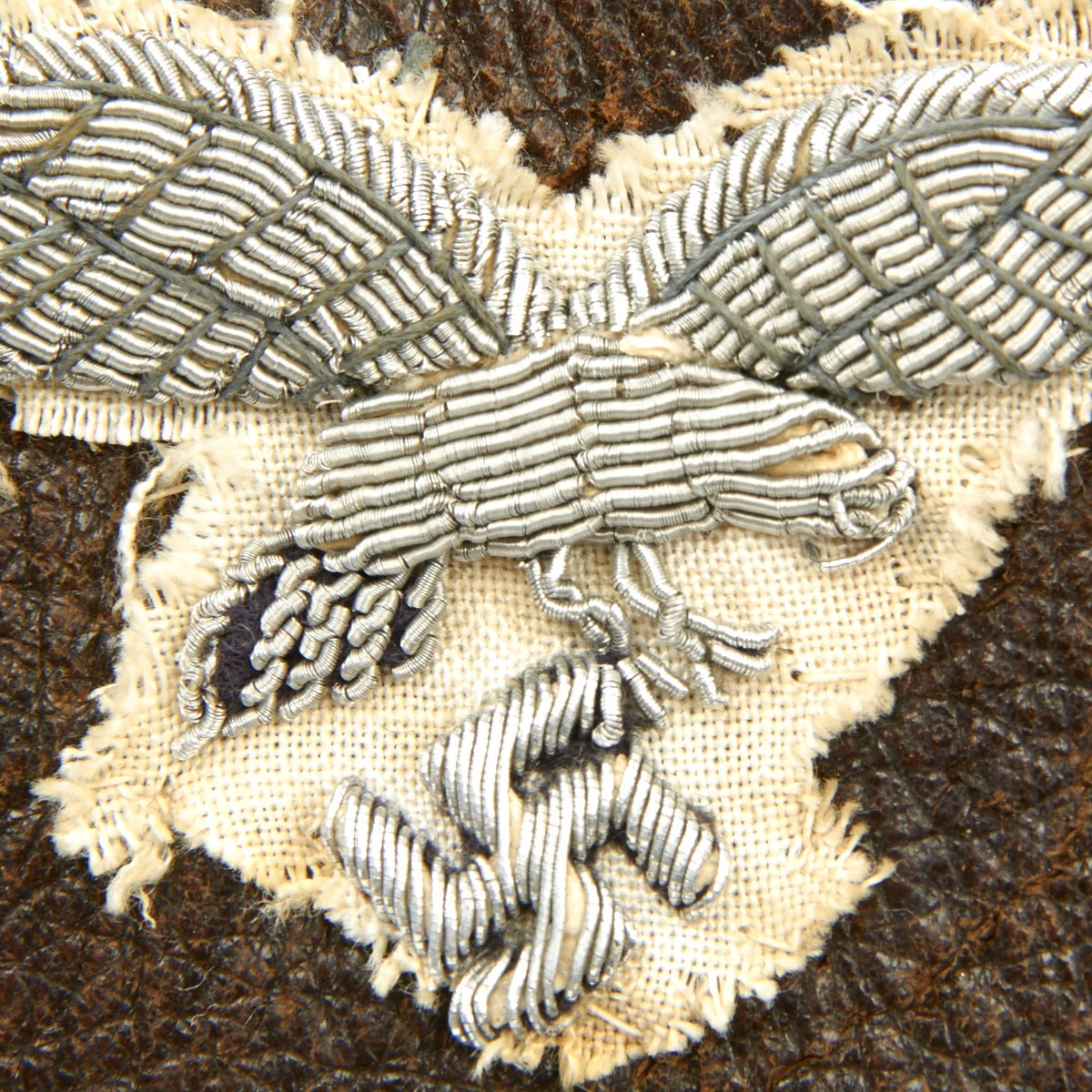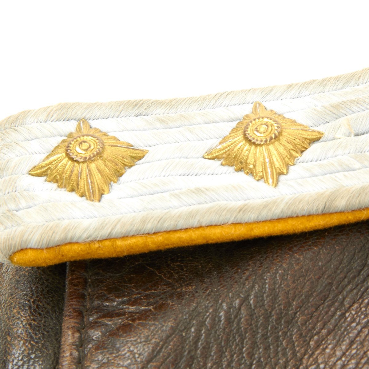 Slip on loops and buttons for shoulder boards, complete with two matching Hauptmann (Captain) epaulets with fine silver/aluminum wire over dark yellow wool bases. Right breast features a hand embroidered silver bullion Luftwaffe eagle with white linen backing which has been hand-stitched to the leather.