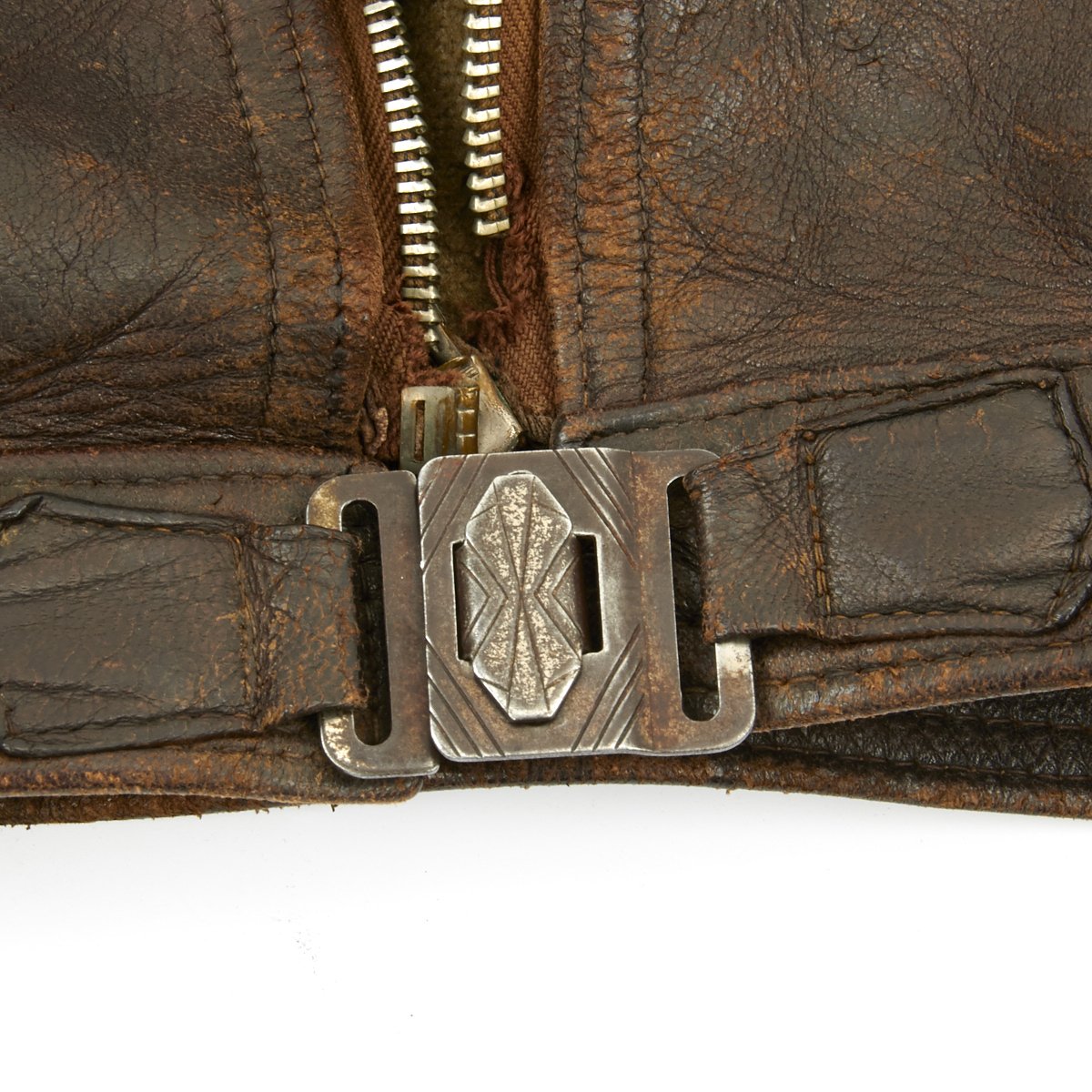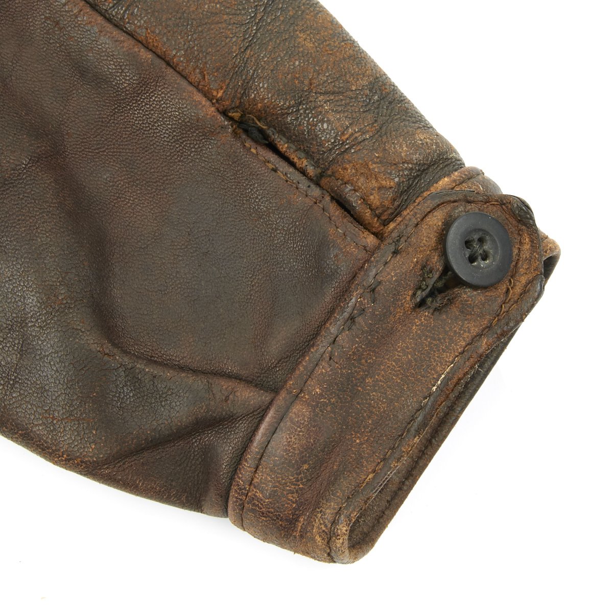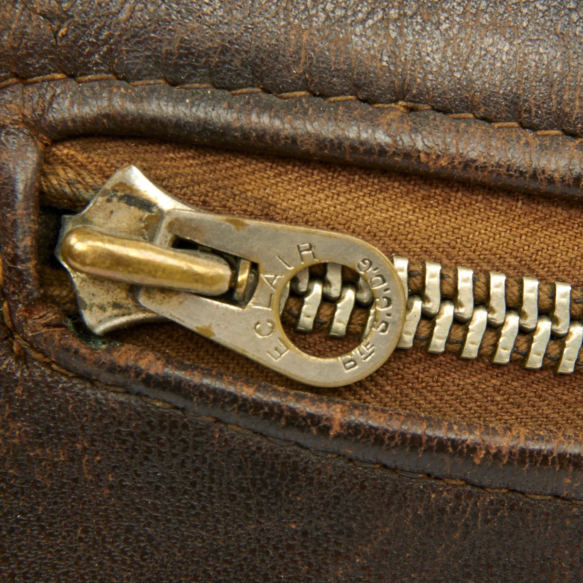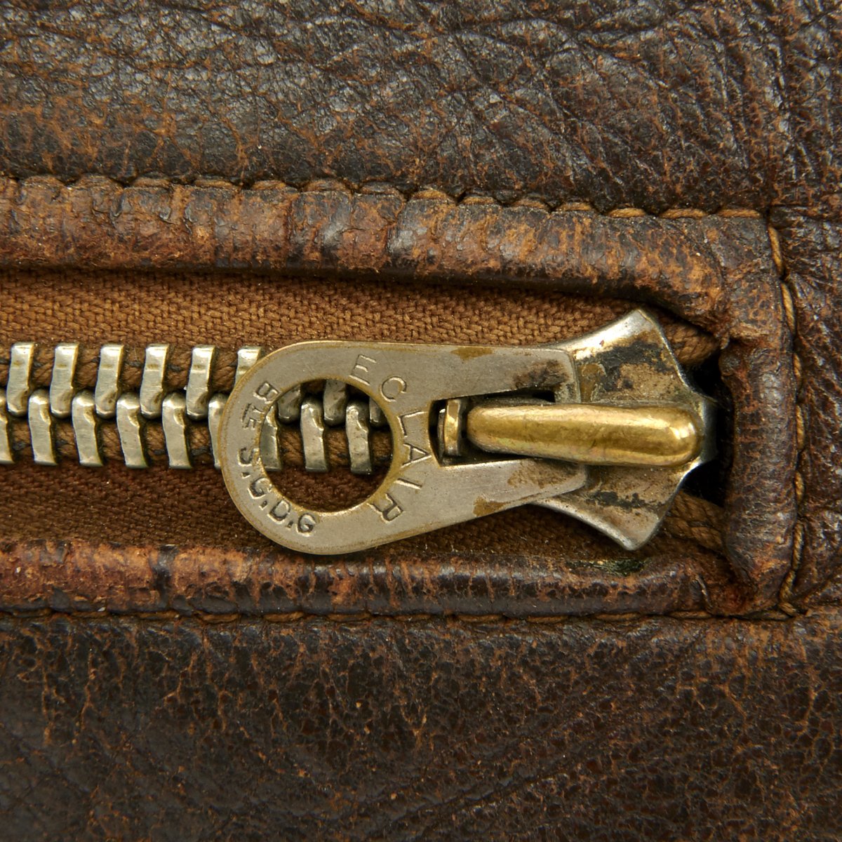 This example is a very high quality, French made private purchase, non-regulation, multi-panel chocolate brown leather construction fully lined, waist length, flight jacket with a lay down collar. The jacket features a vertical, front, zipper closure by ECLAIR. Zipper is broken at the base but otherwise complete. The jacket has two horizontal slash breast pockets with zippers both by ECLAIR. There are two waist pockets with scalloped leather cover flaps. The straight cut, non-adjustable, sleeves have a short vertical slash to the outside sleeve seams with a single snap closure to the cuffs with baeklite buttons.