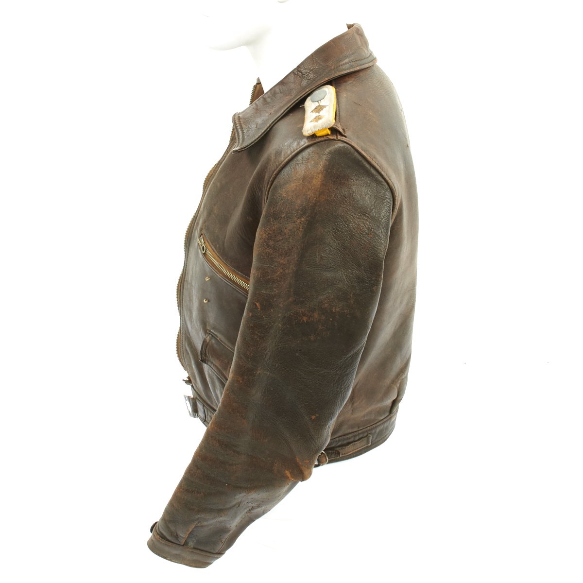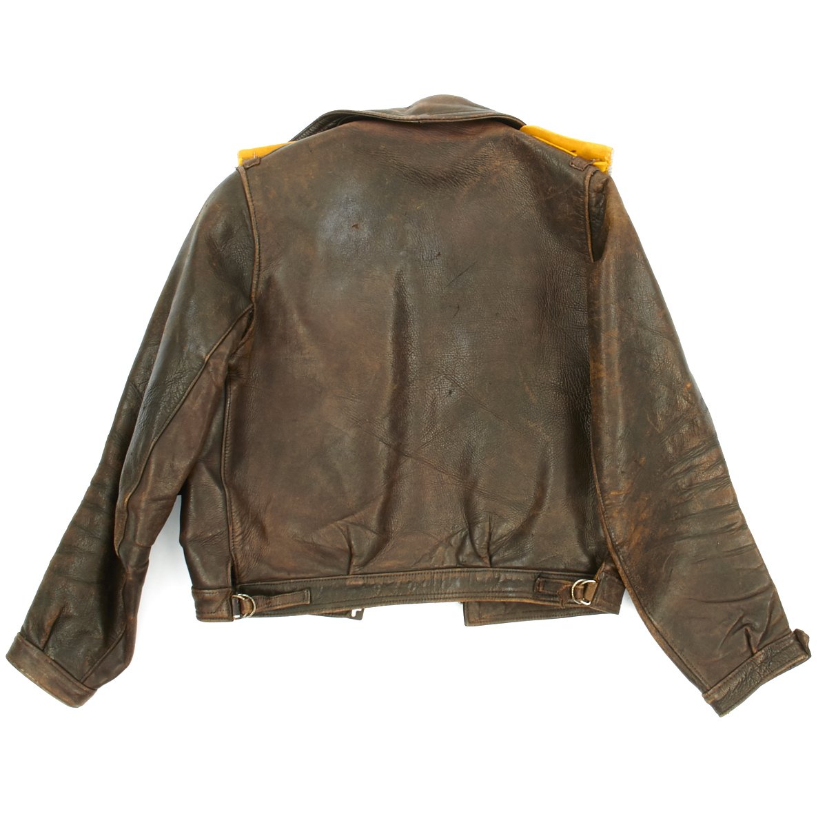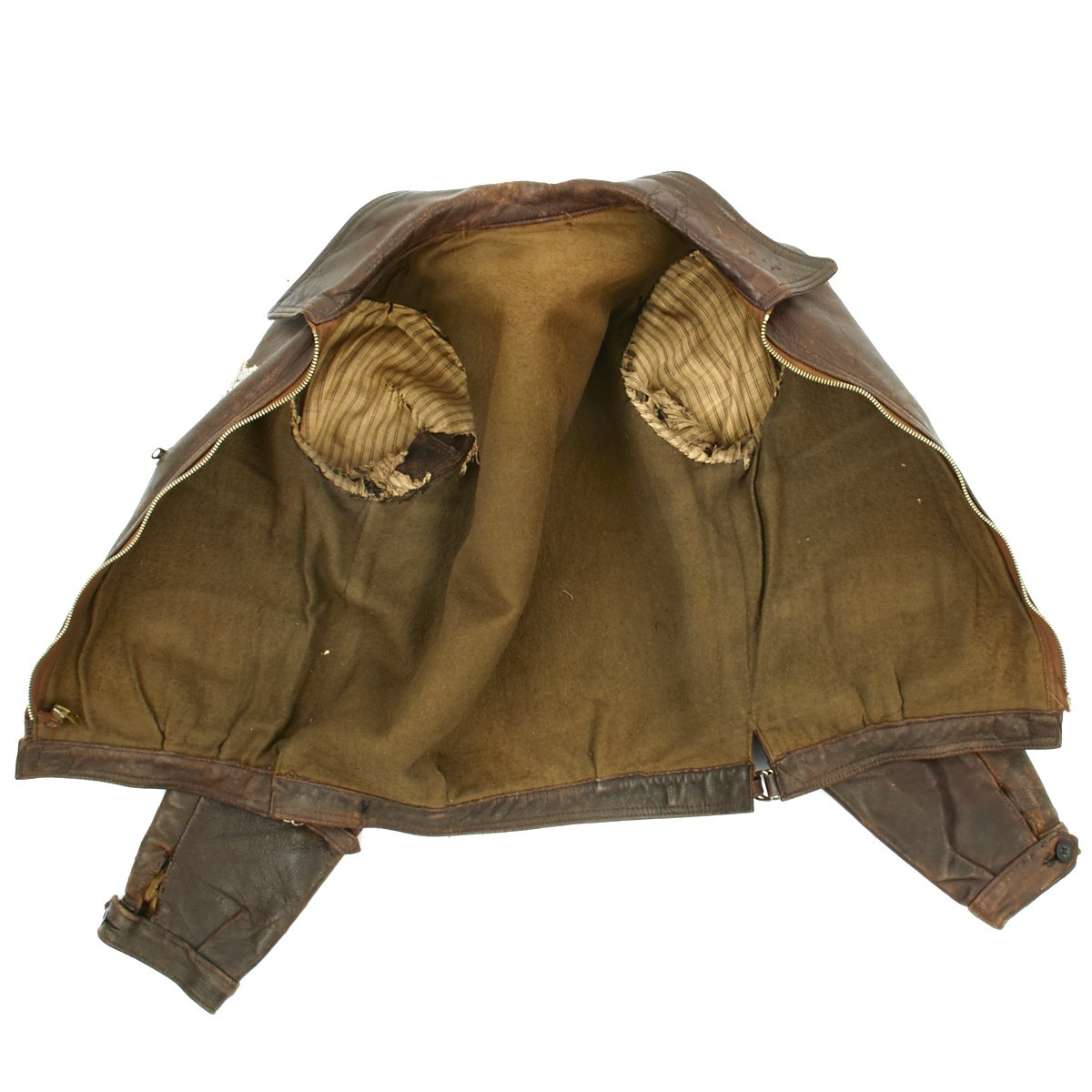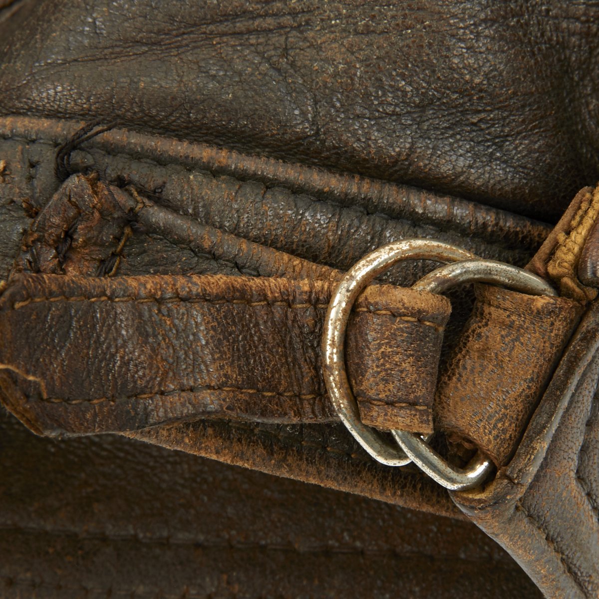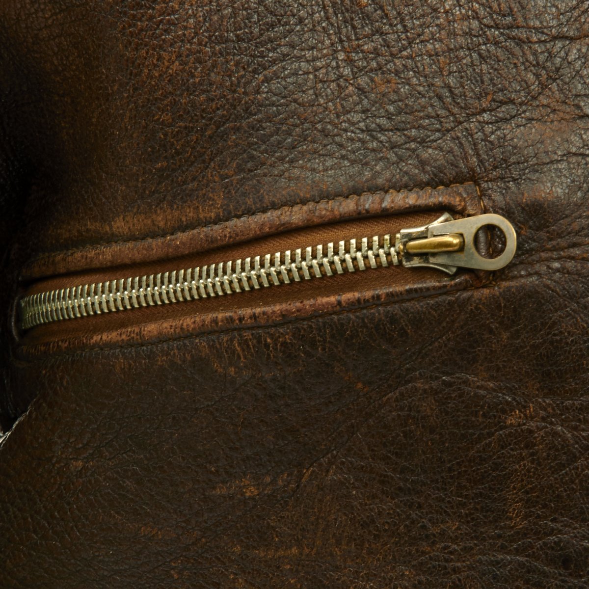 This example is a very high quality, French made private purchase, non-regulation, multi-panel chocolate brown leather construction fully lined, waist length, flight jacket with a lay down collar. The jacket features a vertical, front, zipper closure by ECLAIR. Zipper is broken at the base but otherwise complete. The jacket has two horizontal slash breast pockets with zippers both by ECLAIR. There are two waist pockets with scalloped leather cover flaps. The straight cut, non-adjustable, sleeves have a short vertical slash to the outside sleeve seams with a single snap closure to the cuffs with baeklite buttons.