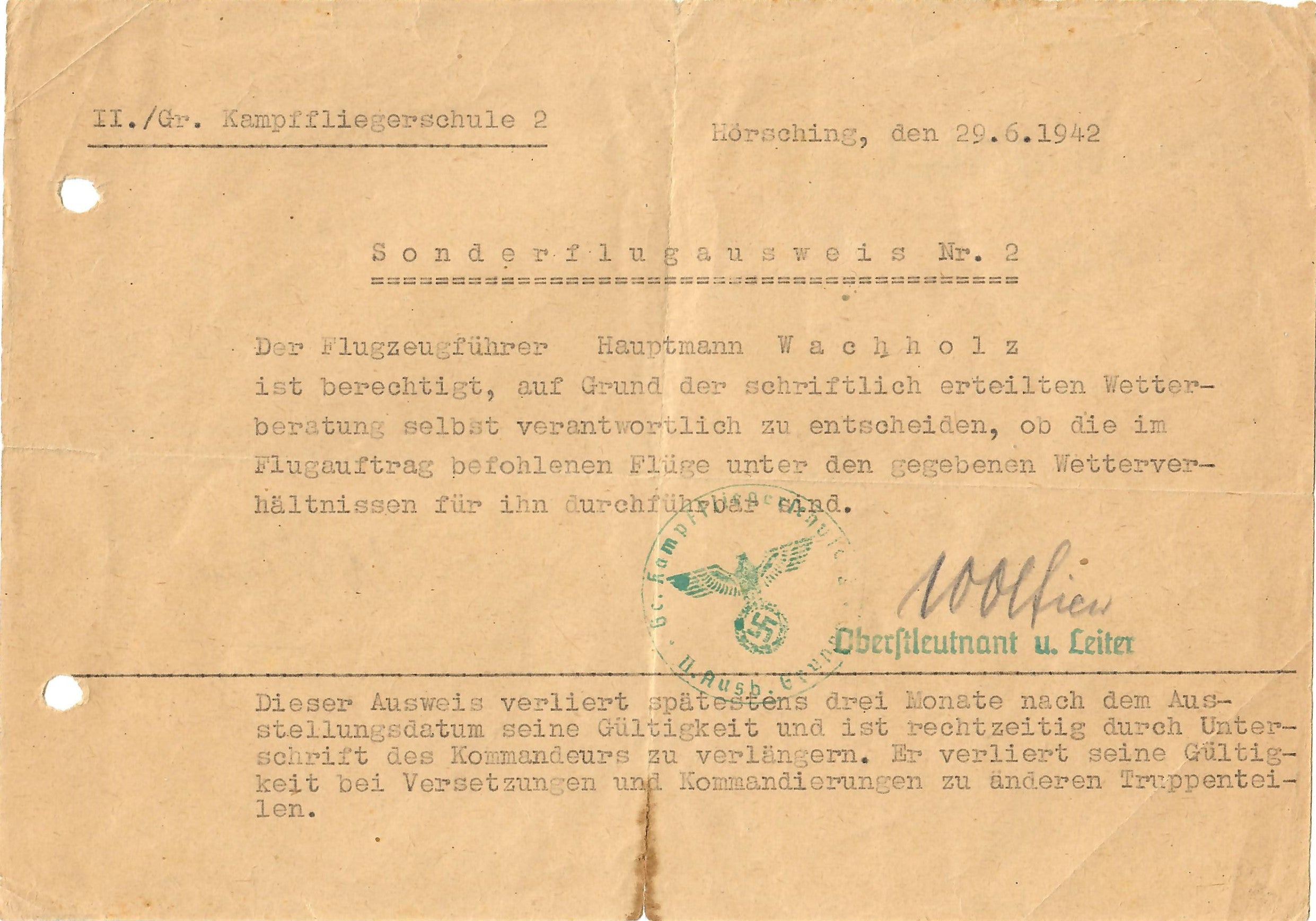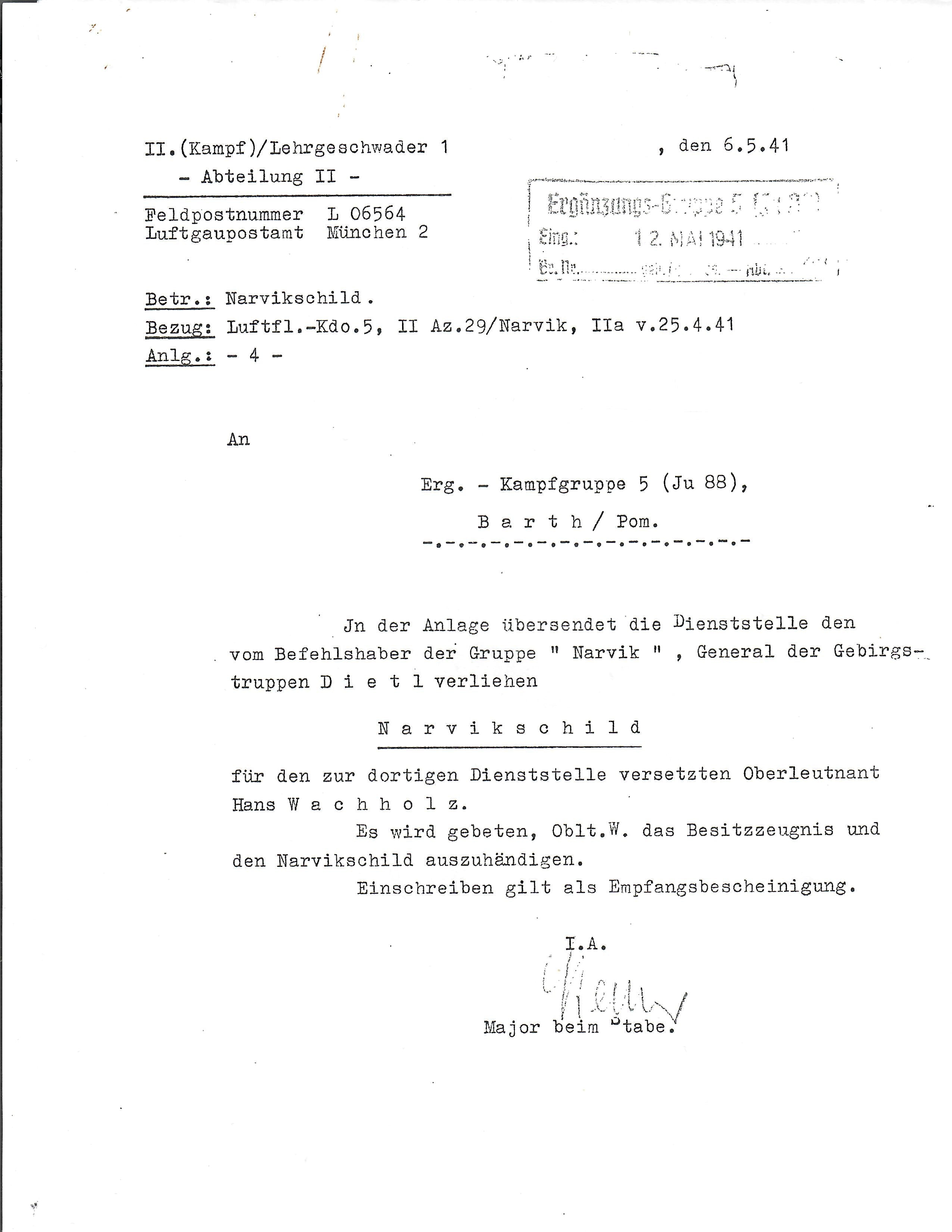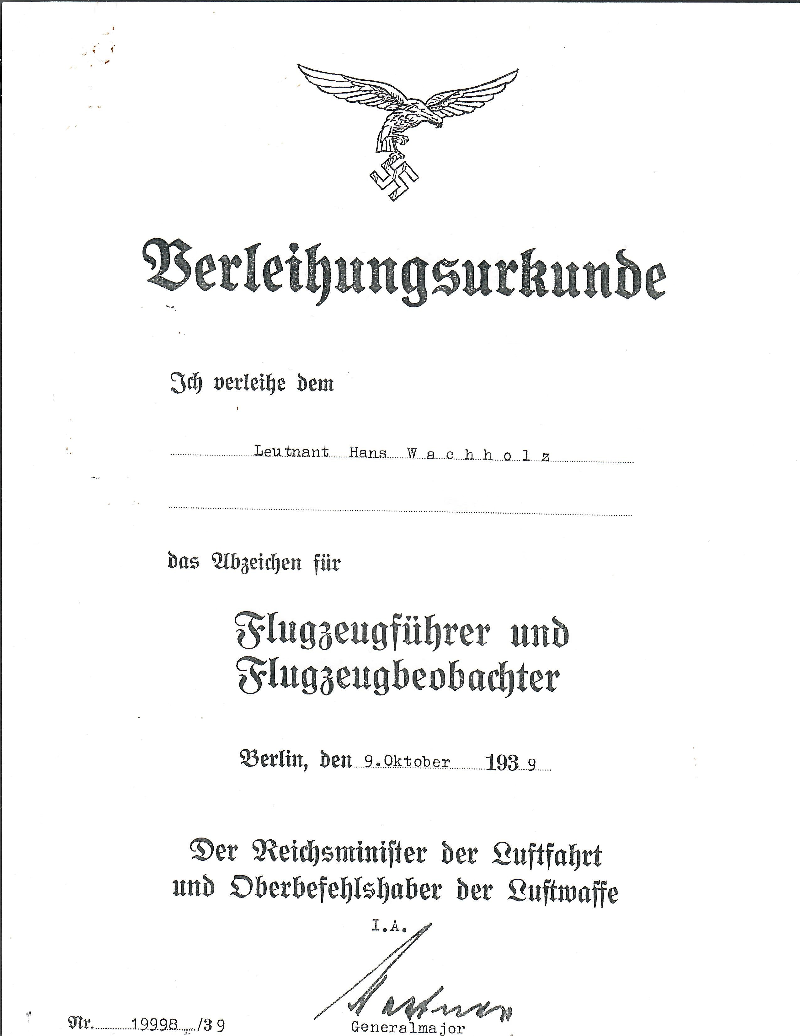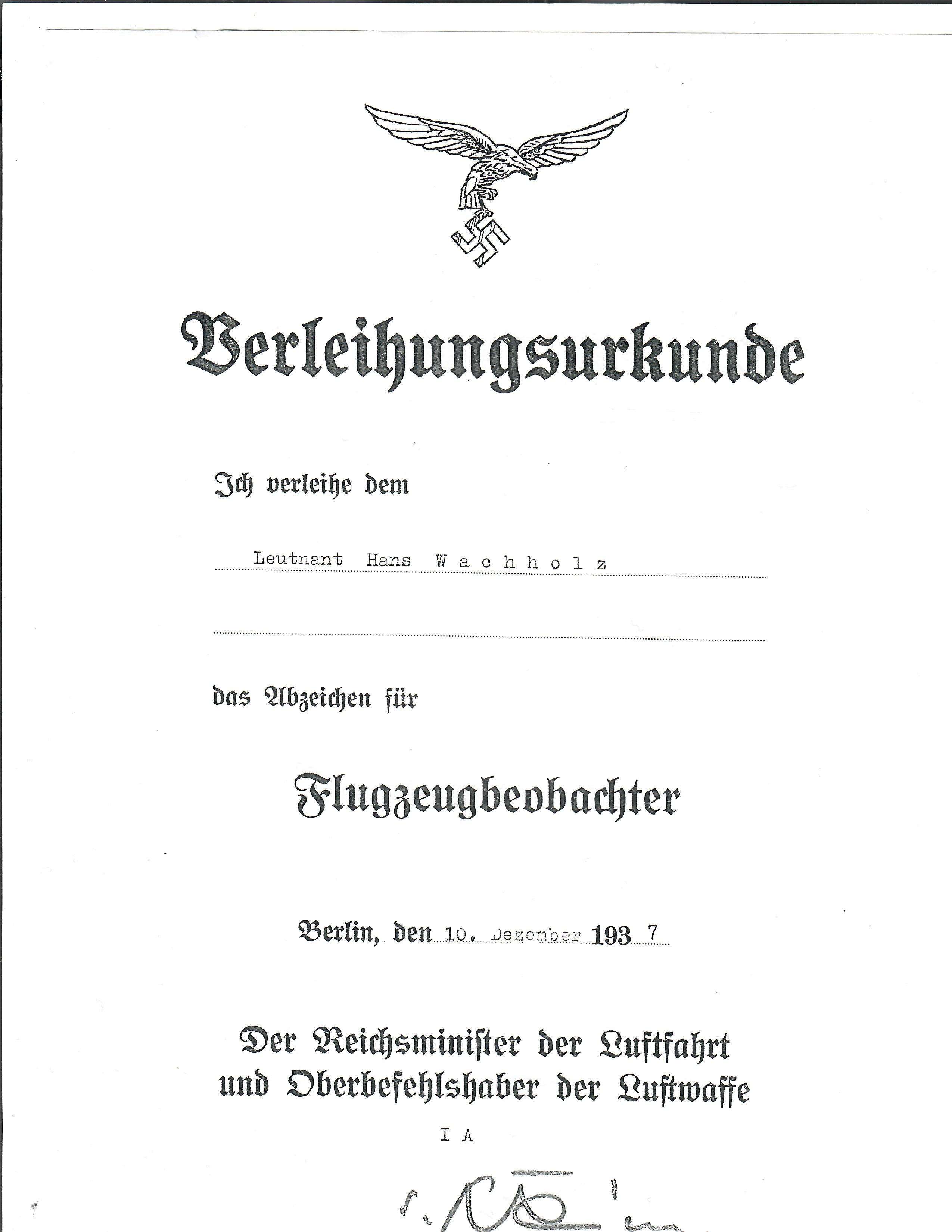 The included documents tell much of the story of Wachholz's service during the pre-war and wartime period. They include award certificates or photocopies for the Wehrmacht Long Service Award 4th class, Luftwaffe Pilot's Badge, Sudetenland Medal, Luftwaffe Combined Pilot / Observer badge, Narvik Shield, and Eastern Front Medal. There is also an ID card with a photograph of Wachholz, an official order, and some other material. There is also a typed history of what we know of his service. Please see the photographs for scanned details.