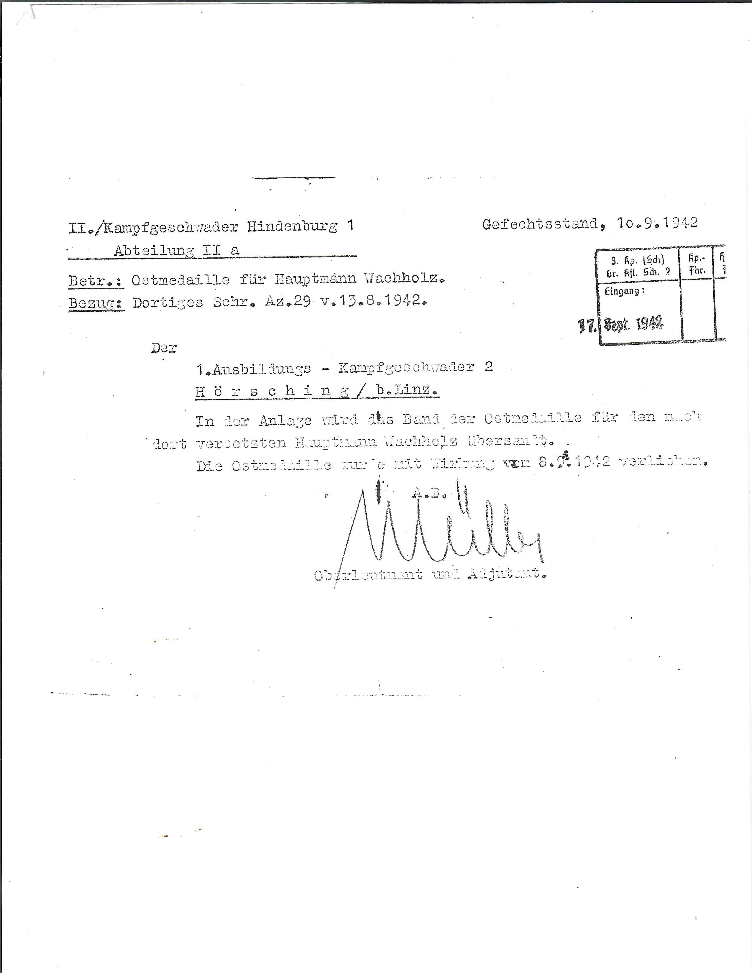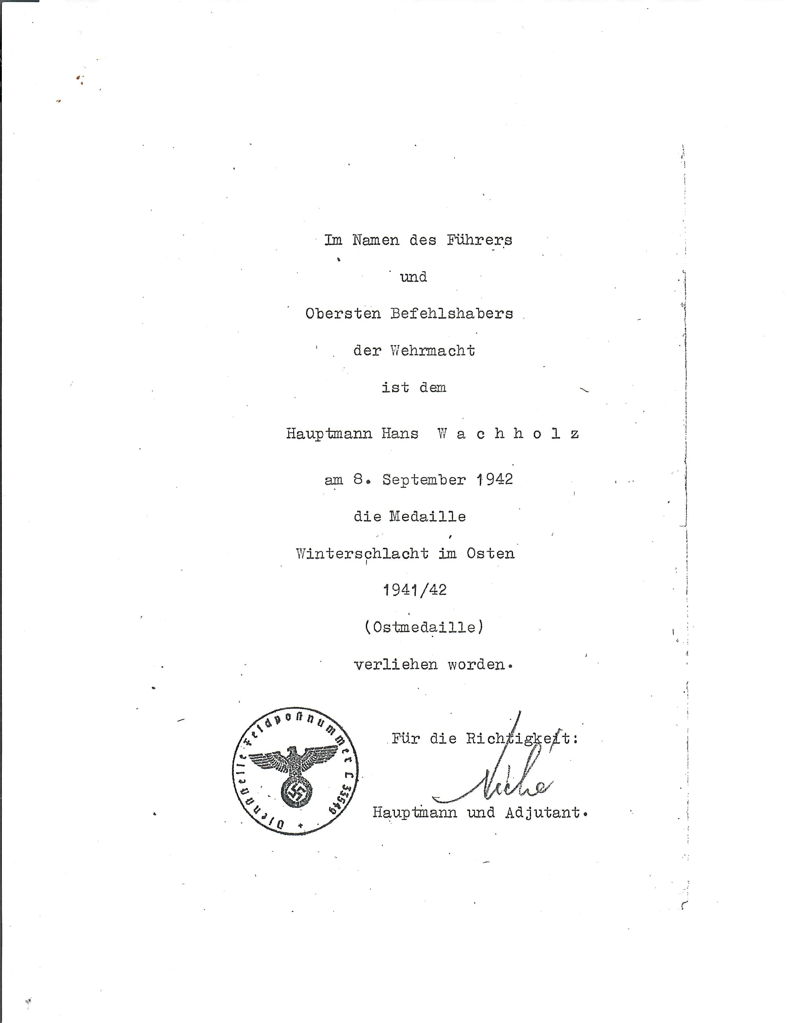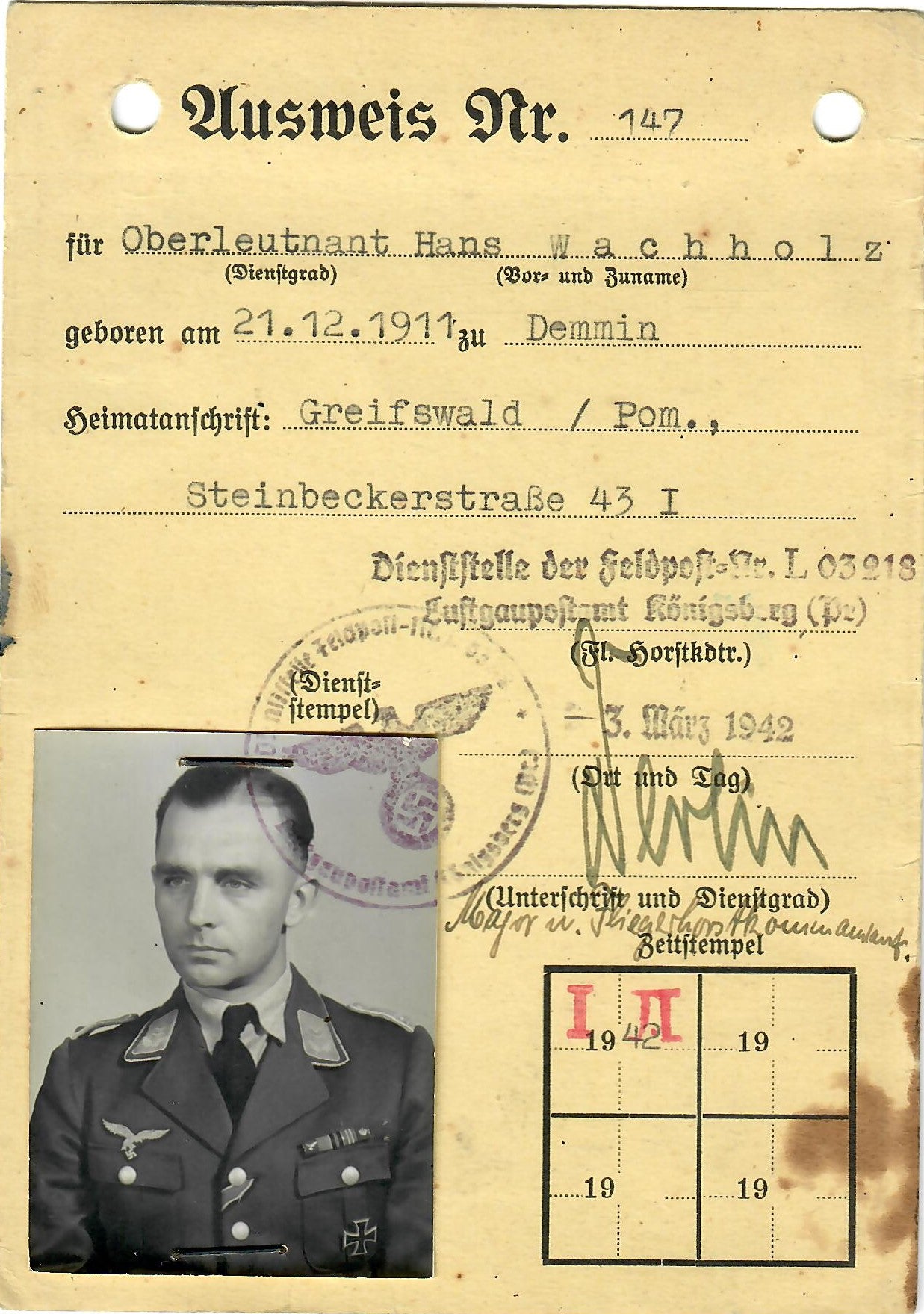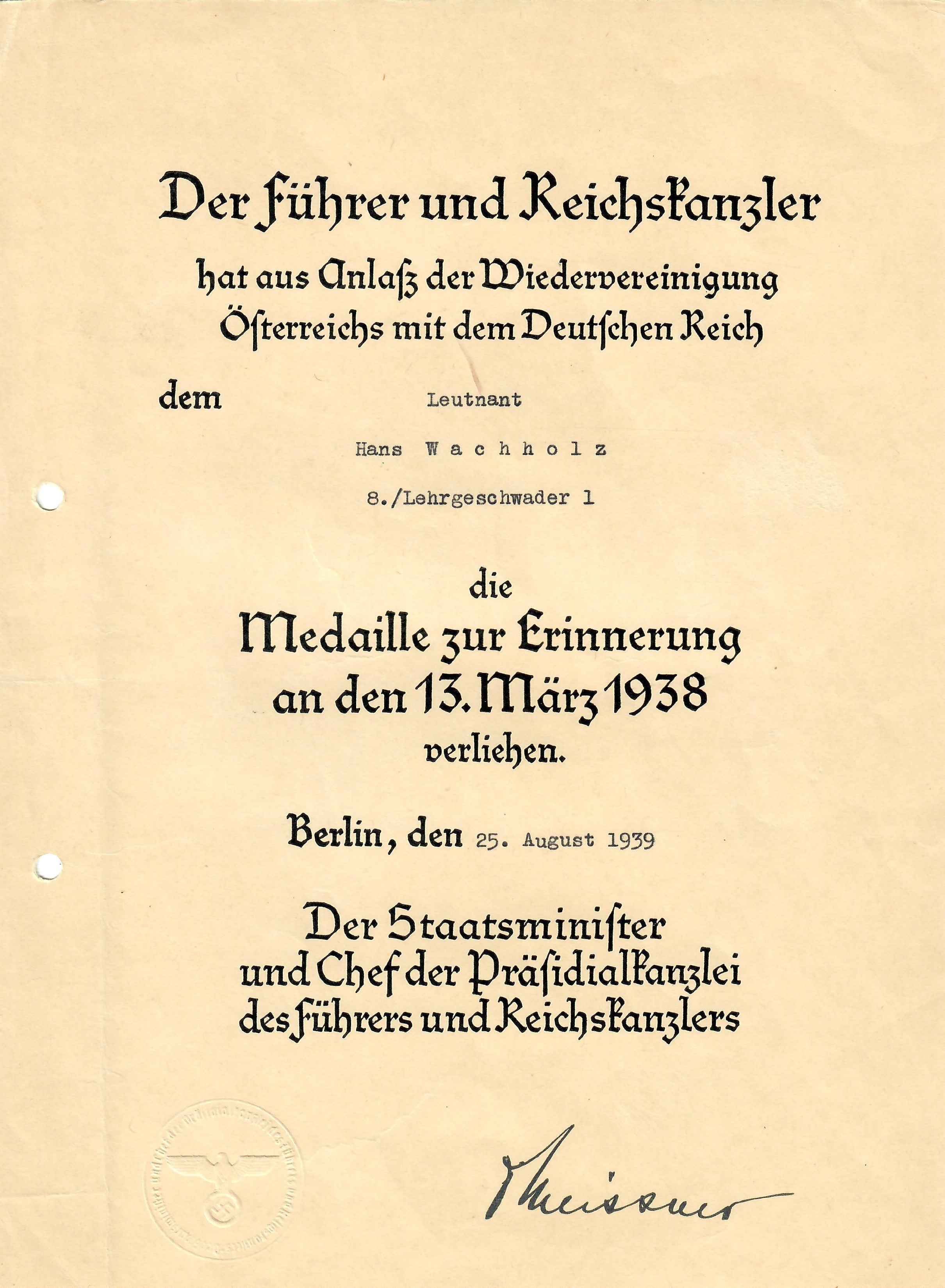 The included documents tell much of the story of Wachholz's service during the pre-war and wartime period. They include award certificates or photocopies for the Wehrmacht Long Service Award 4th class, Luftwaffe Pilot's Badge, Sudetenland Medal, Luftwaffe Combined Pilot / Observer badge, Narvik Shield, and Eastern Front Medal. There is also an ID card with a photograph of Wachholz, an official order, and some other material. There is also a typed history of what we know of his service. Please see the photographs for scanned details.