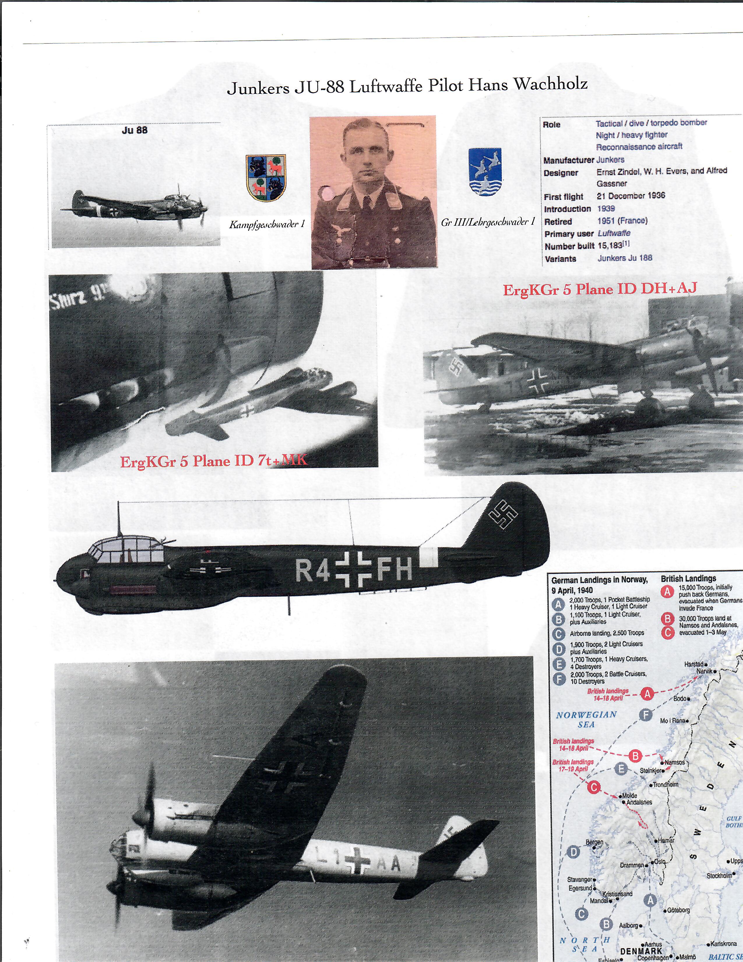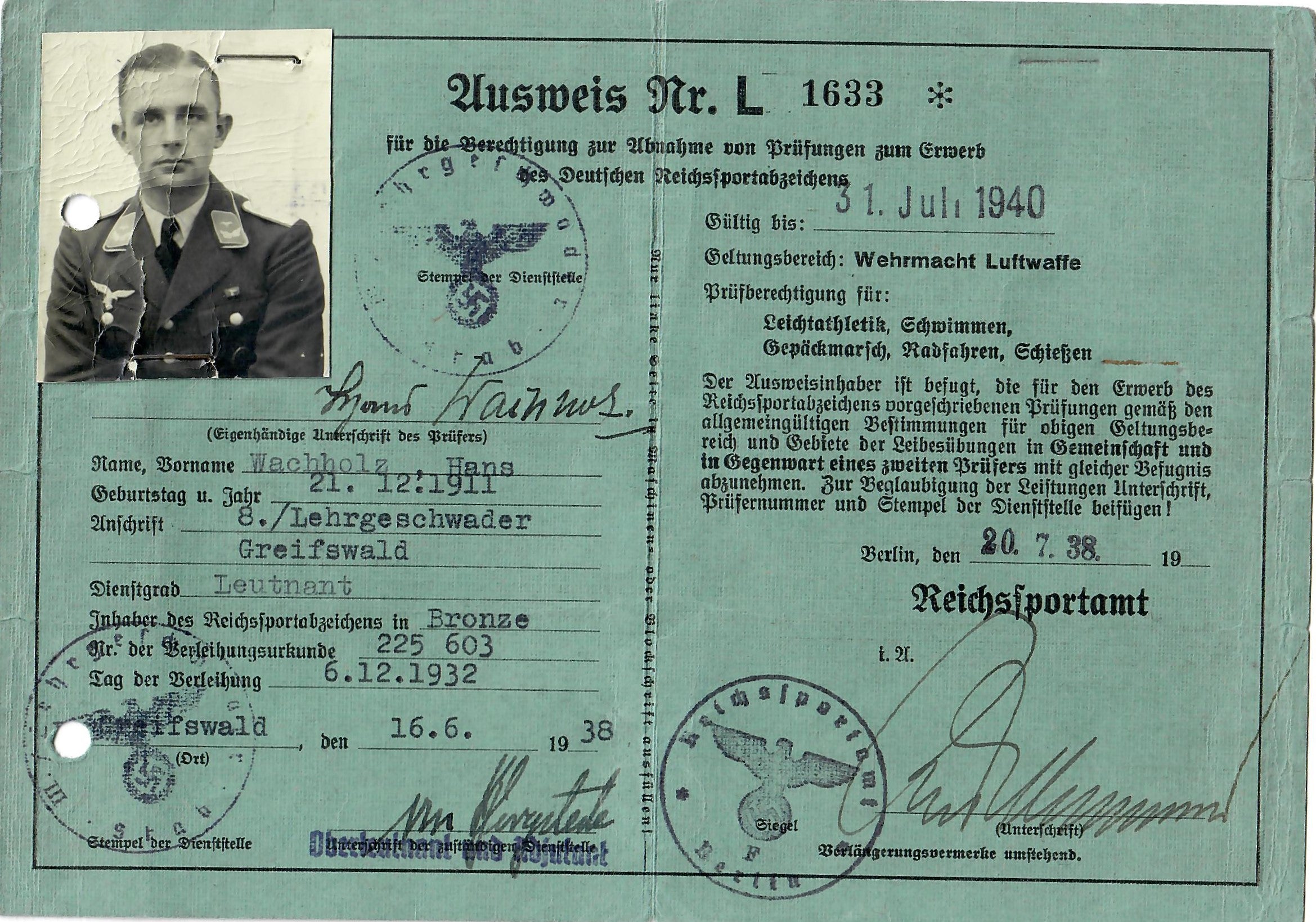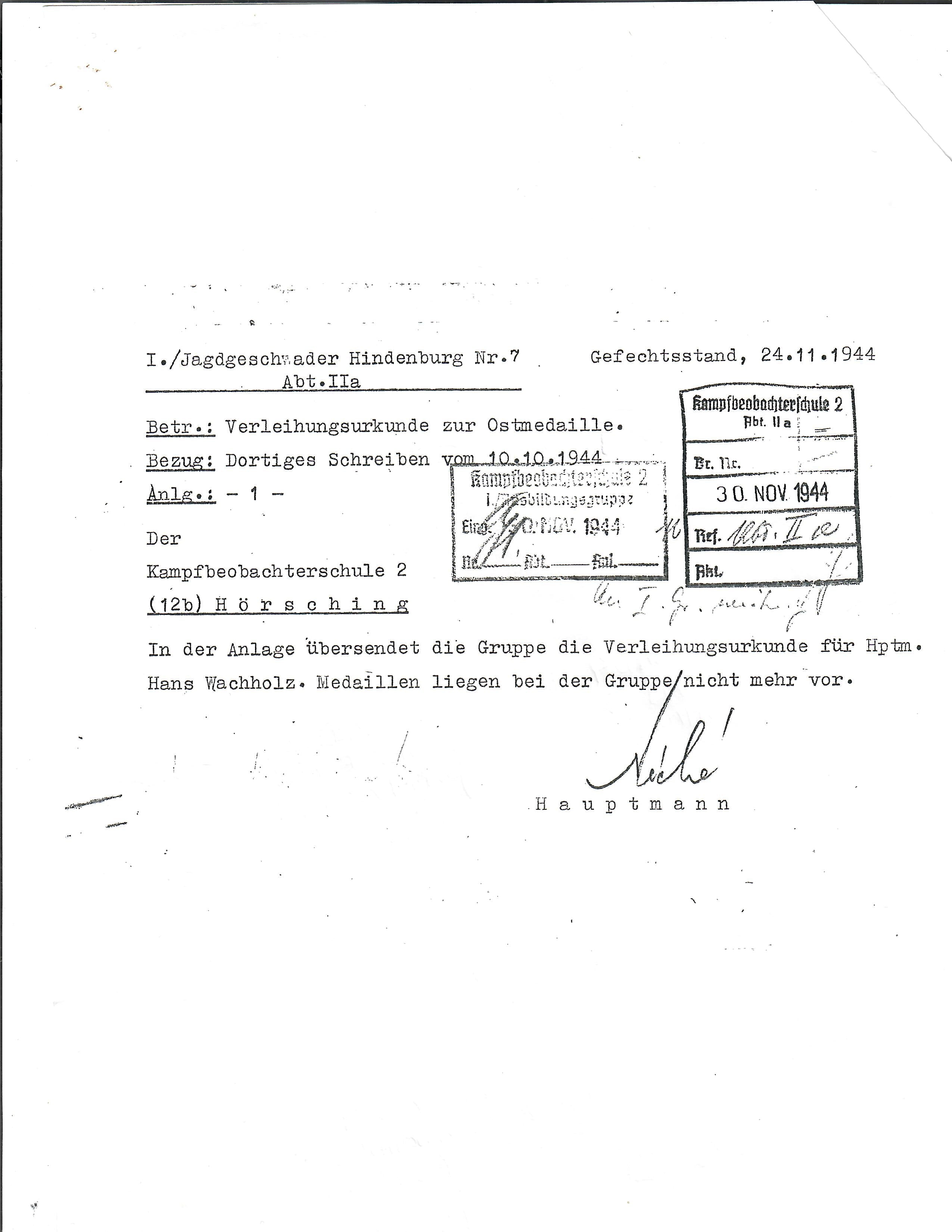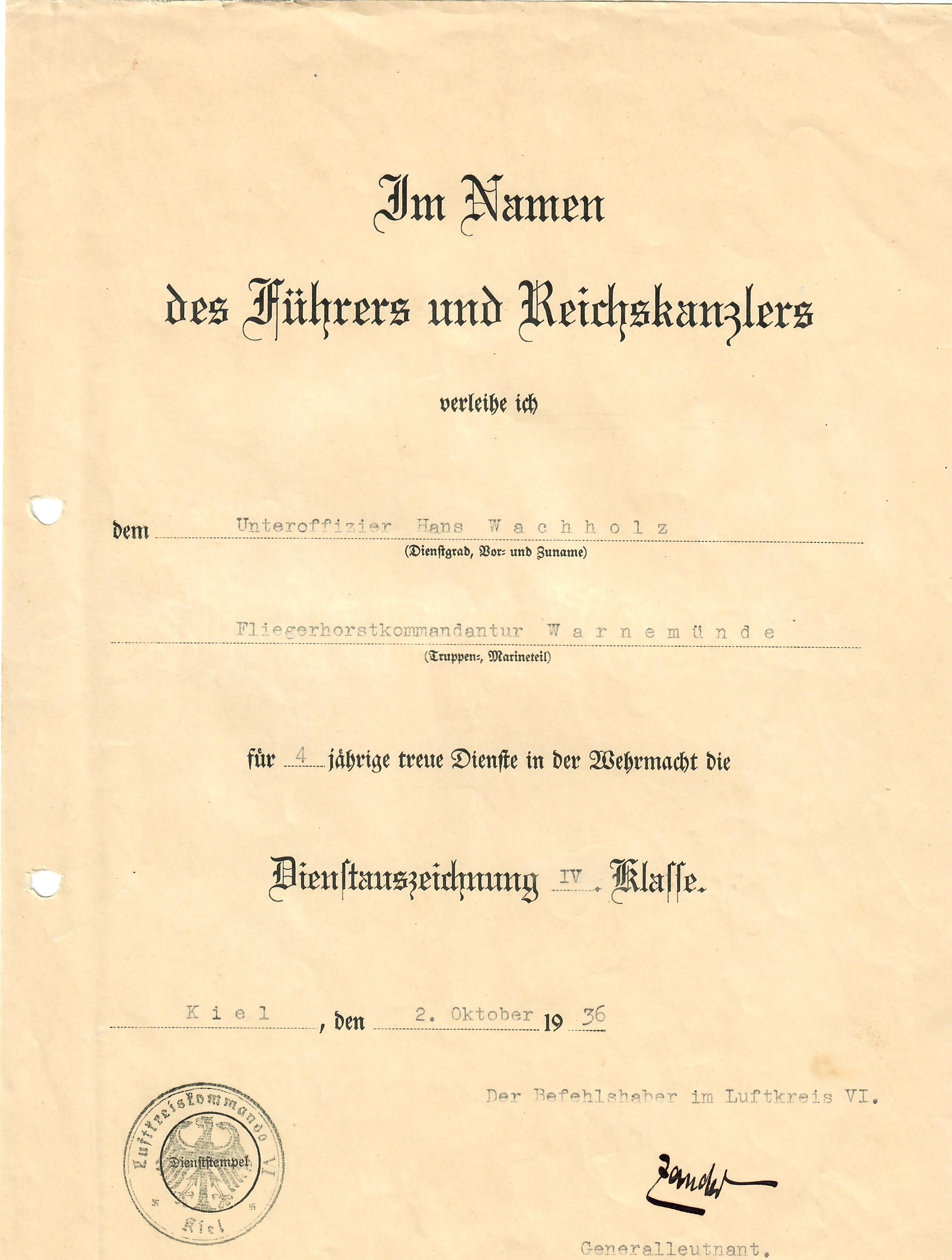 The included documents tell much of the story of Wachholz's service during the pre-war and wartime period. They include award certificates or photocopies for the Wehrmacht Long Service Award 4th class, Luftwaffe Pilot's Badge, Sudetenland Medal, Luftwaffe Combined Pilot / Observer badge, Narvik Shield, and Eastern Front Medal. There is also an ID card with a photograph of Wachholz, an official order, and some other material. There is also a typed history of what we know of his service. Please see the photographs for scanned details.