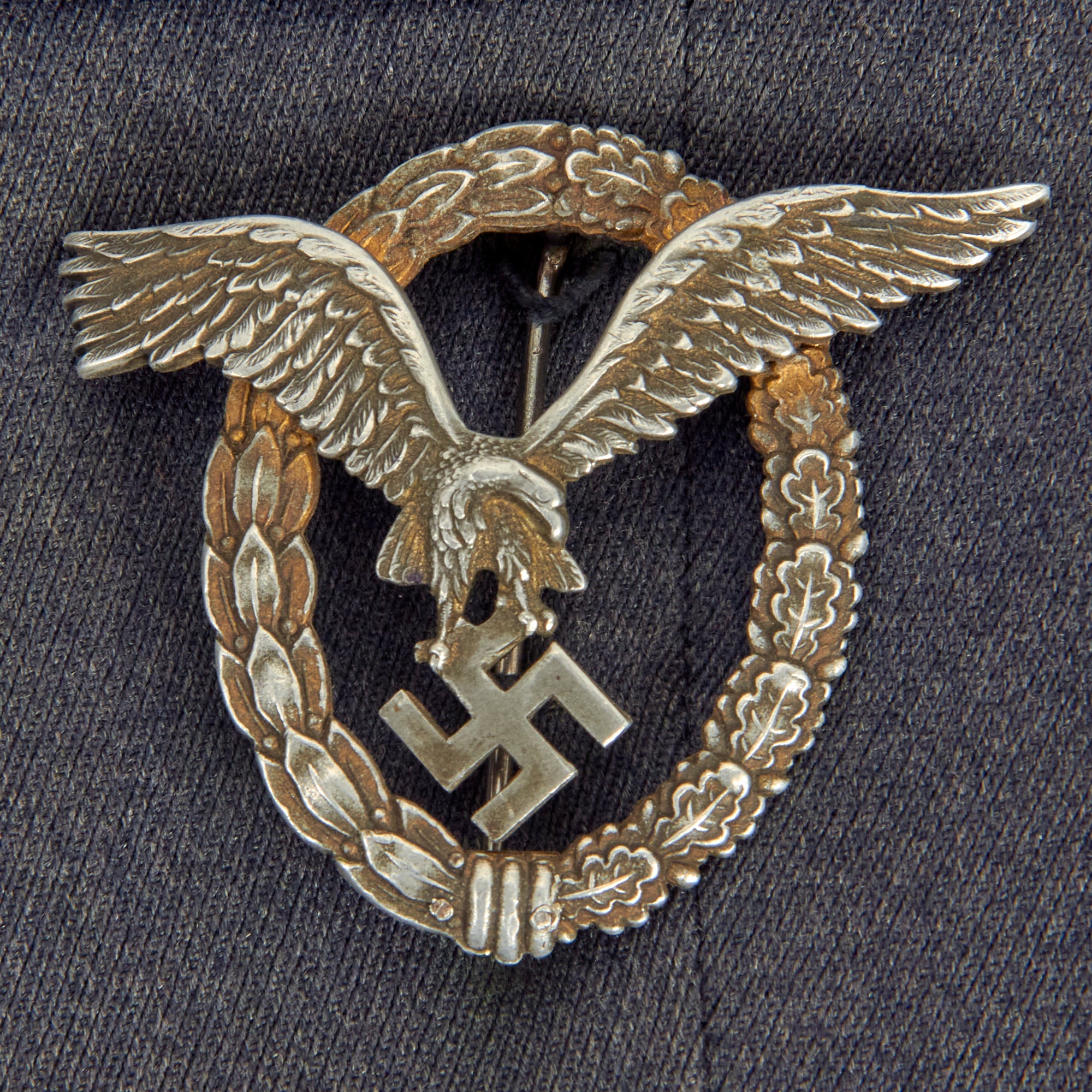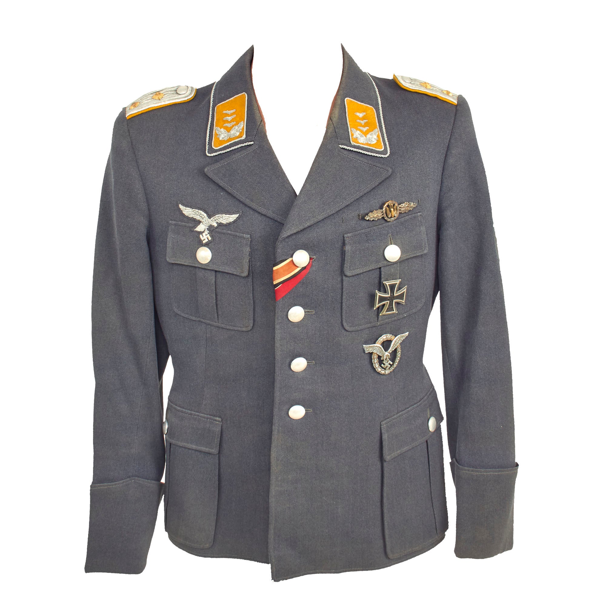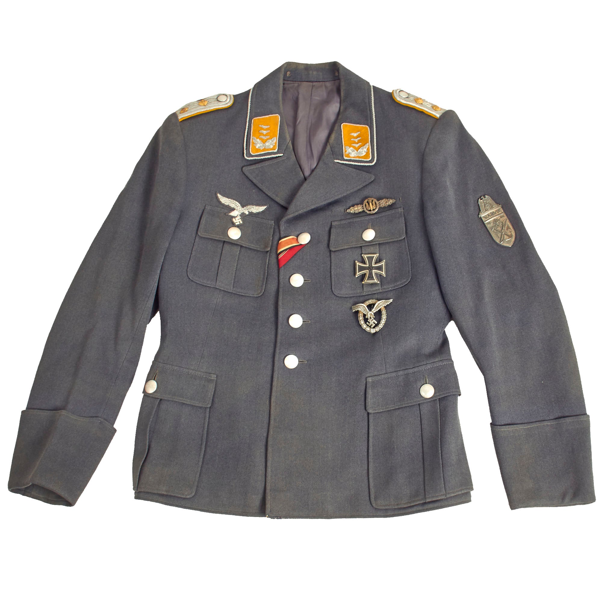 The Luftwaffe, the air force of the German military during the Third Reich, was established in 1935. Over the next 10 years, Luftwaffe troops wore a huge variety of uniforms. Enlisted men generally wore uniforms issued from military depots. Most enlisted soldiers had wool trousers and a short jacket with two internal lower pockets, called a Fliegerbluse, as well as a dressier 4-pocket tunic, the Tuchrock. Officers wore the same general uniform styles, but as officers had to supply their own uniforms, they usually wore tailor made versions. There were also myriad varieties of specialized uniforms worn by certain units or in specific situations, from the tuxedo-style “gala” formal wear uniform of the pre-war period, to the plain coveralls worn by crews of anti-aircraft cannons. There were work uniforms, tropical and summer uniforms, and camouflage clothing for airborne troops and other Luftwaffe soldiers in ground combat. Flight crews had their own specialized gear, including leather jackets and warm, electrically heated suits. Most but not all Luftwaffe uniform jackets bore the Luftwaffe emblem of a flying eagle holding a swas.