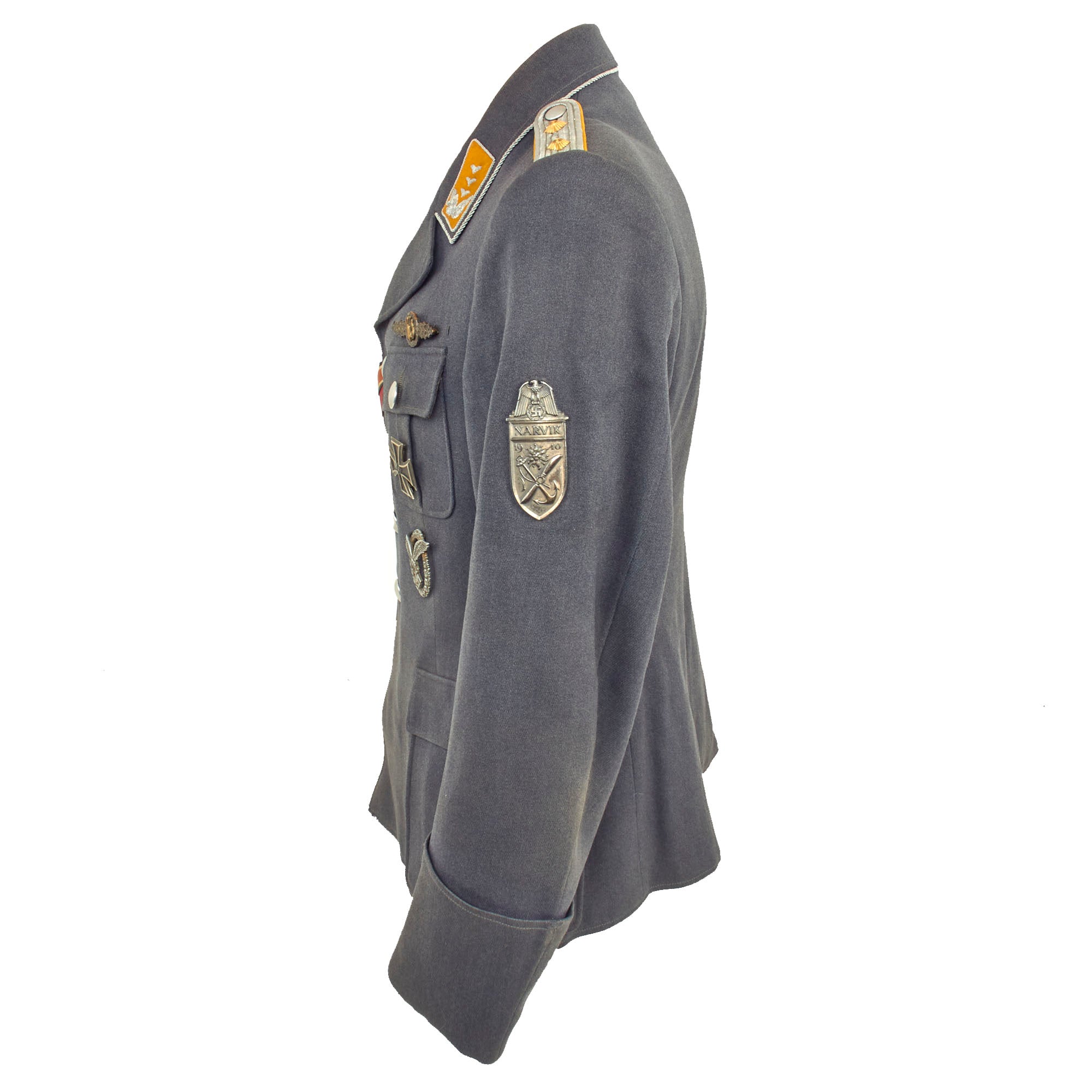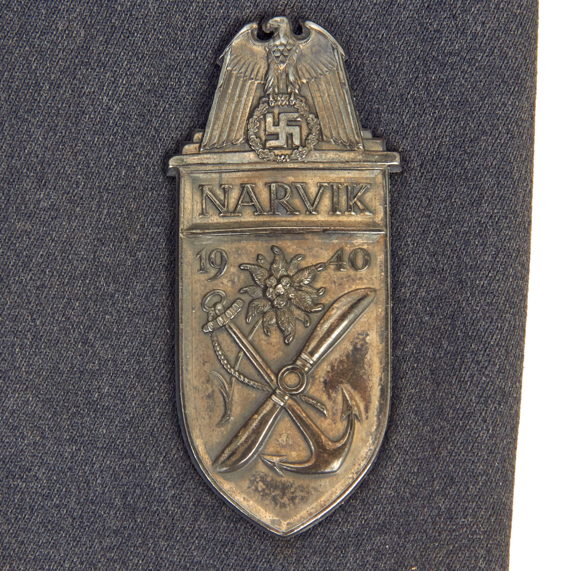 The collar of this officer's tunic has a twisted bullion border, correct for a Luftwaffe officer's fliegerbluse. The attached Kragenpatten (Collar Flaps) are in Goldgelb (Gold-Yellow), the correct Waffenfarbe (Corps Color) for Aviator troops such as pilots and ground personnel, as well as Fallschirmjäger (parachute troops). The sew-in style Schulterklappen (Shoulder Boards or Epaulettes) have the same color piping, and have four rows of silver "Russia Braid" around the edge with two "Pips" added, indicating the rank of Hauptmann (Captain). This is confirmed by the collar insignia, which each show three "gull wing" insignia over a wreath. The left sleeve is adorned with a rare Luftwaffe Narvik Shield, which is correctly installed with the fabric backing sewn over the metal backing plate on the interior of the sleeve.