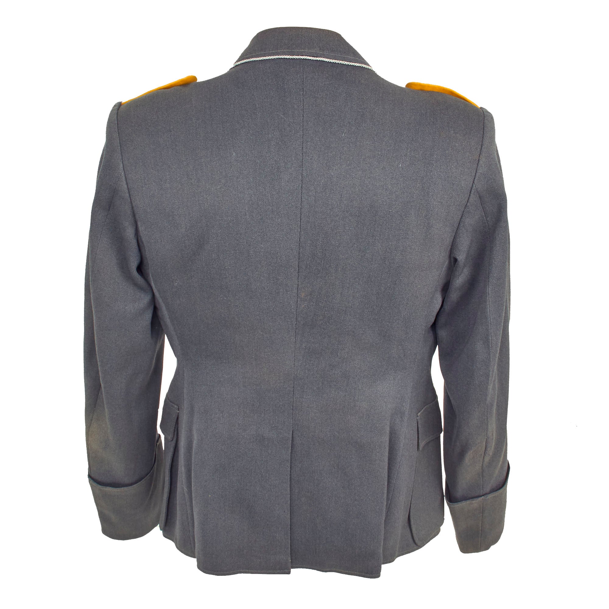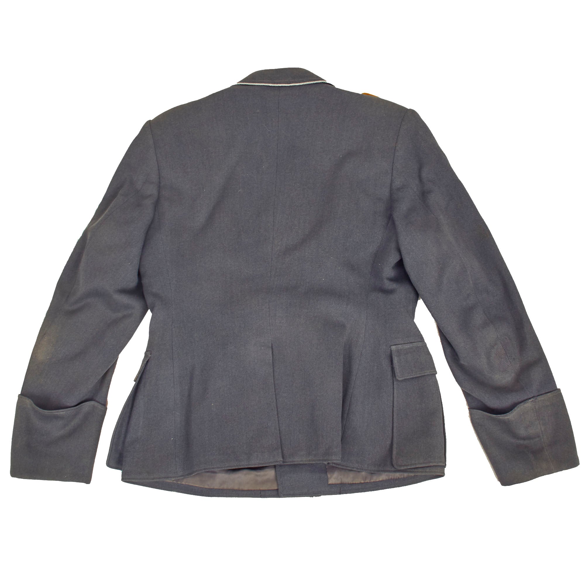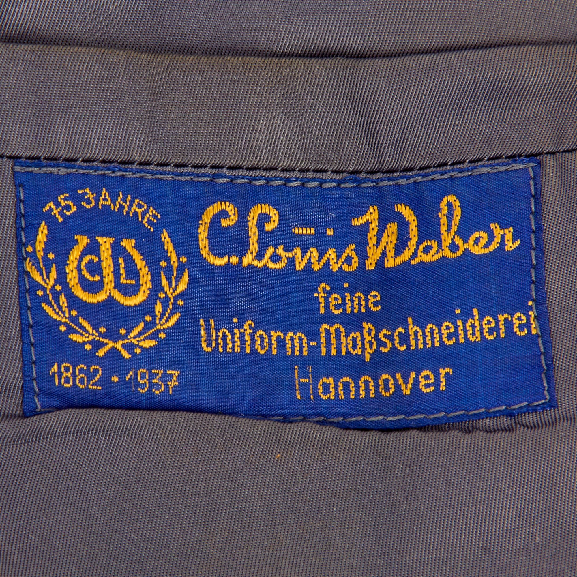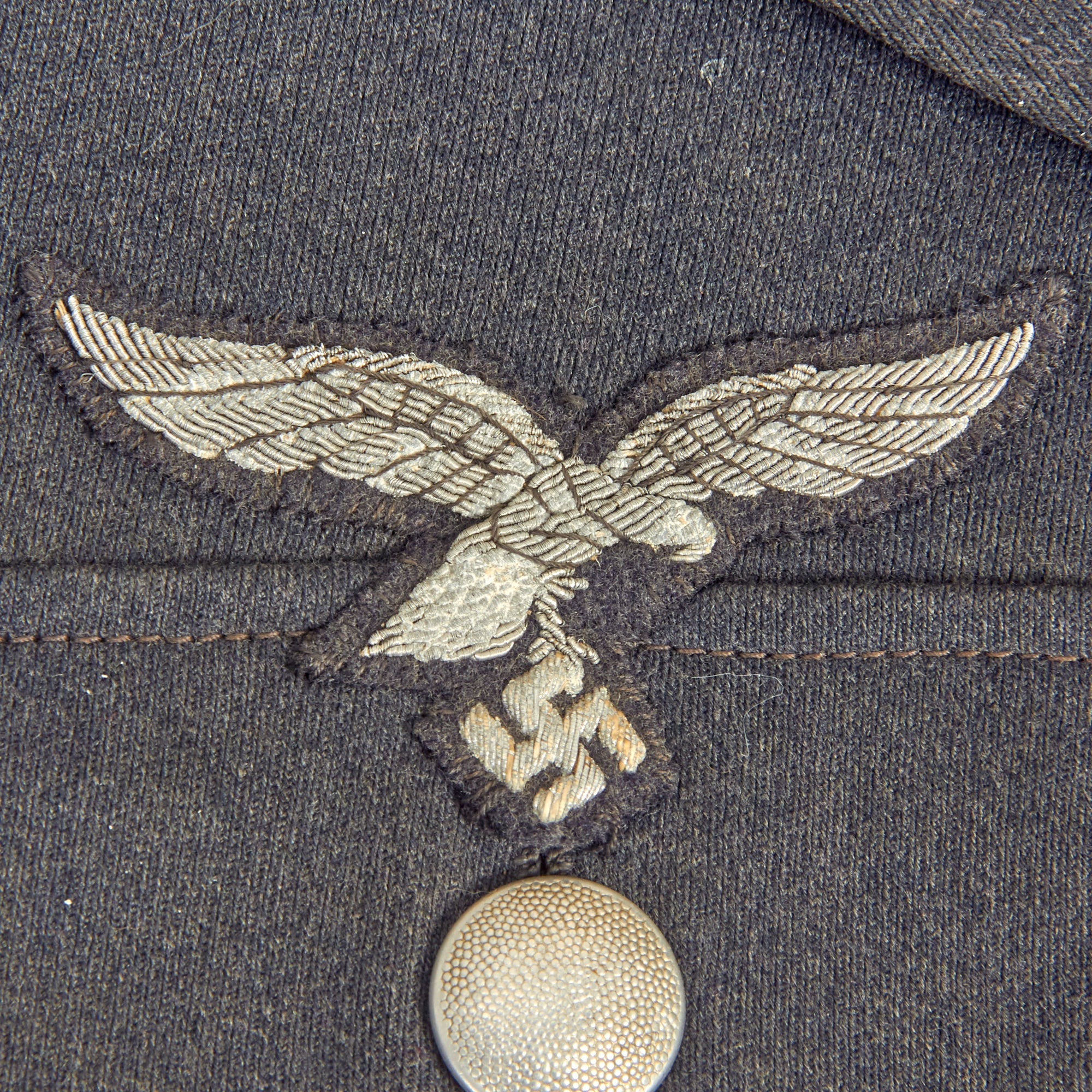 Additionally, the inside of the pocket still has the original C. Louis Weber tailor name tag, which gives a date of 8. 12. 39. and the last name Wachholz, with an unclear abbreviation before it. The tunic is in very good / excellent condition, especially considering the long service it saw during the war. This great piece is produced in Luftwaffe blue grey wool and shows only only light wear and fading from use, especially around the collar. All buttons are bright finished pebbled aluminum and back marked. The pockets are all squared, and the front closure features 4 buttons, all sewn directly to the tunic. The right breast of the uniform has a correct early "Droop-Tail" bullion embroidered officers eagle sewn in place with the correct stitching pattern. It is only stitched to the outer layer of fabric, so it is the original eagle installed on this uniform tunic.
