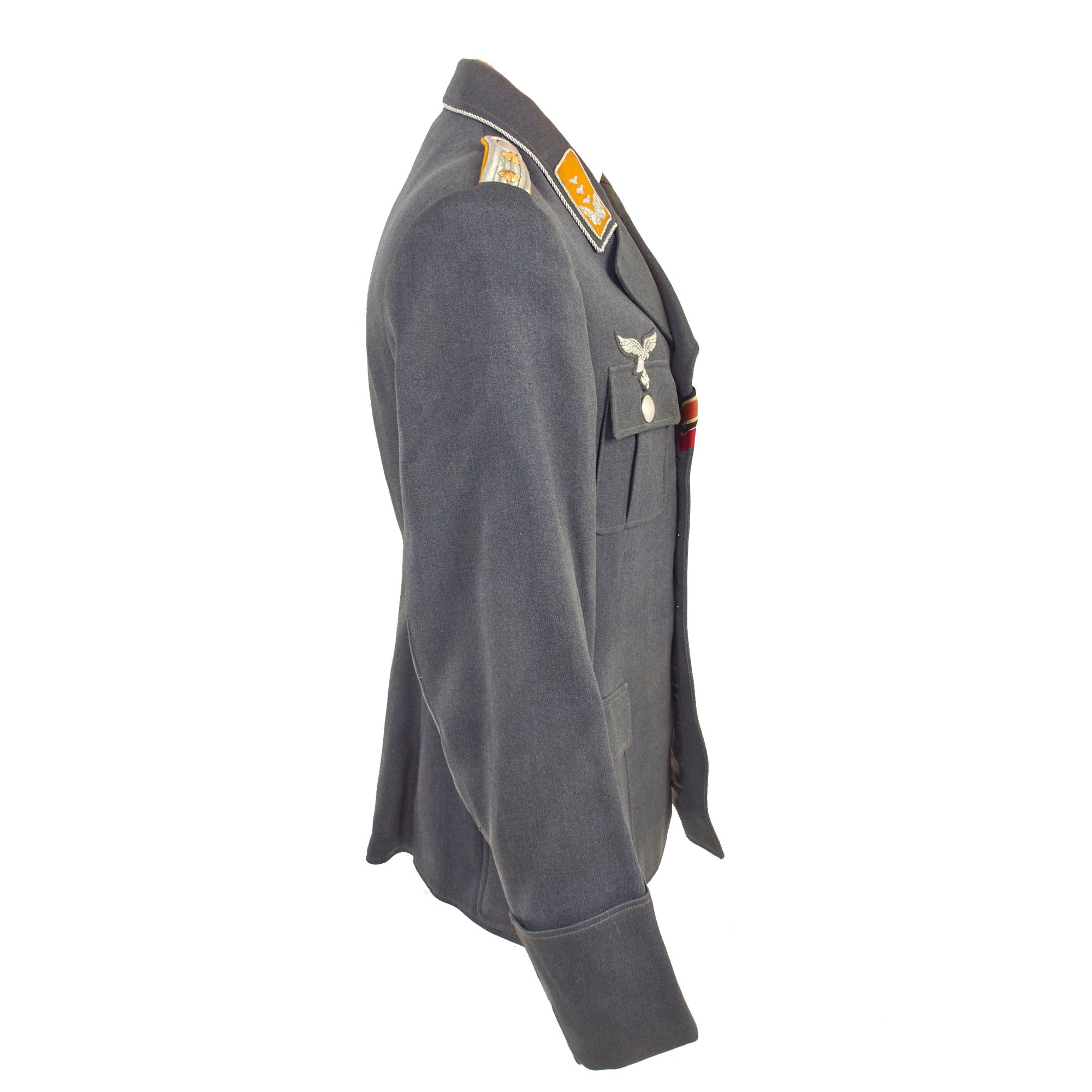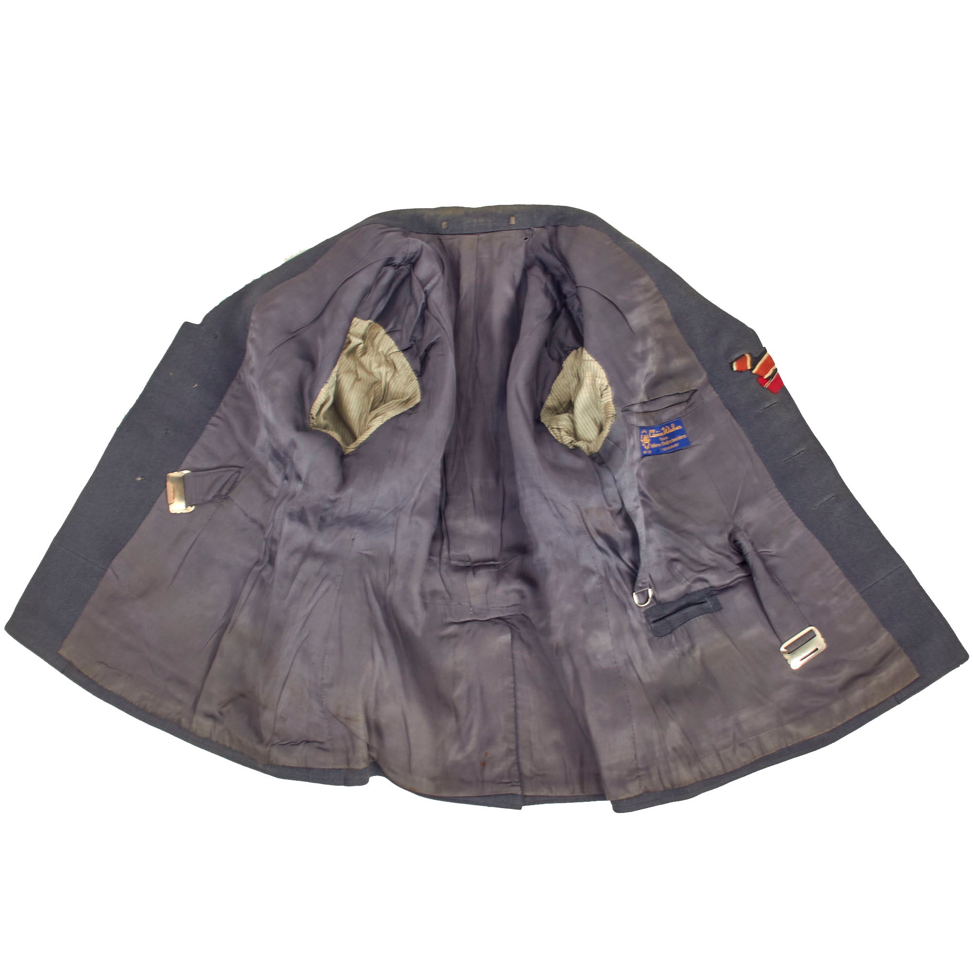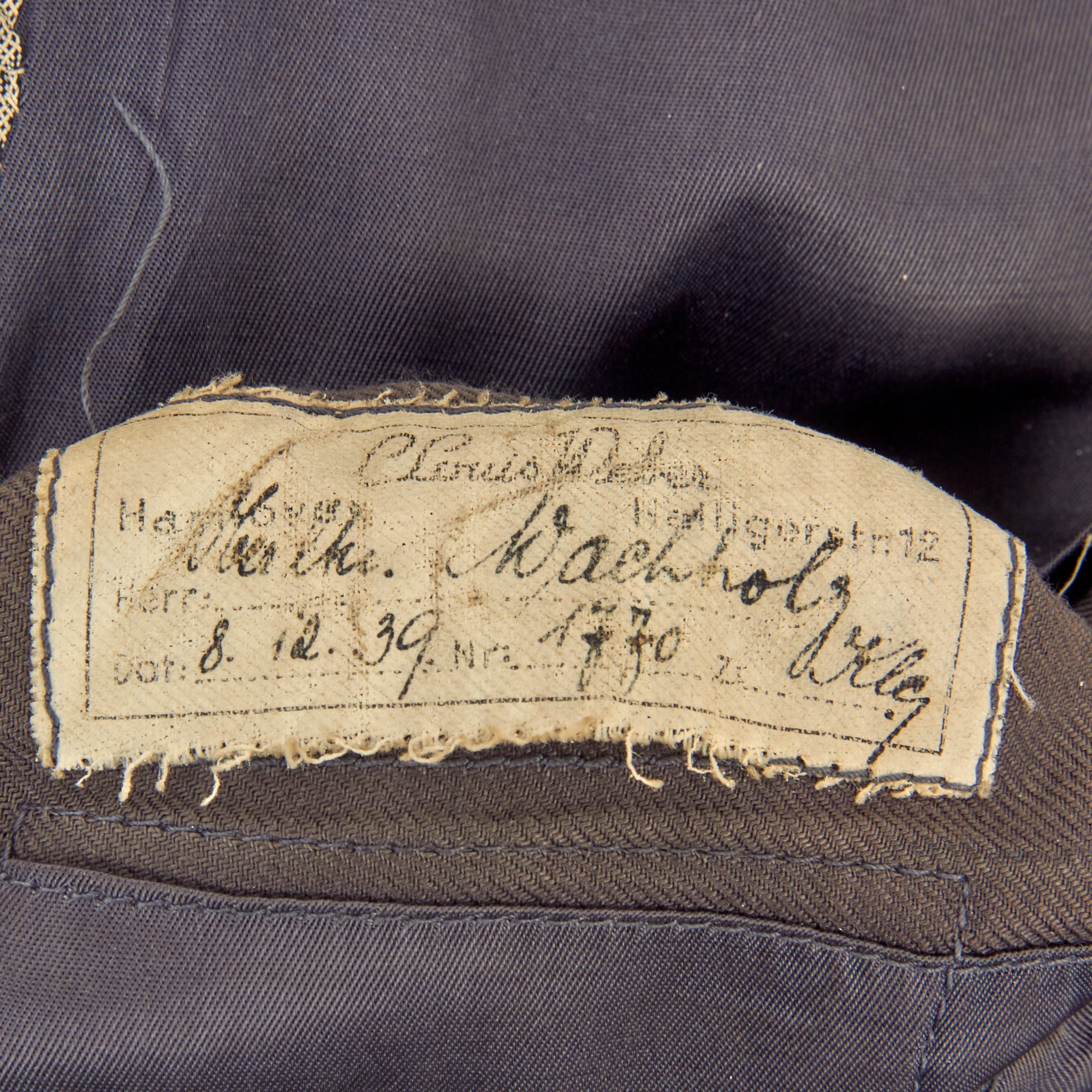 The centerpiece of this collection is a fantastic WWII German Luftwaffe Flight Branch Officer Four Pocket Fliegerbluse (Flight Blouse) Service Tunic, tailor made with an intact maker tag on the inside of the left breast. This reads as follows: