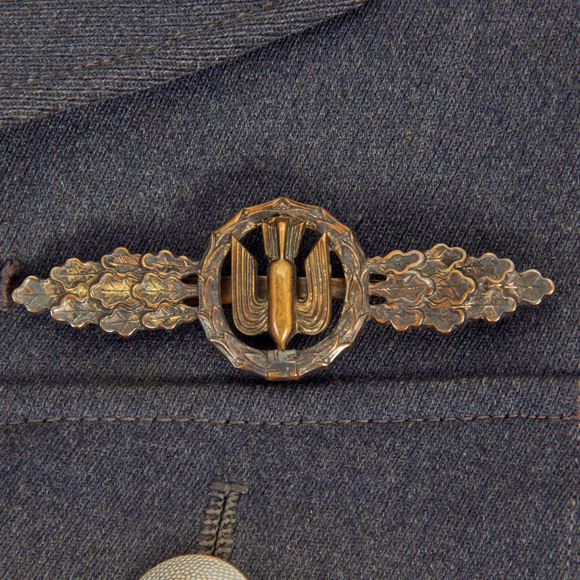 The top buttonhole on the tunic the tunic has the ribbons for an Iron Cross 1939 2nd Class and Eastern Front medal installed. Above the left pocket are thread loops, which could be used to attach a ribbon bar, but in this case there is a Luftwaffe Silver Grade Front Flying Clasp for Bombers marked on the back with R.S. for Rudolf Souval, awarded for 60 missions. Below this, attached to more thread loops, is a very good condition slightly vaulted Iron Cross 1939 First Class award, which is unmarked. The award below this is a great Luftwaffe Combined Pilot / Observer Badge (Flugzeugführer- und Beobachterabzeichen), aluminum construction with much of the gold wash on the wreath still intact. It is maked on the back with the "Barred A" trademark of F. W. Assmann & Söhne of Lüdenscheid, a large maker of belts, buttons, and other accoutrements