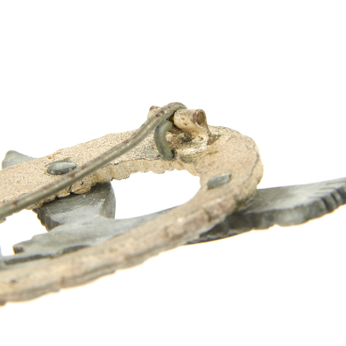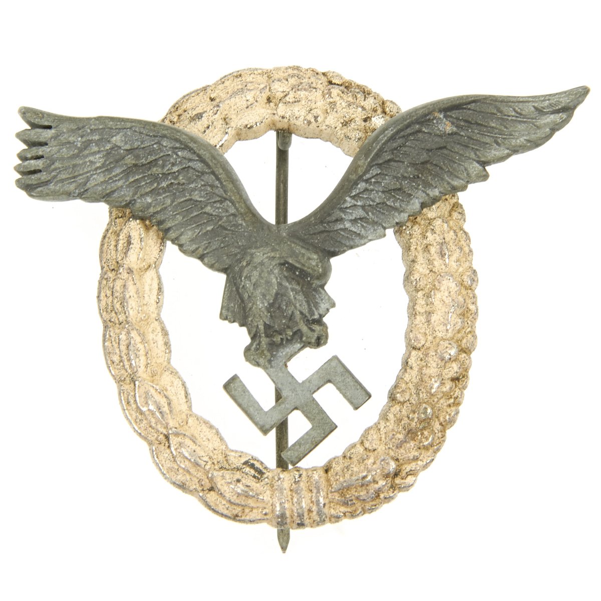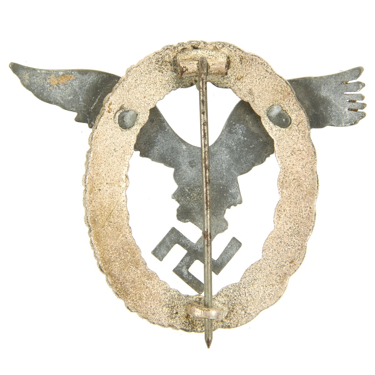 Original Items: Only One Available. This is a very nice condition badge two-piece construction, silvered zinc, magnetic pin, unmarked, 53 mm x 65.3 mm, vertical pin back, much silvering retained on wreath with minor surface wear, offered in very good condition. Complete with original pin.