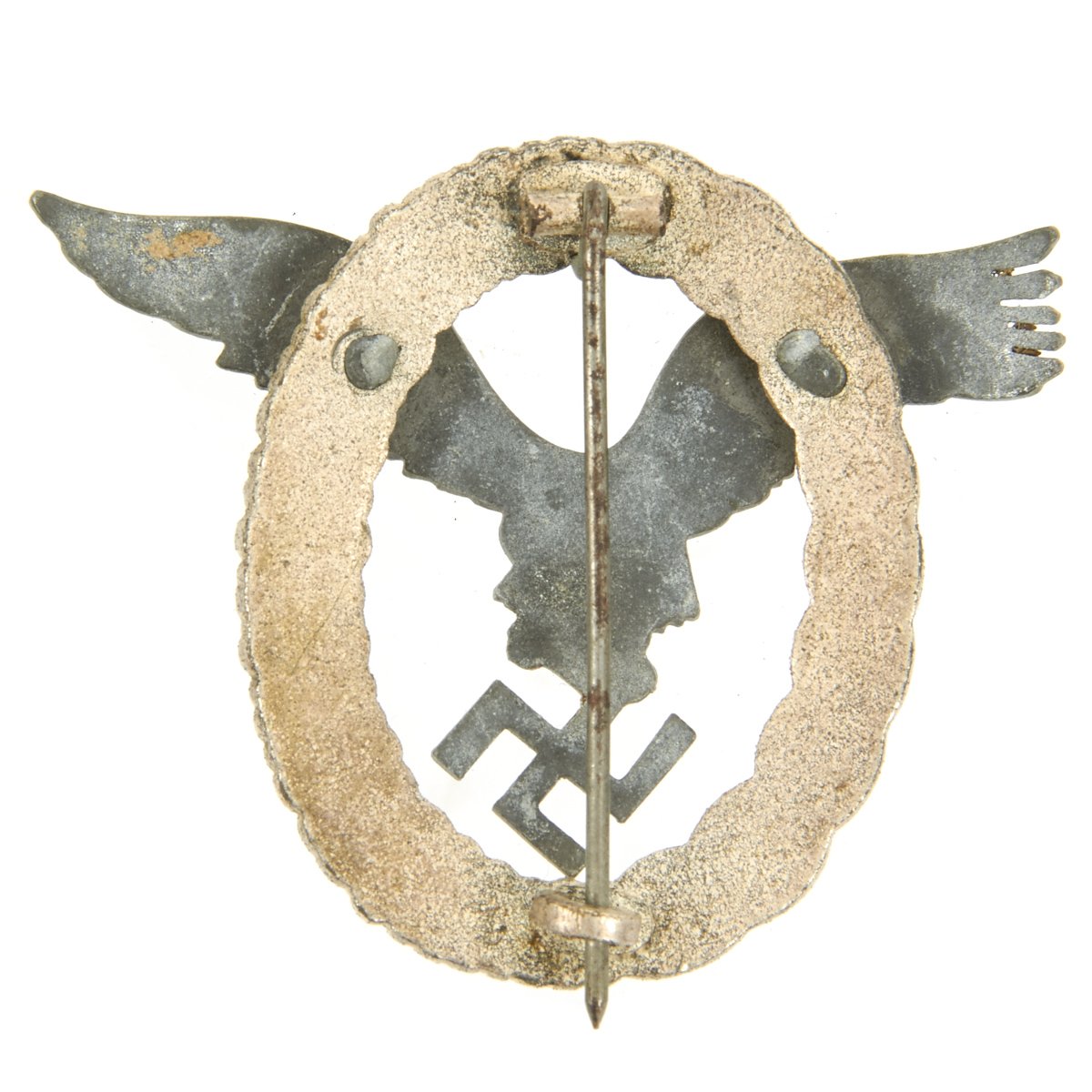 The badge was originally manufactured in bronze, and later zinc. The badge can be distinguished from the Pilot's Badge by the gold wreath; the Pilot's Badge had a silver wreath. There was also a cloth version of the badge which used embroidered bullion for the officer's version and cotton for the NCO's version. The presentation case was dark blue, with a blue satin top liner and a blue velvet bottom liner on the inside.