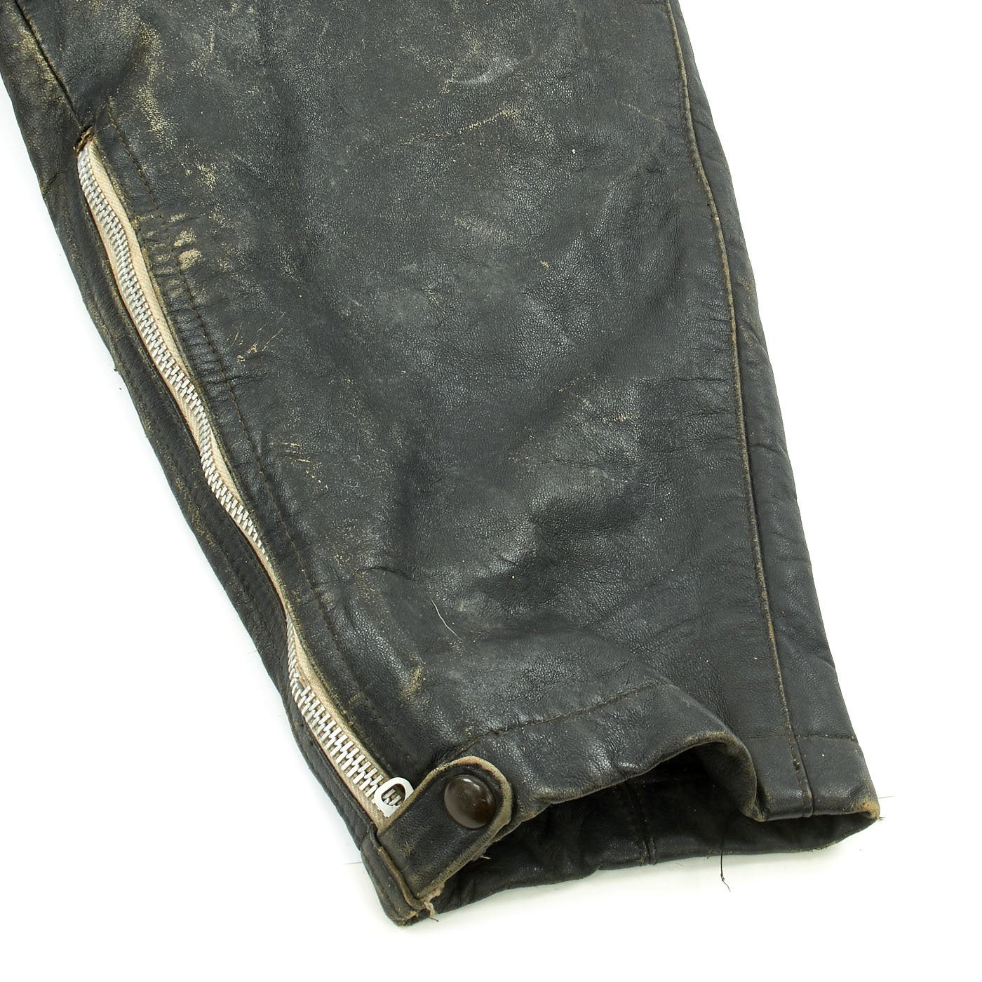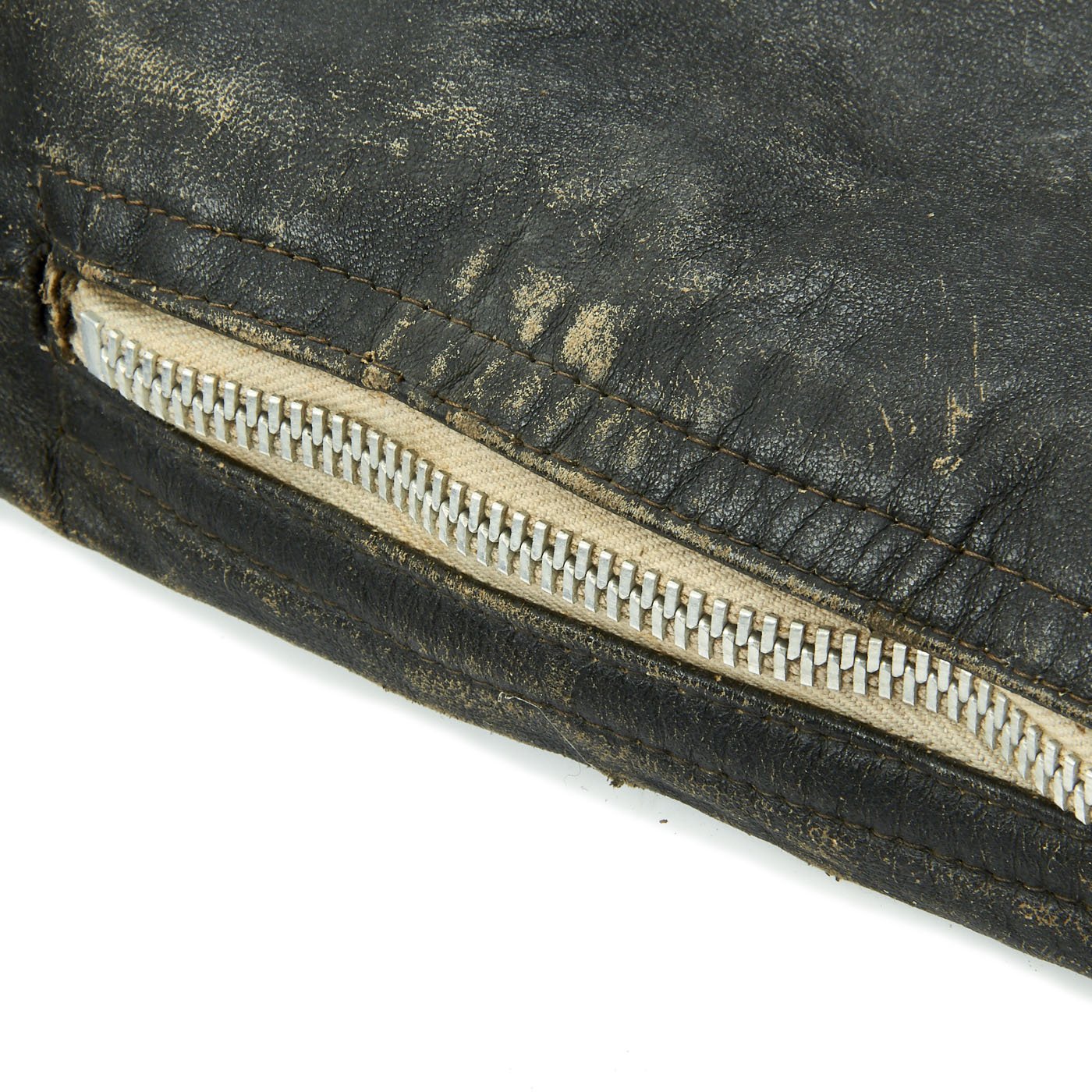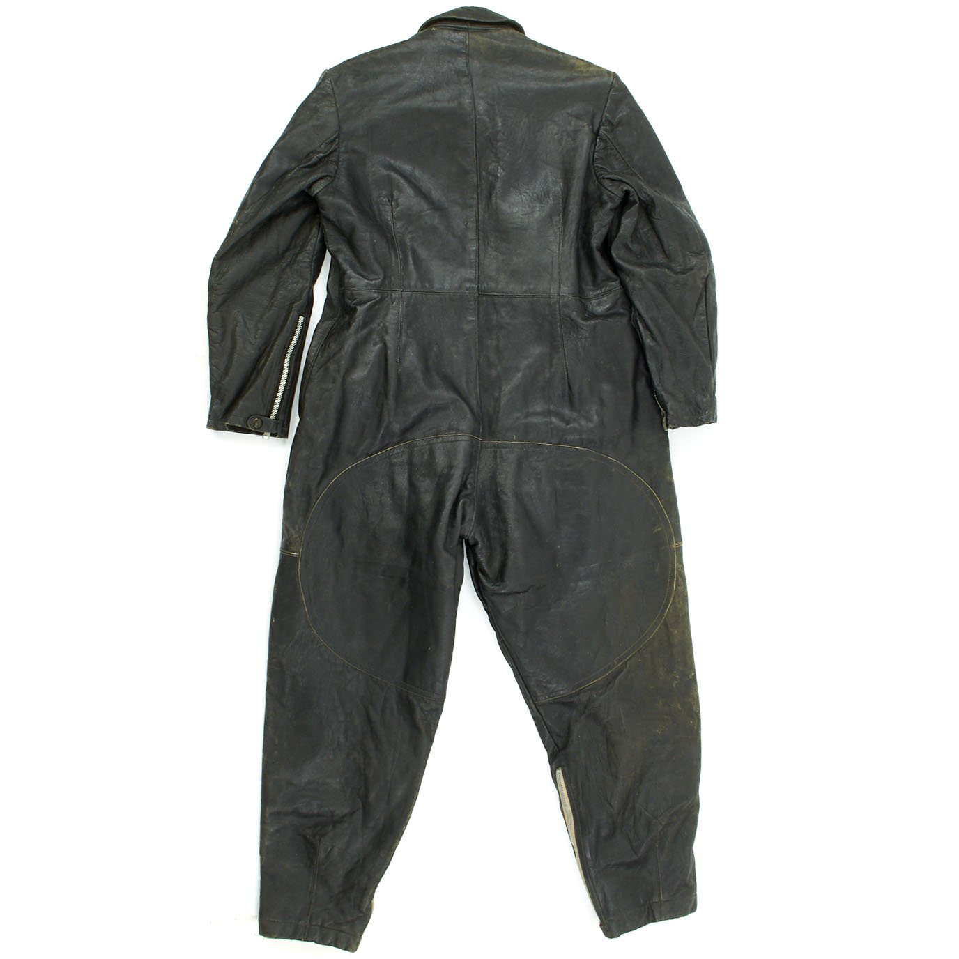 Original Item: Only One Available. This is an excellent condition genuine WWII Luftwaffe black leather flying suit with wool lining. Features include genuine PRYM marked snaps and D.R.P ZIPP marked zippers. All snaps and zippers are in functional condition (a couple of the sippers are missing teeth but still function). Flying suit is offered very good condition and in a good large size, fits a 180lb 5’'10 man without problem. Hevayeight winter issue.