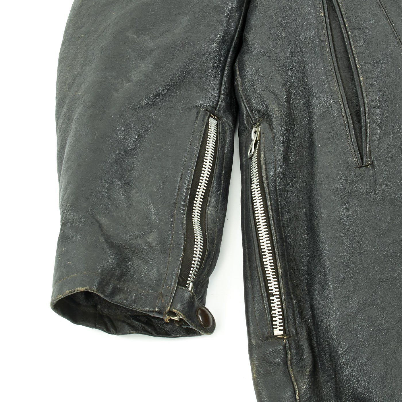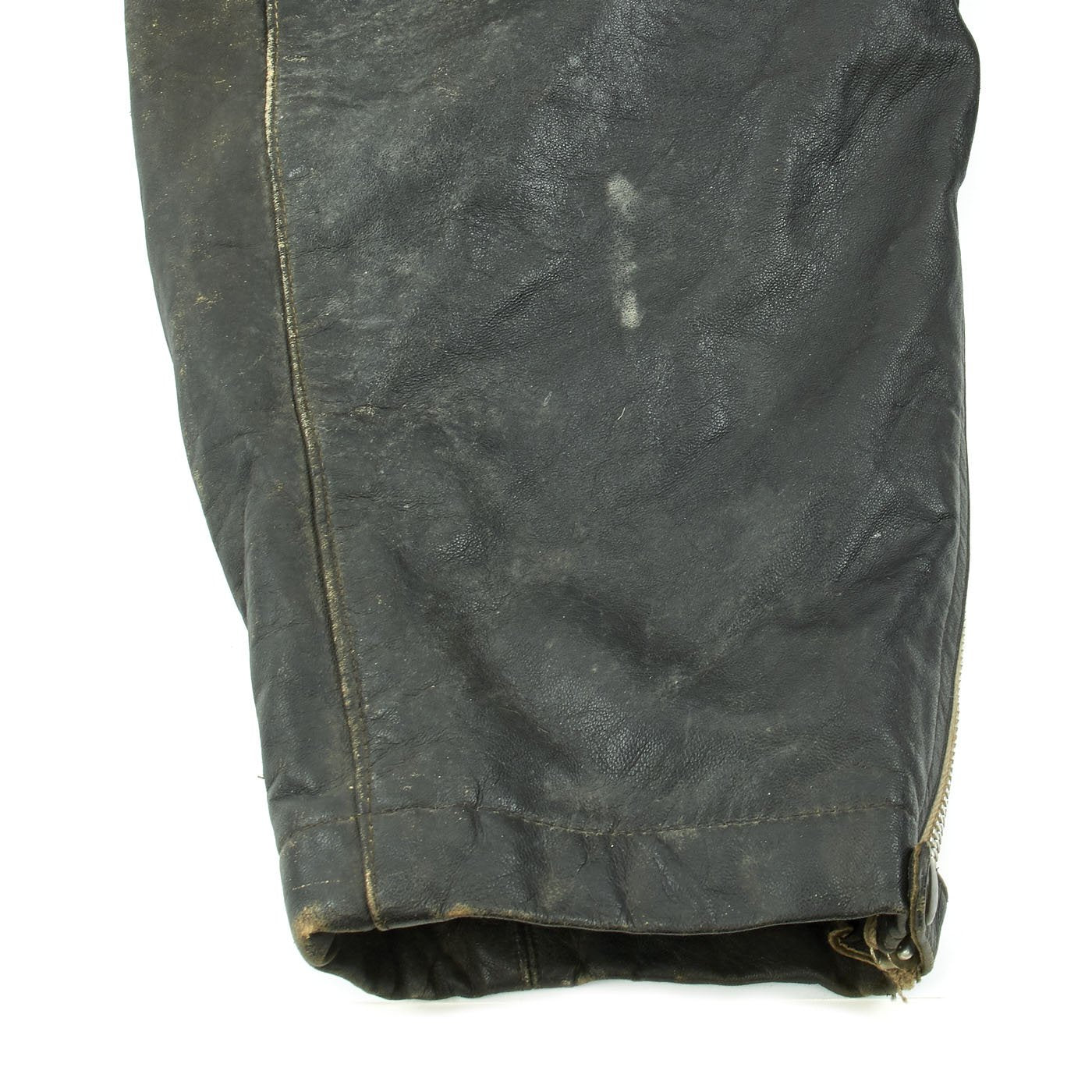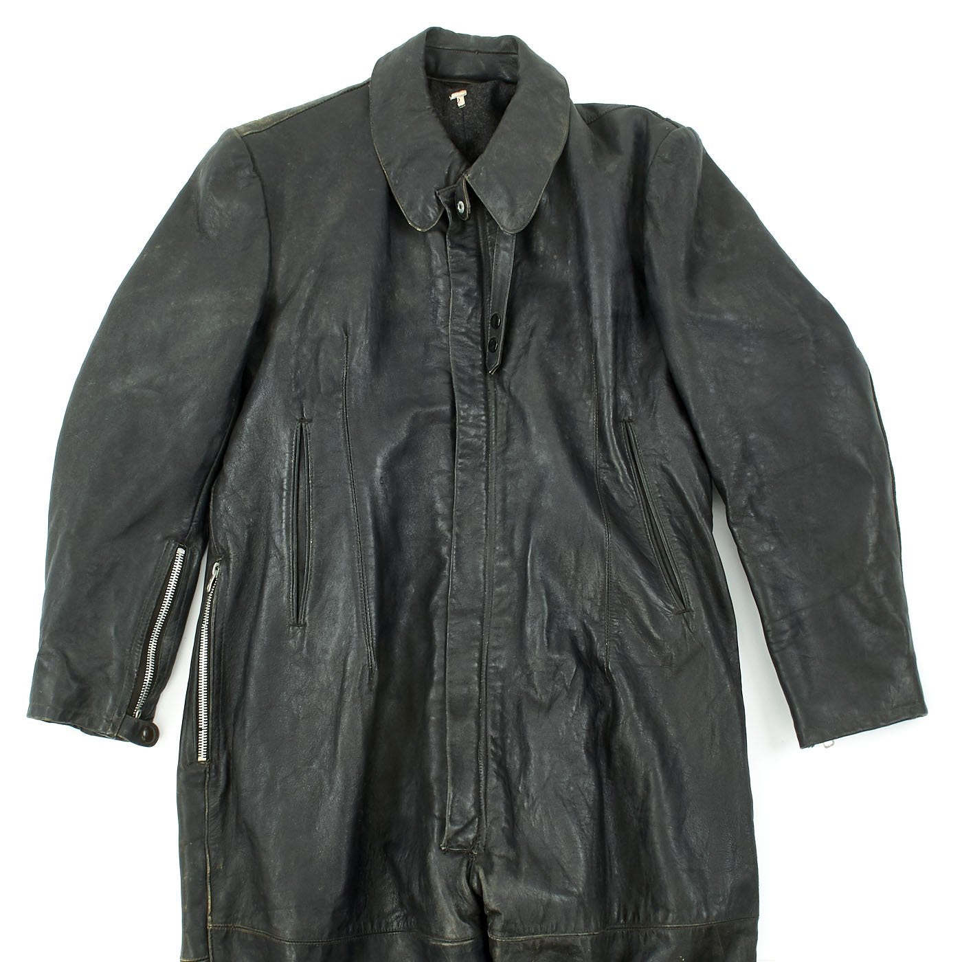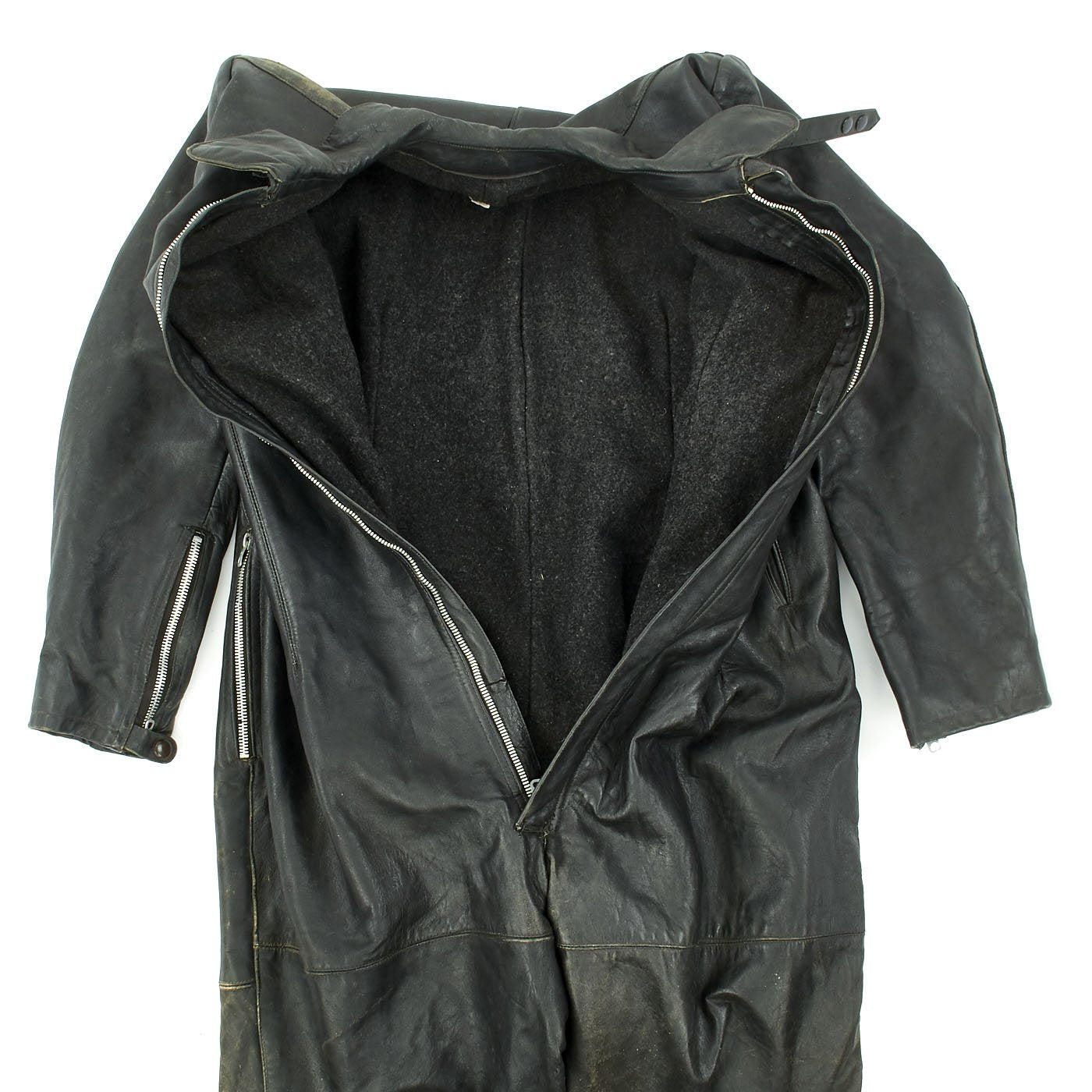 Original Item: Only One Available. This is an excellent condition genuine WWII Luftwaffe black leather flying suit with wool lining. Features include genuine PRYM marked snaps and D.R.P ZIPP marked zippers. All snaps and zippers are in functional condition (a couple of the sippers are missing teeth but still function). Flying suit is offered very good condition and in a good large size, fits a 180lb 5’'10 man without problem. Hevayeight winter issue.