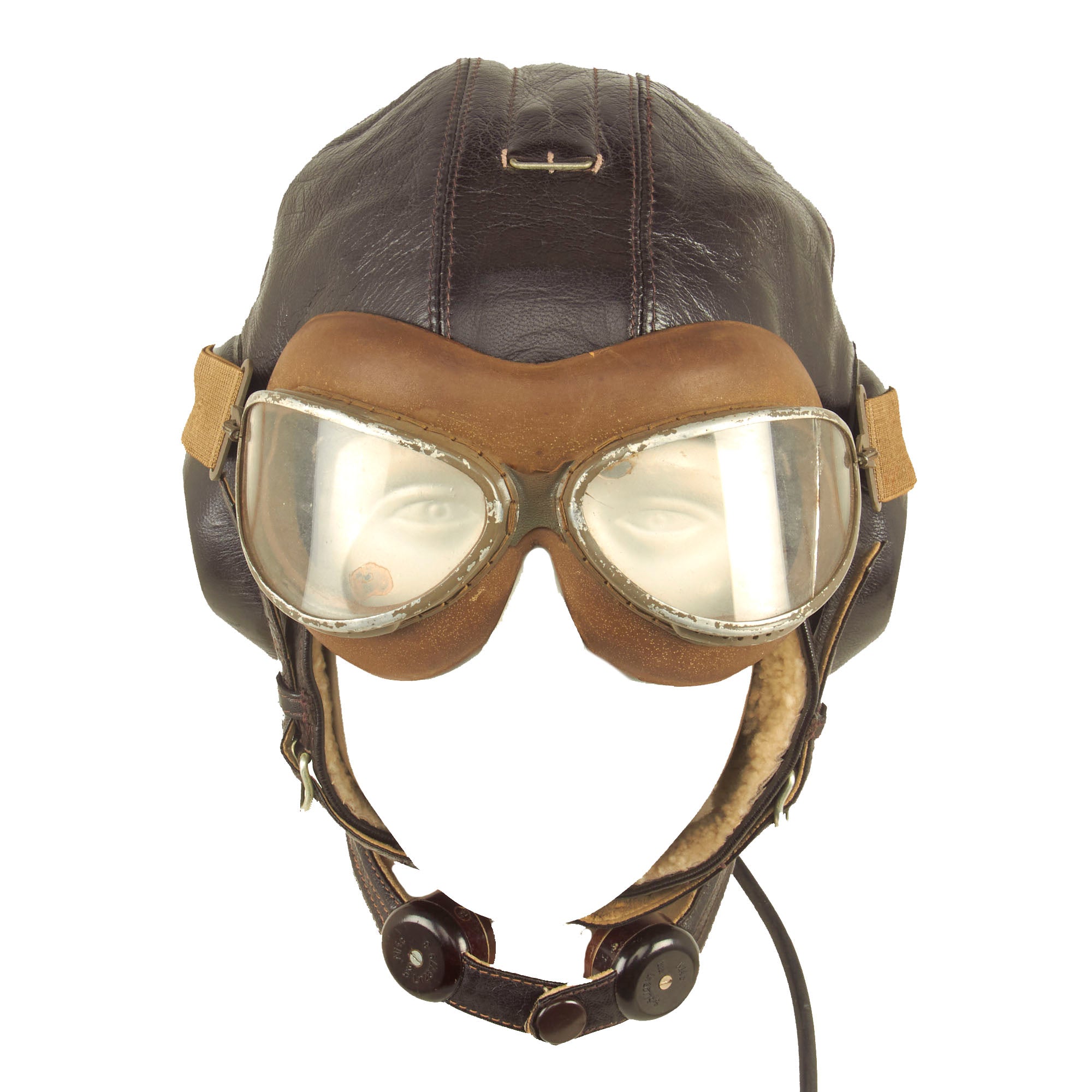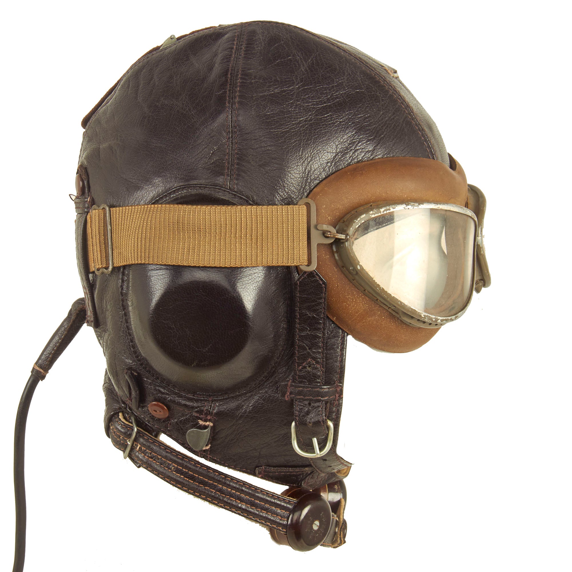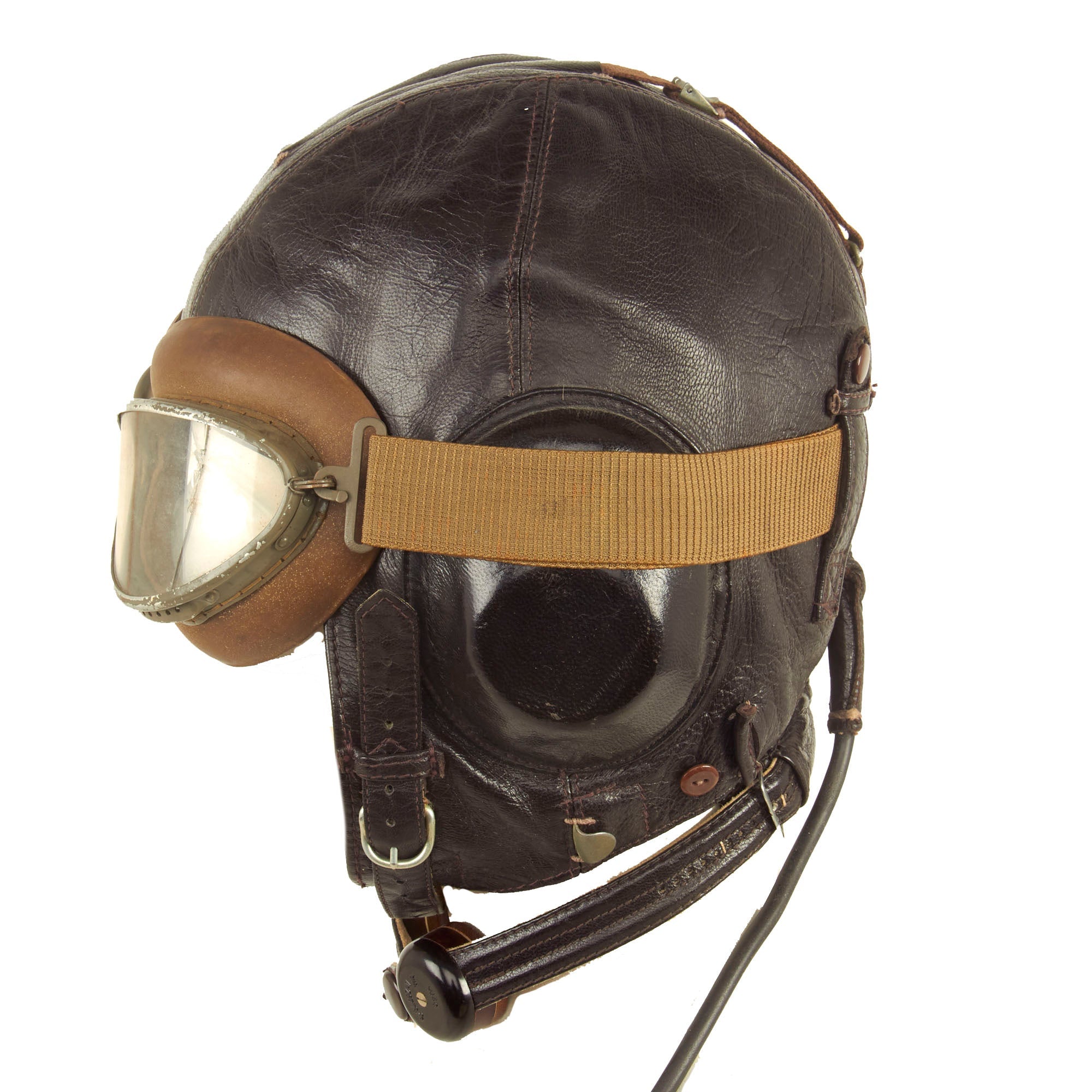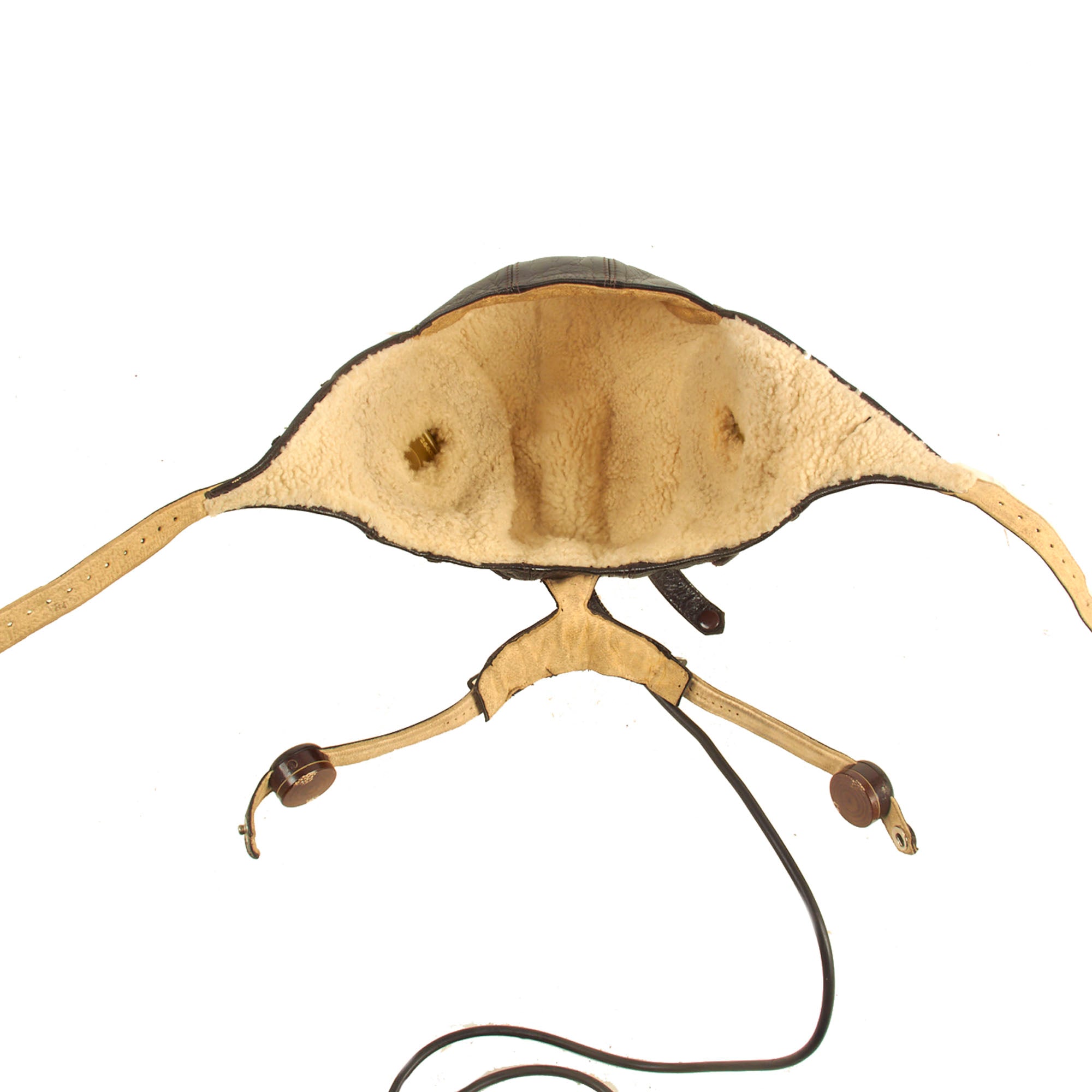 A dark brown leather flying helmet lined with sheepskin or rabbit fur and made from the same basic pattern as the LKp W-100 but with new Siemens communications and improved insulation for better sound transmission. The major visible difference between this helmet and its predecessor was the design of the earphone housings and throat microphone straps. Instead of metal or plastic domes, the earphones were housed in hard rubber cups covered with dark brown leather which had a more streamlined appearance. The leather outer covering was designed with a recess at the top which helped secure the goggle straps in place. Sound quality was further enhanced by the installation of a translucent plastic membrane inside the helmet between the cushioned fleece lining and the earphone speaker. This served the dual function of filtering excess noise and keeping dust out of the sensitive electronics. The housing for the throat microphones on the LKp W-101 was also improved. Two straps containing the microphone contacts were linked by an inverted “T” shaped leather envelope at the nape of the helmet. This housing also served as the junction between the helmet’s internal wiring and the long cord and plug-in connector. The throat straps were adjustable on both sides by means of two small buckles, and once the correct sizing was achieved, could be quickly joined together at the front of the throat by one or two snap fasteners. Later examples of this helmet have been found with a friction release attachment for adjusting the tension of the throat microphones, although this is more commonly seen on the LKpN mesh flying helmets. The model LKp W-101 was produced with hardware for the three-strap oxygen mask, but many were modified to accept the two-strap mask by the addition of studs on either side of the helmet. Luftwaffe LKp W101 Flying Helmet.