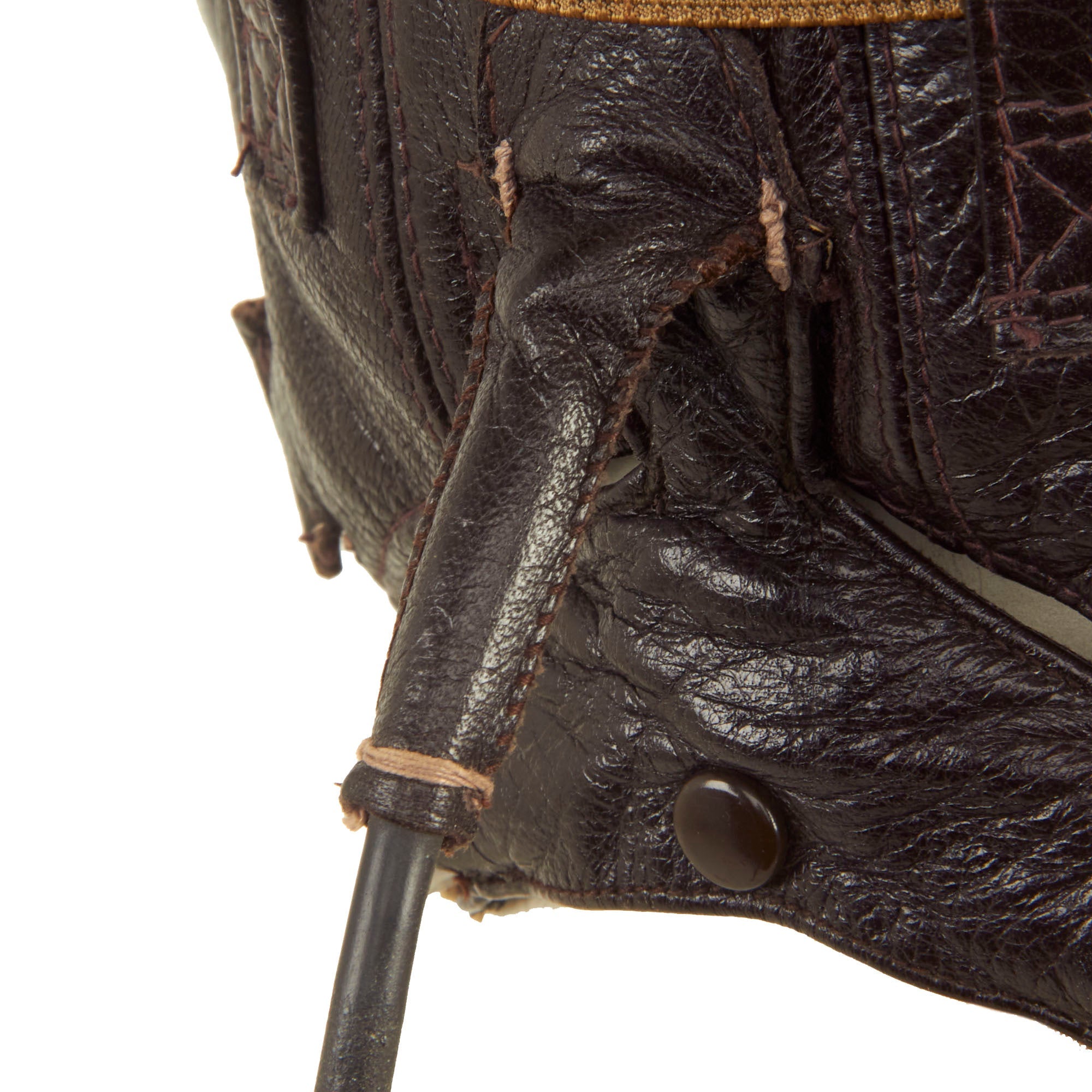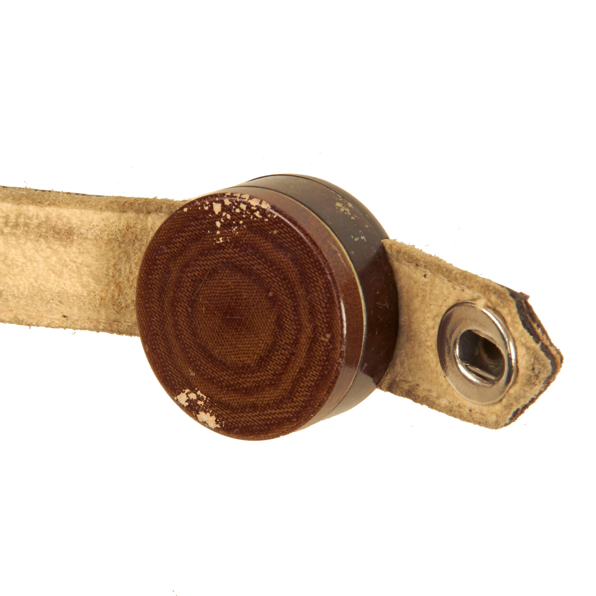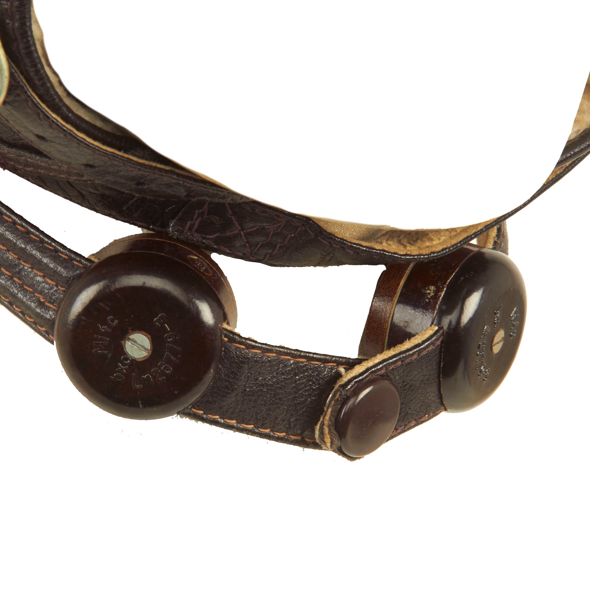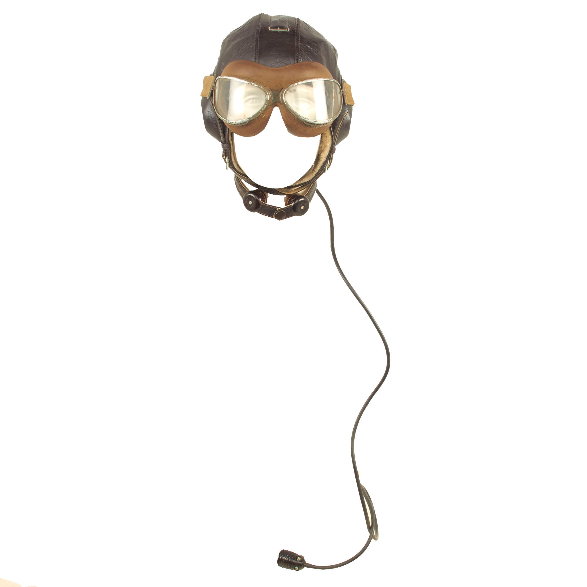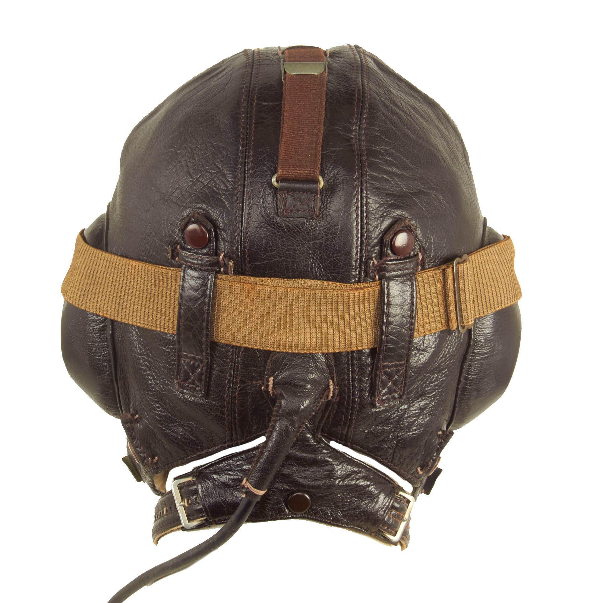A dark brown leather flying helmet lined with sheepskin or rabbit fur and made from the same basic pattern as the LKp W-100 but with new Siemens communications and improved insulation for better sound transmission. The major visible difference between this helmet and its predecessor was the design of the earphone housings and throat microphone straps. Instead of metal or plastic domes, the earphones were housed in hard rubber cups covered with dark brown leather which had a more streamlined appearance. The leather outer covering was designed with a recess at the top which helped secure the goggle straps in place. Sound quality was further enhanced by the installation of a translucent plastic membrane inside the helmet between the cushioned fleece lining and the earphone speaker. This served the dual function of filtering excess noise and keeping dust out of the sensitive electronics. The housing for the throat microphones on the LKp W-101 was also improved. Two straps containing the microphone contacts were linked by an inverted “T” shaped leather envelope at the nape of the helmet. This housing also served as the junction between the helmet’s internal wiring and the long cord and plug-in connector. The throat straps were adjustable on both sides by means of two small buckles, and once the correct sizing was achieved, could be quickly joined together at the front of the throat by one or two snap fasteners. Later examples of this helmet have been found with a friction release attachment for adjusting the tension of the throat microphones, although this is more commonly seen on the LKpN mesh flying helmets. The model LKp W-101 was produced with hardware for the three-strap oxygen mask, but many were modified to accept the two-strap mask by the addition of studs on either side of the helmet. Luftwaffe LKp W101 Flying Helmet.