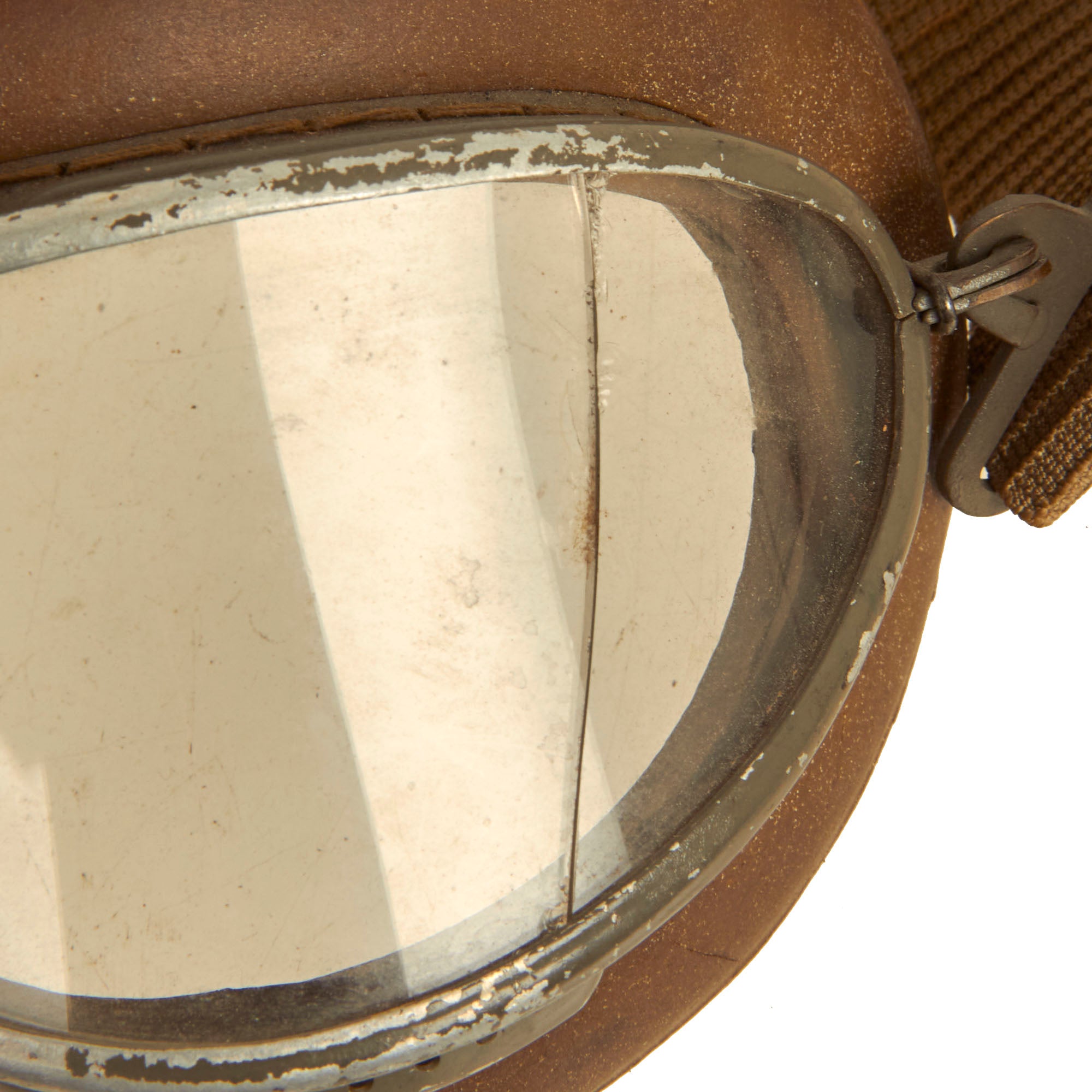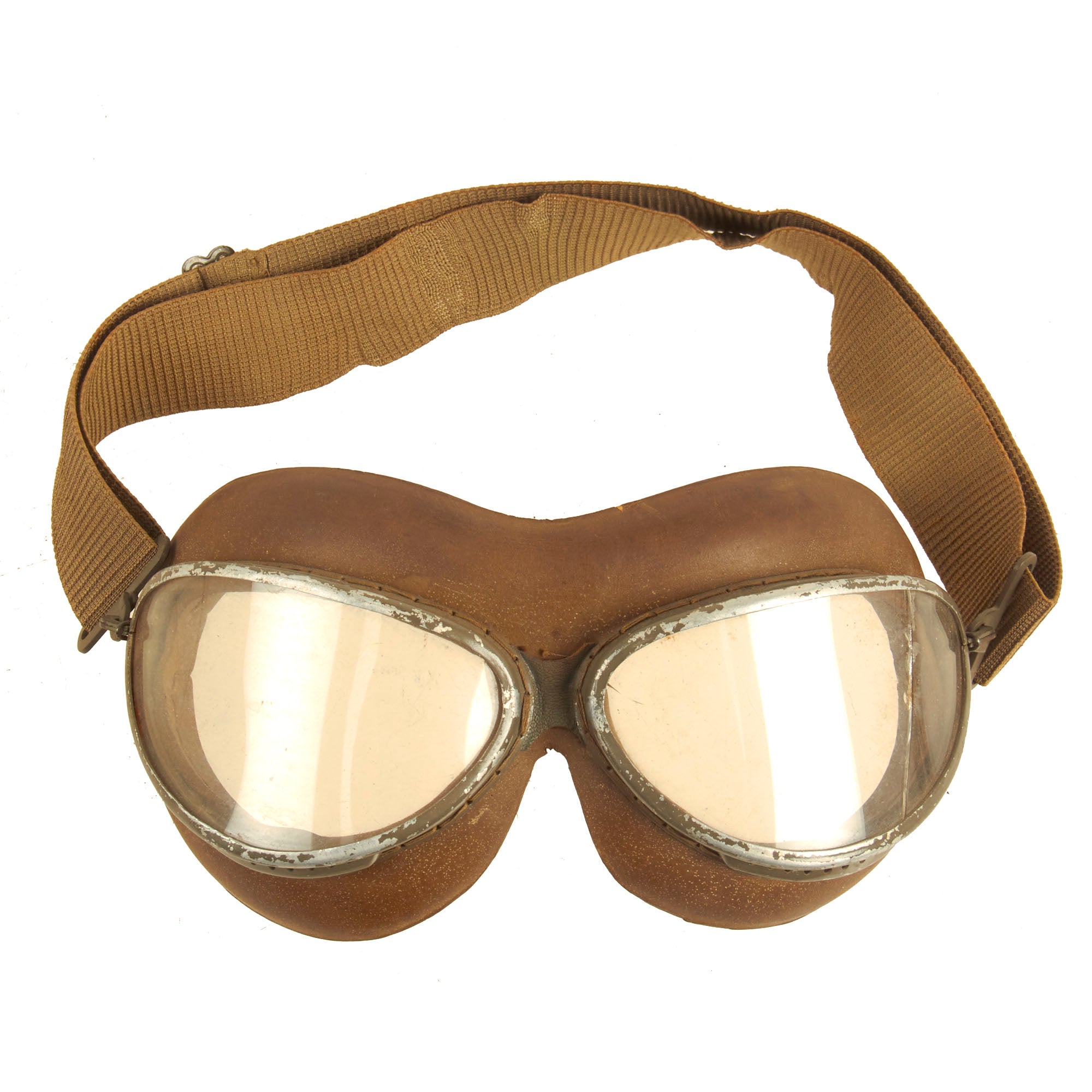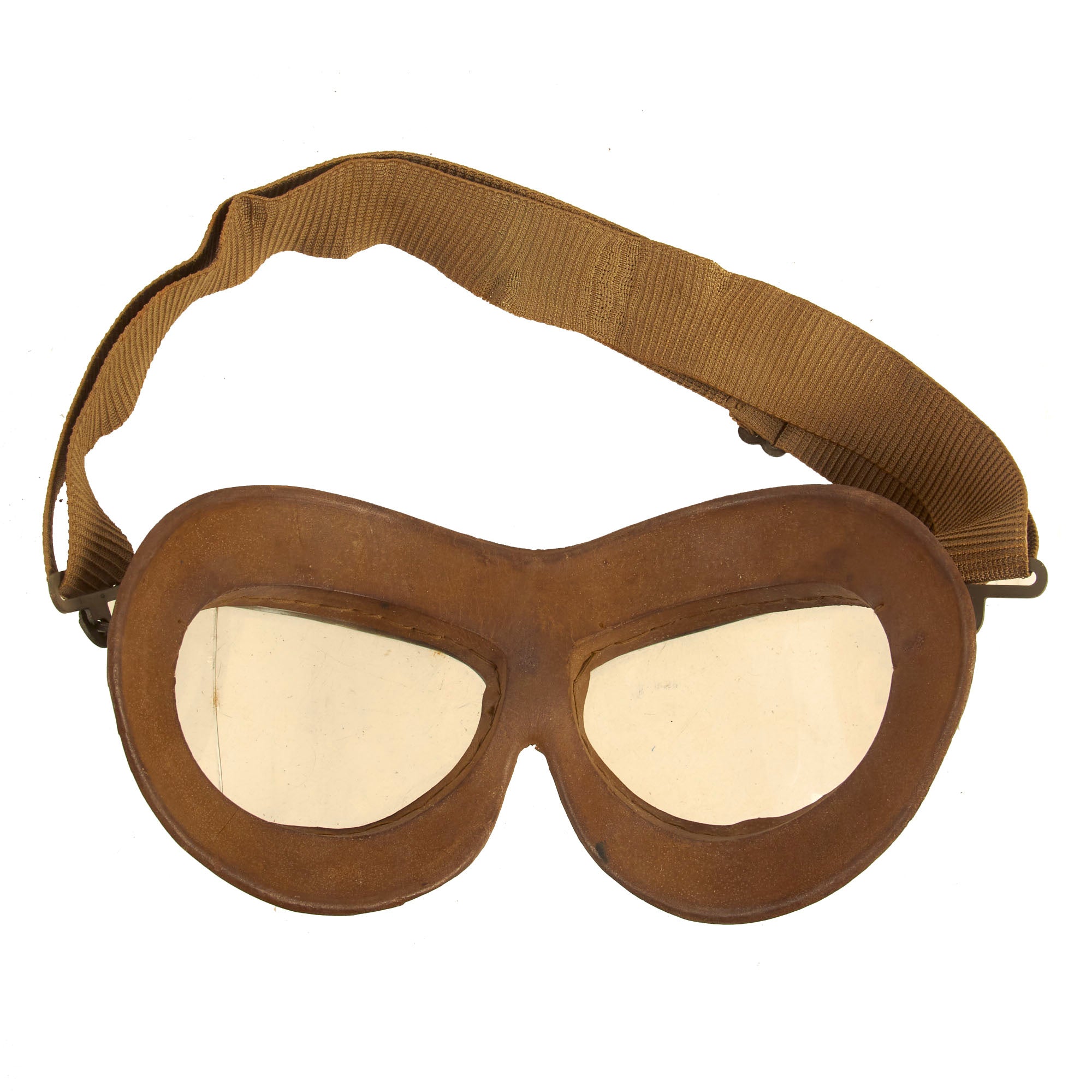 Also included are a set of Luftwaffe Type 295 Fliegerschutzbrille (flying goggles), with clear glass lenses and an elastic fabric strap. The goggles are maker marked O.W. on the top, for O.W. Wagener & Co. of Rathenow, Germany, a known maker of these goggles during WWII. They feature Luftwaffe gray aluminum frames, and the rubber surrounds are actually still relatively soft, with functional elastic. There is however a crack in the left lens, but this could always be replaced.