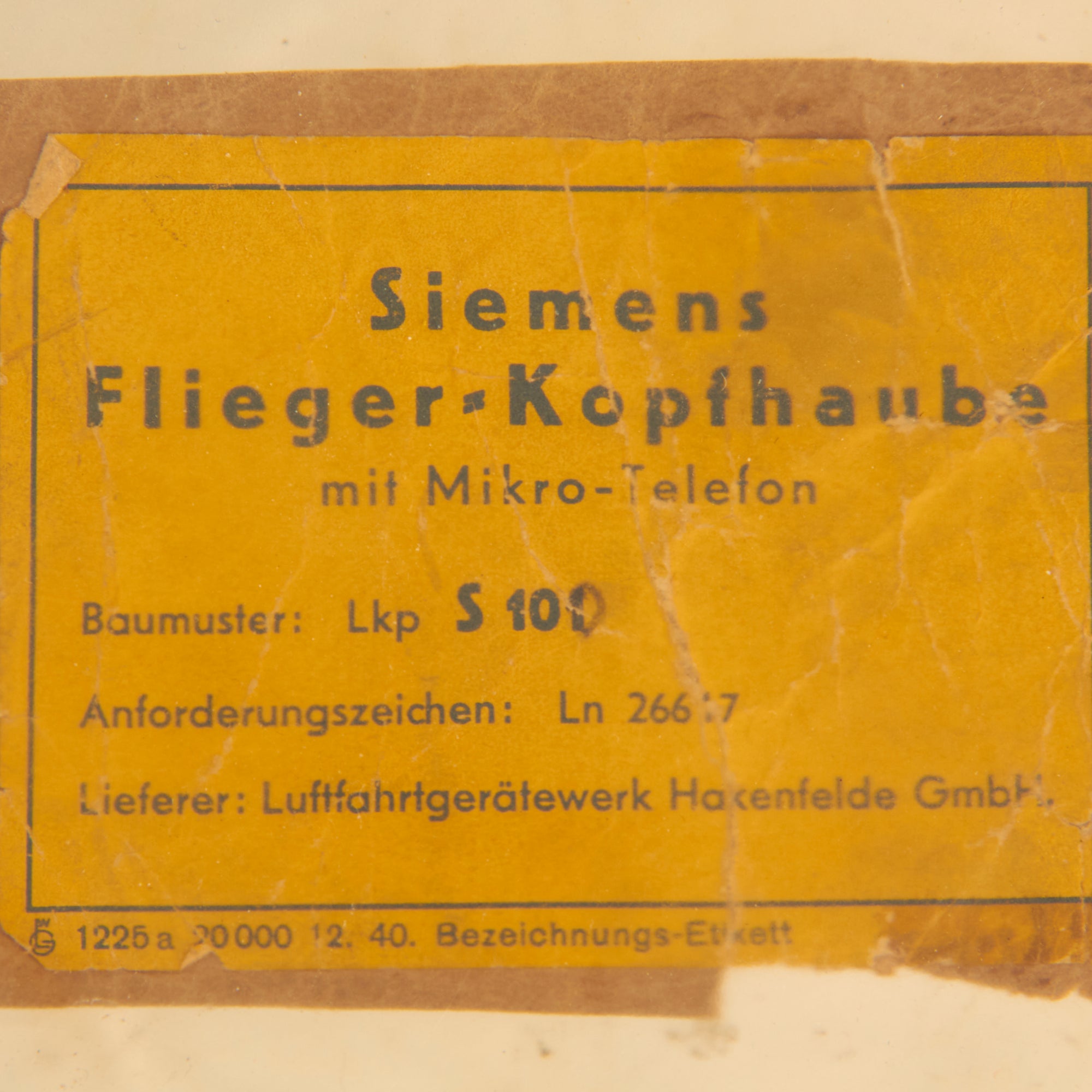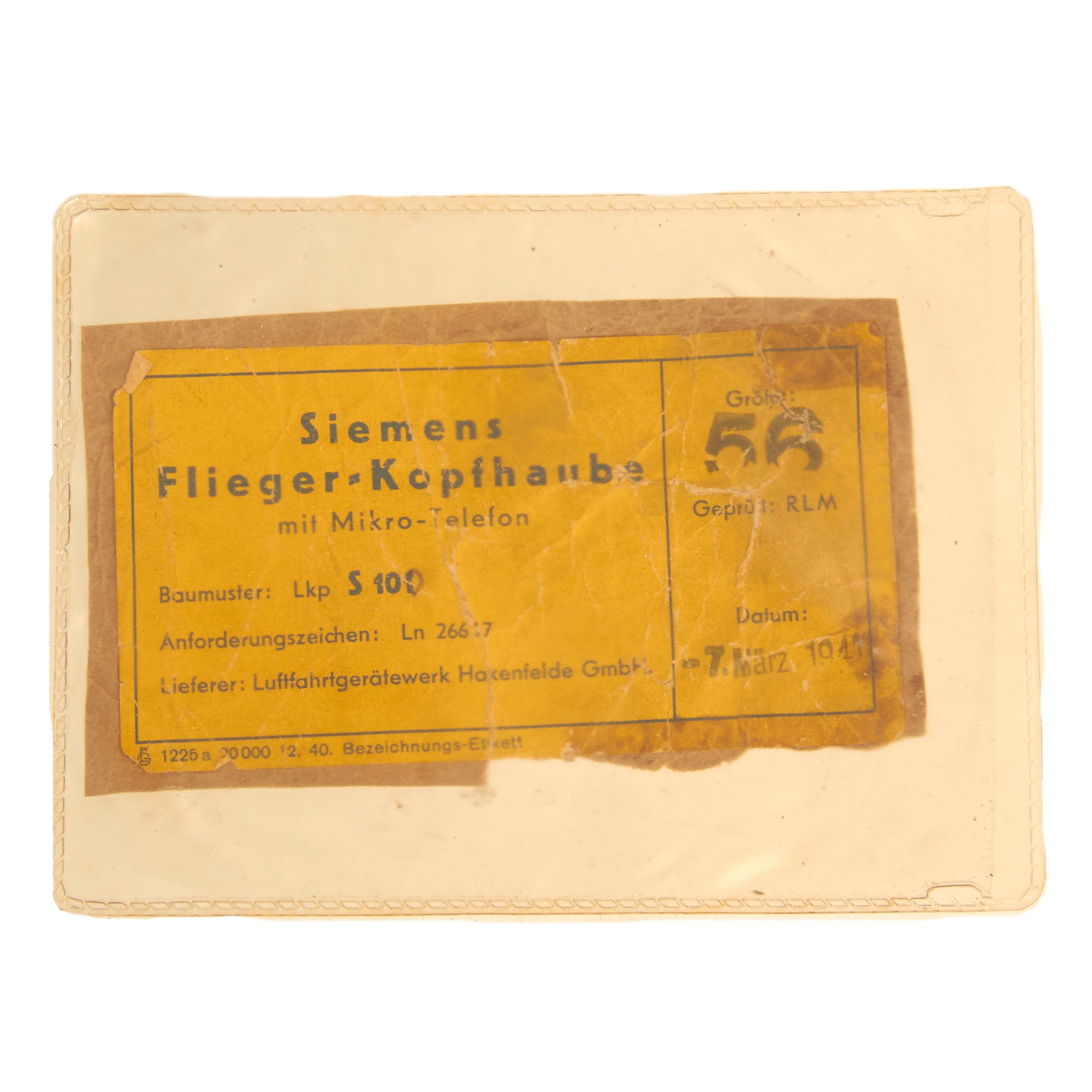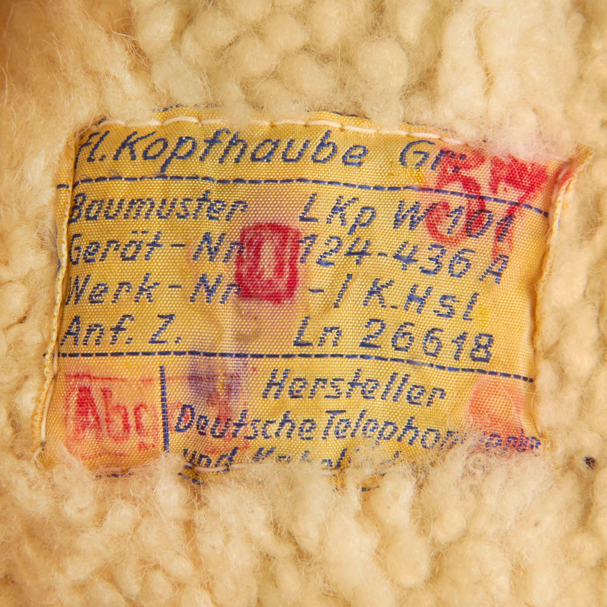 Deutsche Telephonwerke & Kabelindustrie AG (German telephone works and cable industry Co. or DeTeWe) of Berlin, a manufacturer of telephone and radio equipment. We do not know if they manufactured this flying helmet, or whether it was shipped to them for outfitting with the avionics. Overall condition is very good to excellent. It features the studs and hooks for a 4 point oxygen mask attachment.