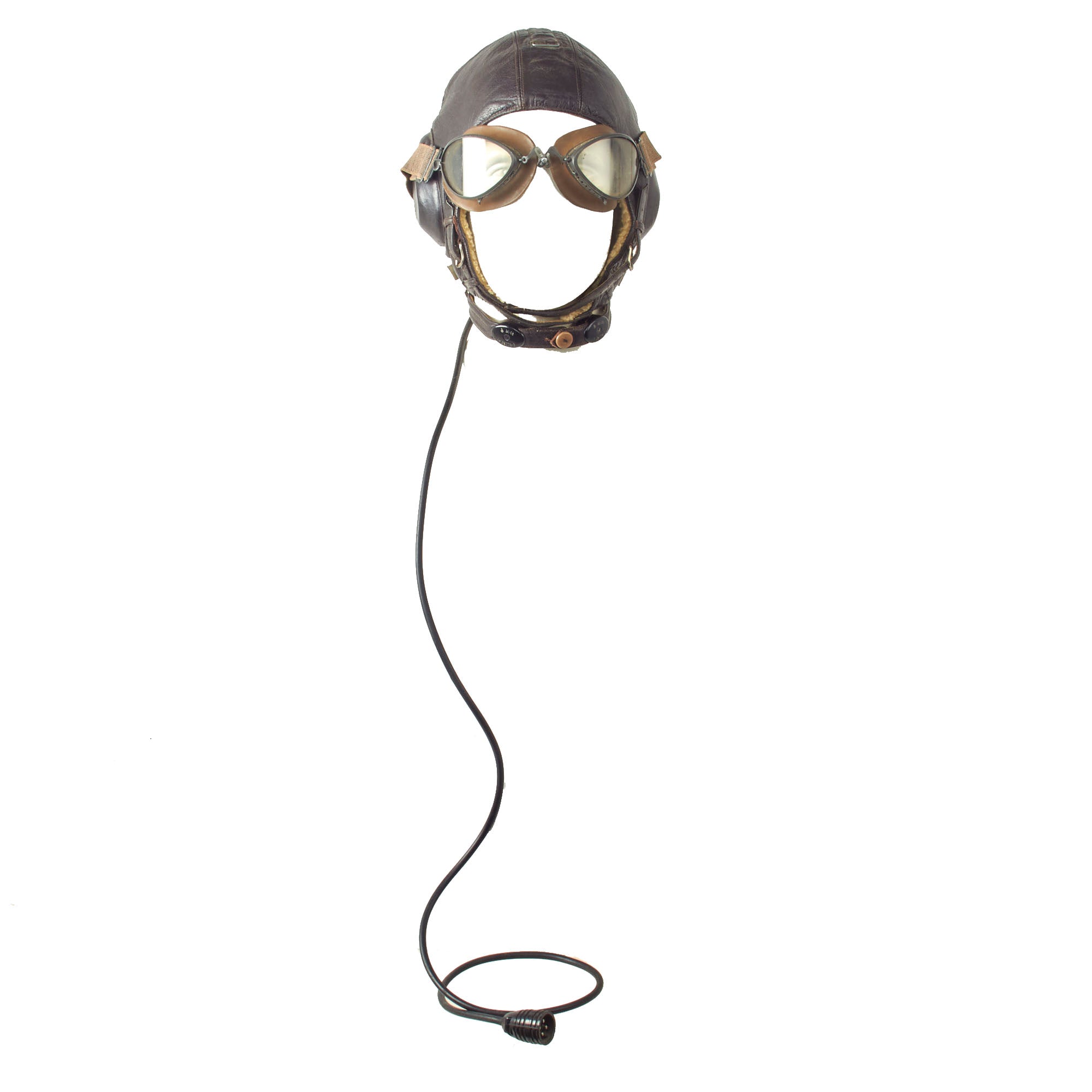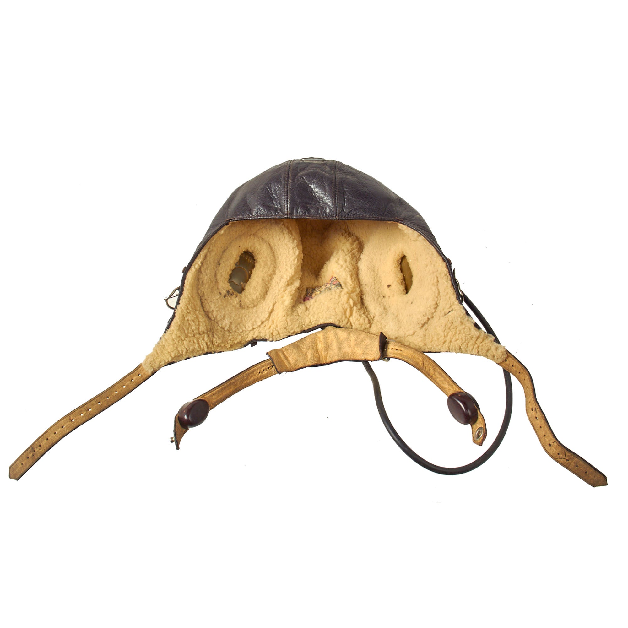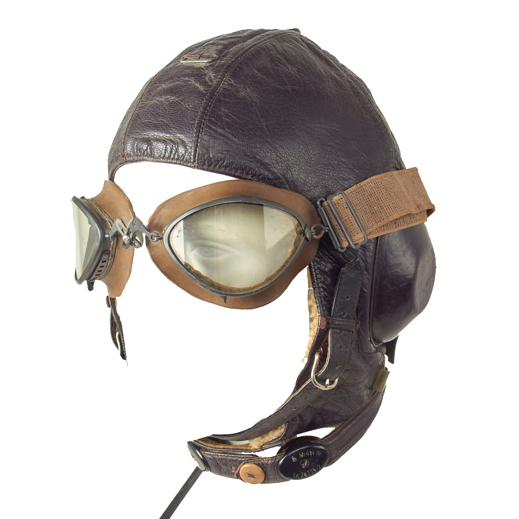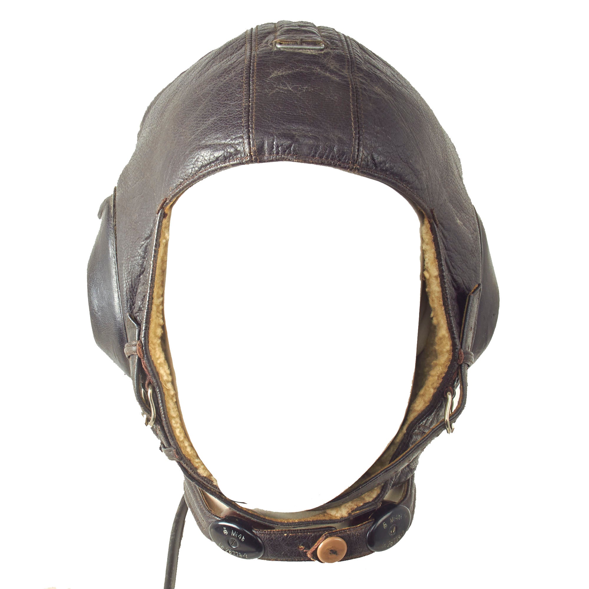 A dark brown leather flying helmet lined with sheepskin or rabbit fur and made from the same basic pattern as the LKp W-100 but with new Siemens communications and improved insulation for better sound transmission. The major visible difference between this helmet and its predecessor was the design of the earphone housings and throat microphone straps. Instead of metal or plastic domes, the earphones were housed in hard rubber cups covered with dark brown leather which had a more streamlined appearance. The leather outer covering was designed with a recess at the top which helped secure the goggle straps in place. Sound quality was further enhanced by the installation of a translucent plastic membrane inside the helmet between the cushioned fleece lining and the earphone speaker. This served the dual function of filtering excess noise and keeping dust out of the sensitive electronics. The housing for the throat microphones on the LKp W-101 was also improved. Two straps containing the microphone contacts were linked by an inverted “T” shaped leather envelope at the nape of the helmet. This housing also served as the junction between the helmet’s internal wiring and the long cord and plug-in connector. The throat straps were adjustable on both sides by means of two small buckles, and once the correct sizing was achieved, could be quickly joined together at the front of the throat by one or two snap fasteners. Later examples of this helmet have been found with a friction release attachment for adjusting the tension of the throat microphones, although this is more commonly seen on the LKpN mesh flying helmets. The model LKp W-101 was produced with hardware for the three-strap oxygen mask, but many were modified to accept the two-strap mask by the addition of studs on either side of the helmet. Luftwaffe LKp W101 Flying Helmet.