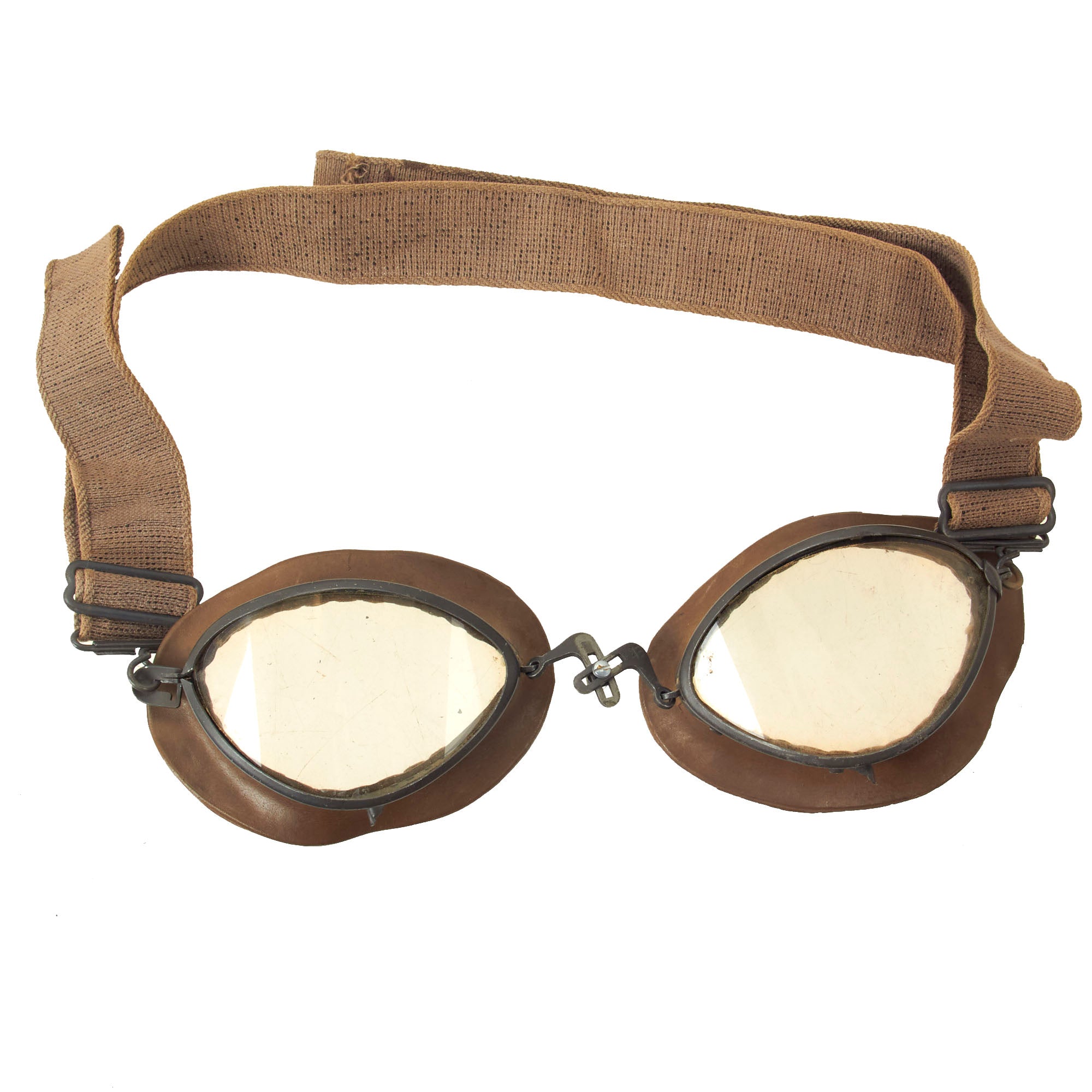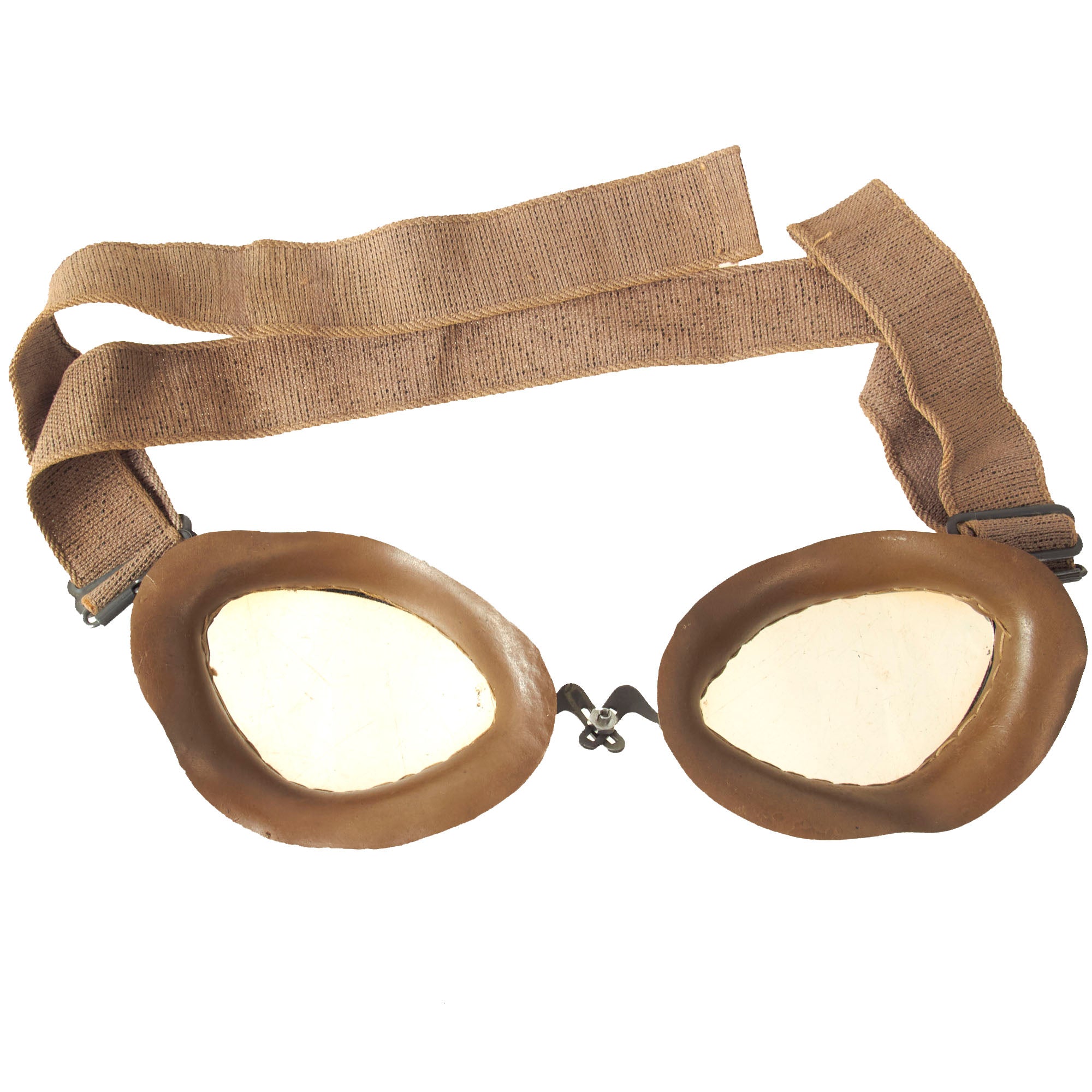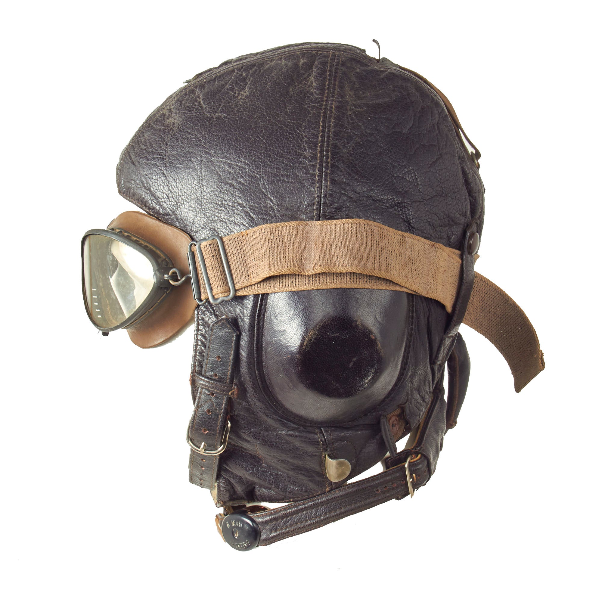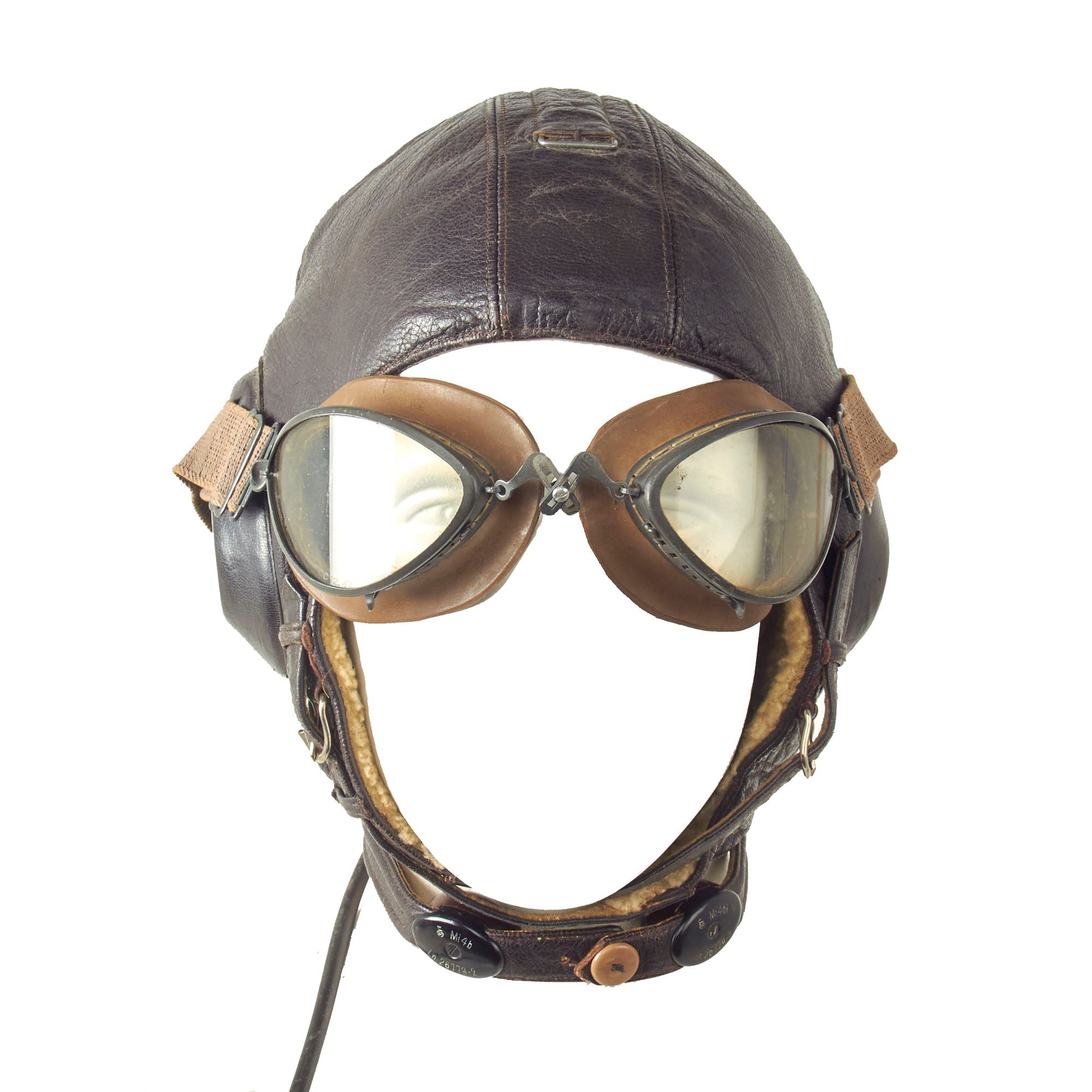 A dark brown leather flying helmet lined with sheepskin or rabbit fur and made from the same basic pattern as the LKp W-100 but with new Siemens communications and improved insulation for better sound transmission. The major visible difference between this helmet and its predecessor was the design of the earphone housings and throat microphone straps. Instead of metal or plastic domes, the earphones were housed in hard rubber cups covered with dark brown leather which had a more streamlined appearance. The leather outer covering was designed with a recess at the top which helped secure the goggle straps in place. Sound quality was further enhanced by the installation of a translucent plastic membrane inside the helmet between the cushioned fleece lining and the earphone speaker. This served the dual function of filtering excess noise and keeping dust out of the sensitive electronics. The housing for the throat microphones on the LKp W-101 was also improved. Two straps containing the microphone contacts were linked by an inverted “T” shaped leather envelope at the nape of the helmet. This housing also served as the junction between the helmet’s internal wiring and the long cord and plug-in connector. The throat straps were adjustable on both sides by means of two small buckles, and once the correct sizing was achieved, could be quickly joined together at the front of the throat by one or two snap fasteners. Later examples of this helmet have been found with a friction release attachment for adjusting the tension of the throat microphones, although this is more commonly seen on the LKpN mesh flying helmets. The model LKp W-101 was produced with hardware for the three-strap oxygen mask, but many were modified to accept the two-strap mask by the addition of studs on either side of the helmet. Luftwaffe LKp W101 Flying Helmet.