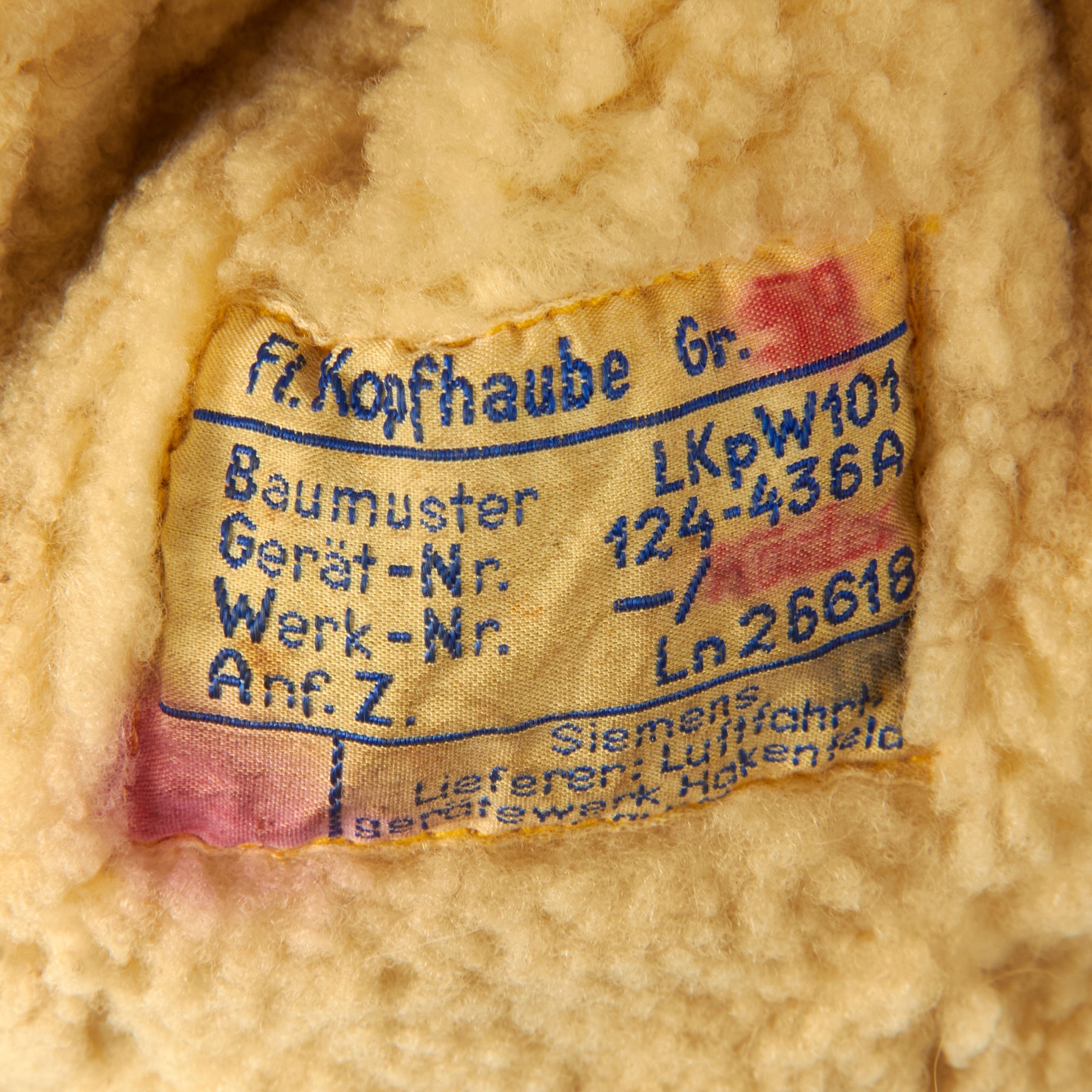 Original Item: Only One Available. This is an excellent condition German WWII Luftwaffe Flieger Kopfhaube (Aviator Helmet/Hood), model LKp W101. This is a helmet for winter, as indicated by the W. It is made of leather, with a very nice shearling lining, which has a chamois backed forehead area and neck straps. It even comes with a fully correct and intact communication setup, with attached throat microphones, installed headphones, and a bakelite 4 pin connector on the back.