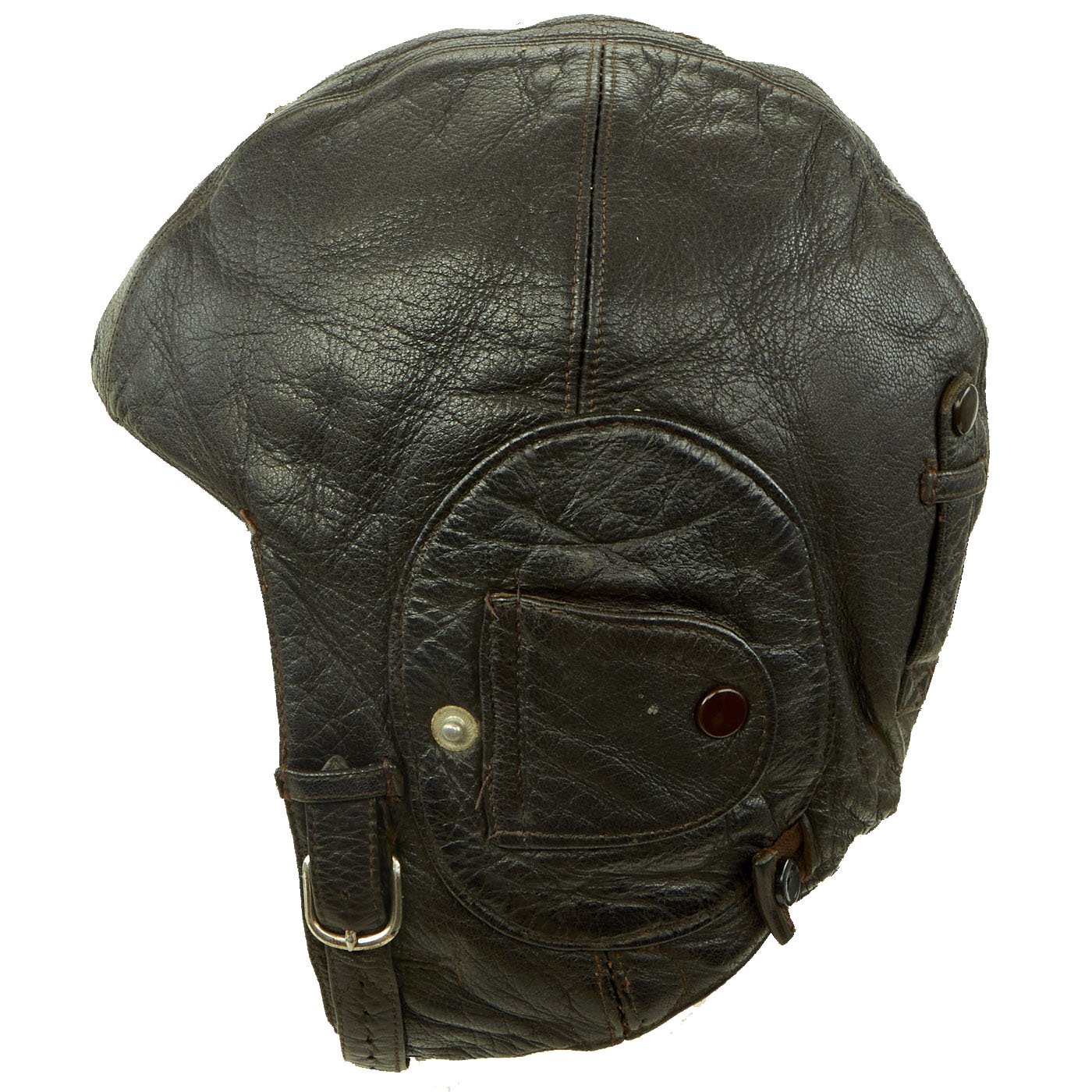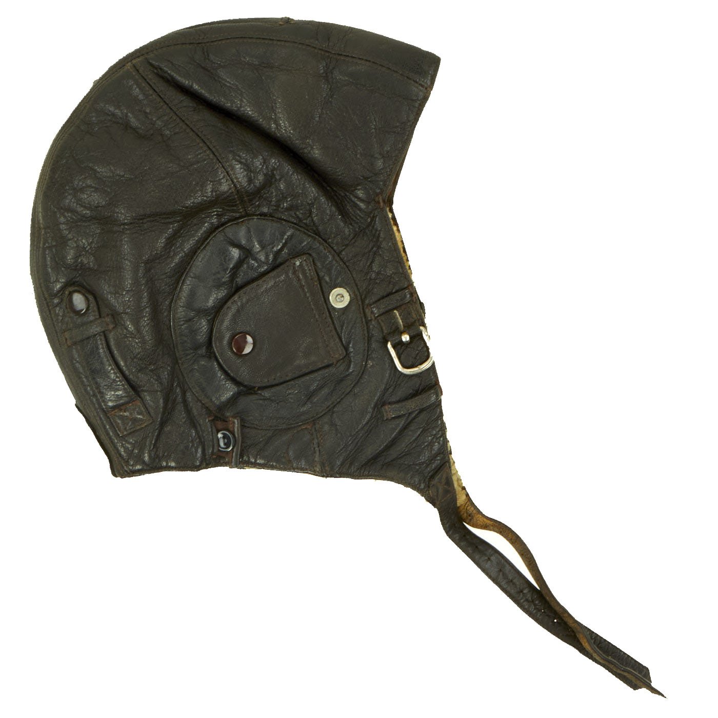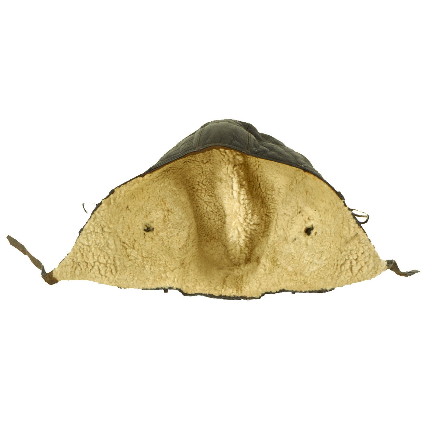 A dark brown leather flying helmet lined with sheepskin or rabbit fur and made from the same basic pattern as the LKp W-100 but with new Siemens communications and improved insulation for better sound transmission. The major visible difference between this helmet and its predecessor was the design of the earphone housings and throat microphone straps. Instead of metal or plastic domes, the earphones were housed in hard rubber cups covered with dark brown leather which had a more streamlined appearance. The leather outer covering was designed with a recess at the top which helped secure the goggle straps in place. Sound quality was further enhanced by the installation of a translucent plastic membrane inside the helmet between the cushioned fleece lining and the earphone speaker. This served the dual function of filtering excess noise and keeping dust out of the sensitive electronics. The housing for the throat microphones on the LKp W-101 was also improved. Two straps containing the microphone contacts were linked by an inverted “T” shaped leather envelope at the nape of the helmet. This housing also served as the junction between the helmet’s internal wiring and the long cord and plug-in connector. The throat straps were adjustable on both sides by means of two small buckles, and once the correct sizing was achieved, could be quickly joined together at the front of the throat by one or two snap fasteners. Later examples of this helmet have been found with a friction release attachment for adjusting the tension of the throat microphones, although this is more commonly seen on the LKpN mesh flying helmets. The model LKp W-101 was produced with hardware for the three-strap oxygen mask, but many were modified to accept the two-strap mask by the addition of studs on either side of the helmet. Luftwaffe LKp W101 Flying Helmet.