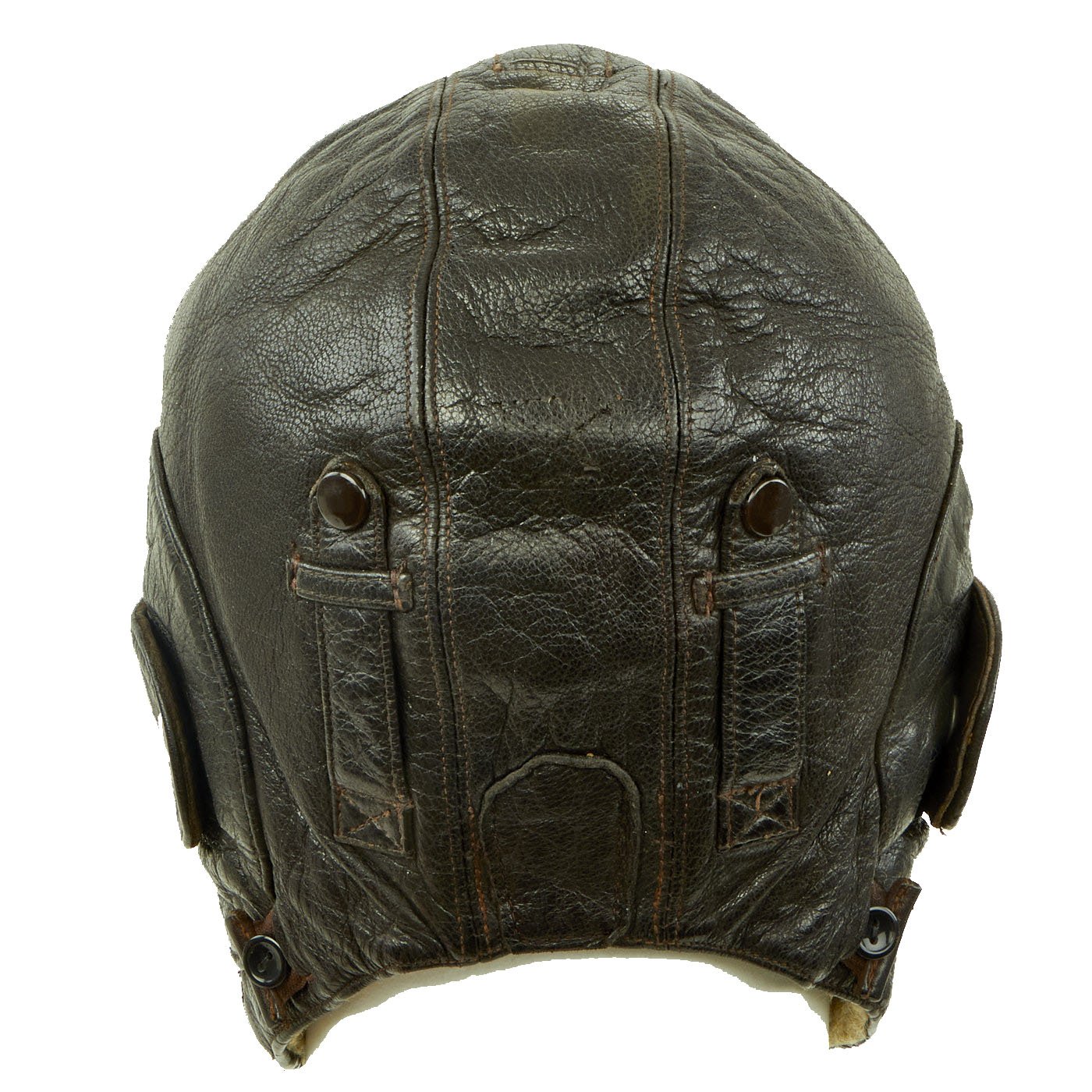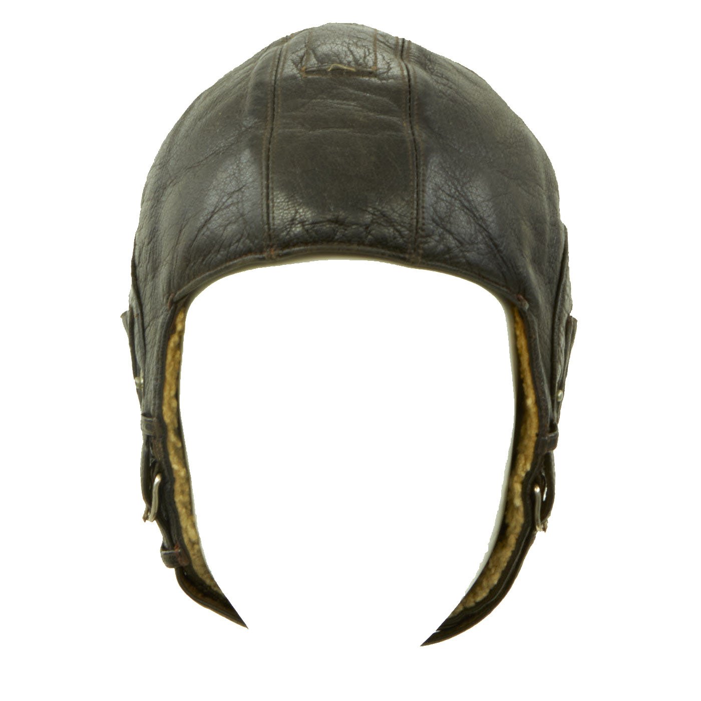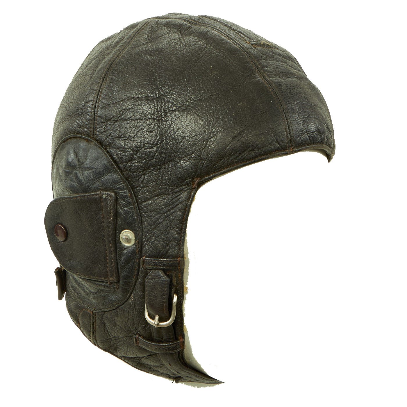 A dark brown leather flying helmet lined with sheepskin or rabbit fur and made from the same basic pattern as the LKp W-100 but with new Siemens communications and improved insulation for better sound transmission. The major visible difference between this helmet and its predecessor was the design of the earphone housings and throat microphone straps. Instead of metal or plastic domes, the earphones were housed in hard rubber cups covered with dark brown leather which had a more streamlined appearance. The leather outer covering was designed with a recess at the top which helped secure the goggle straps in place. Sound quality was further enhanced by the installation of a translucent plastic membrane inside the helmet between the cushioned fleece lining and the earphone speaker. This served the dual function of filtering excess noise and keeping dust out of the sensitive electronics. The housing for the throat microphones on the LKp W-101 was also improved. Two straps containing the microphone contacts were linked by an inverted “T” shaped leather envelope at the nape of the helmet. This housing also served as the junction between the helmet’s internal wiring and the long cord and plug-in connector. The throat straps were adjustable on both sides by means of two small buckles, and once the correct sizing was achieved, could be quickly joined together at the front of the throat by one or two snap fasteners. Later examples of this helmet have been found with a friction release attachment for adjusting the tension of the throat microphones, although this is more commonly seen on the LKpN mesh flying helmets. The model LKp W-101 was produced with hardware for the three-strap oxygen mask, but many were modified to accept the two-strap mask by the addition of studs on either side of the helmet. Luftwaffe LKp W101 Flying Helmet.
